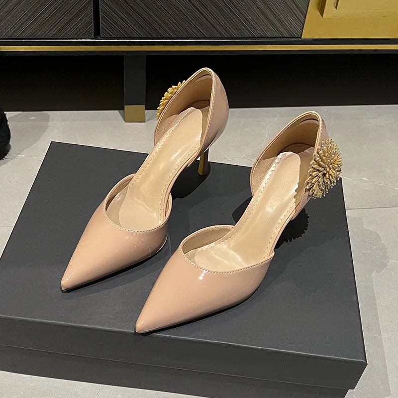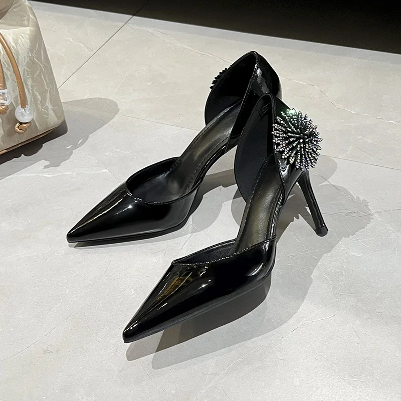 2026 Summer New Pointed Low Mouth Crystal Flower Hollow Side Empty Fashion Patent Leather Stiletto Heel High Heels Shoes