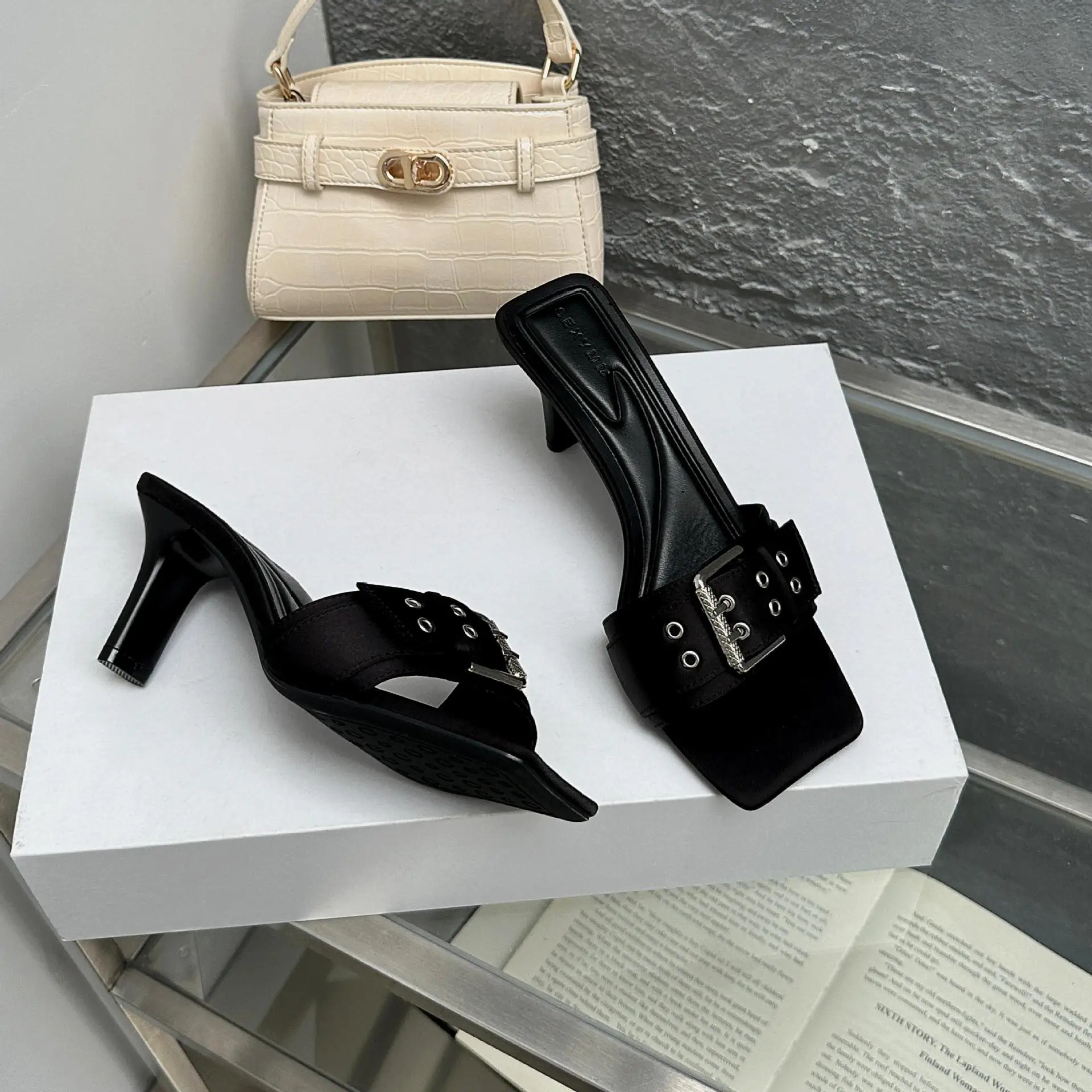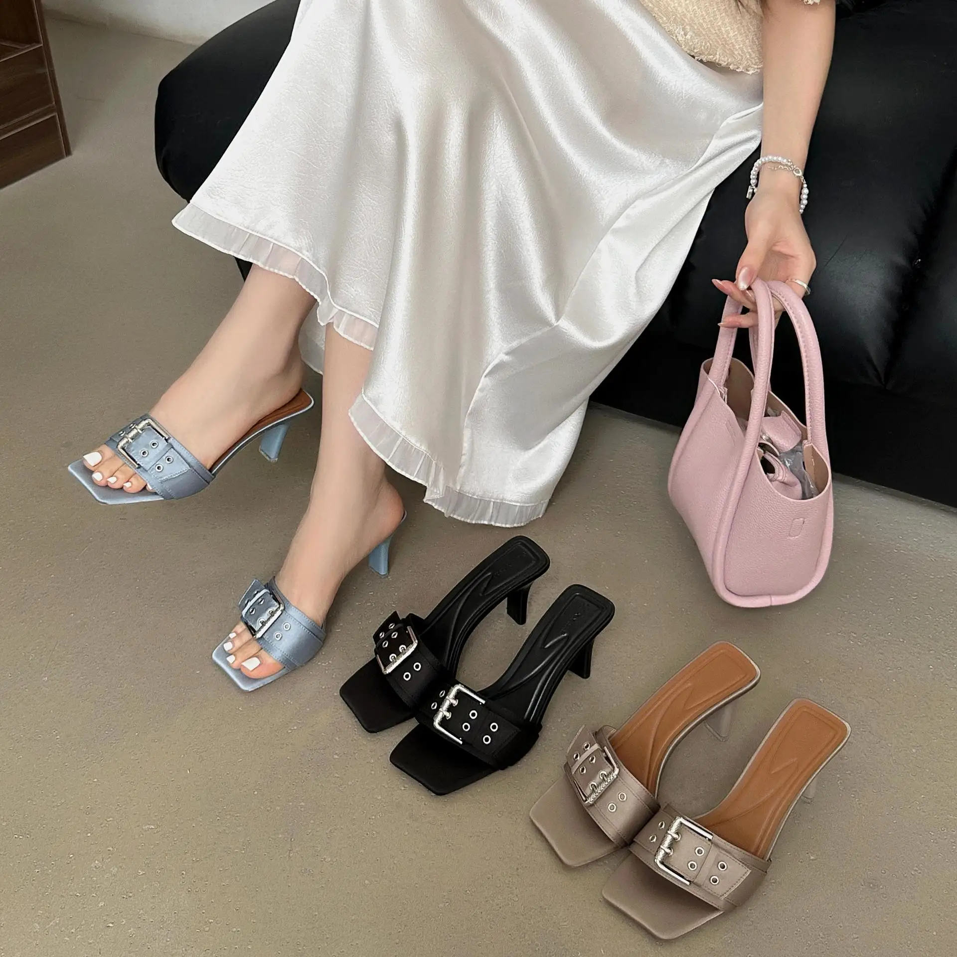 French Style Thin - Heeled slippers Wearing Temperament square - Toed High - Heeled Cool slippers