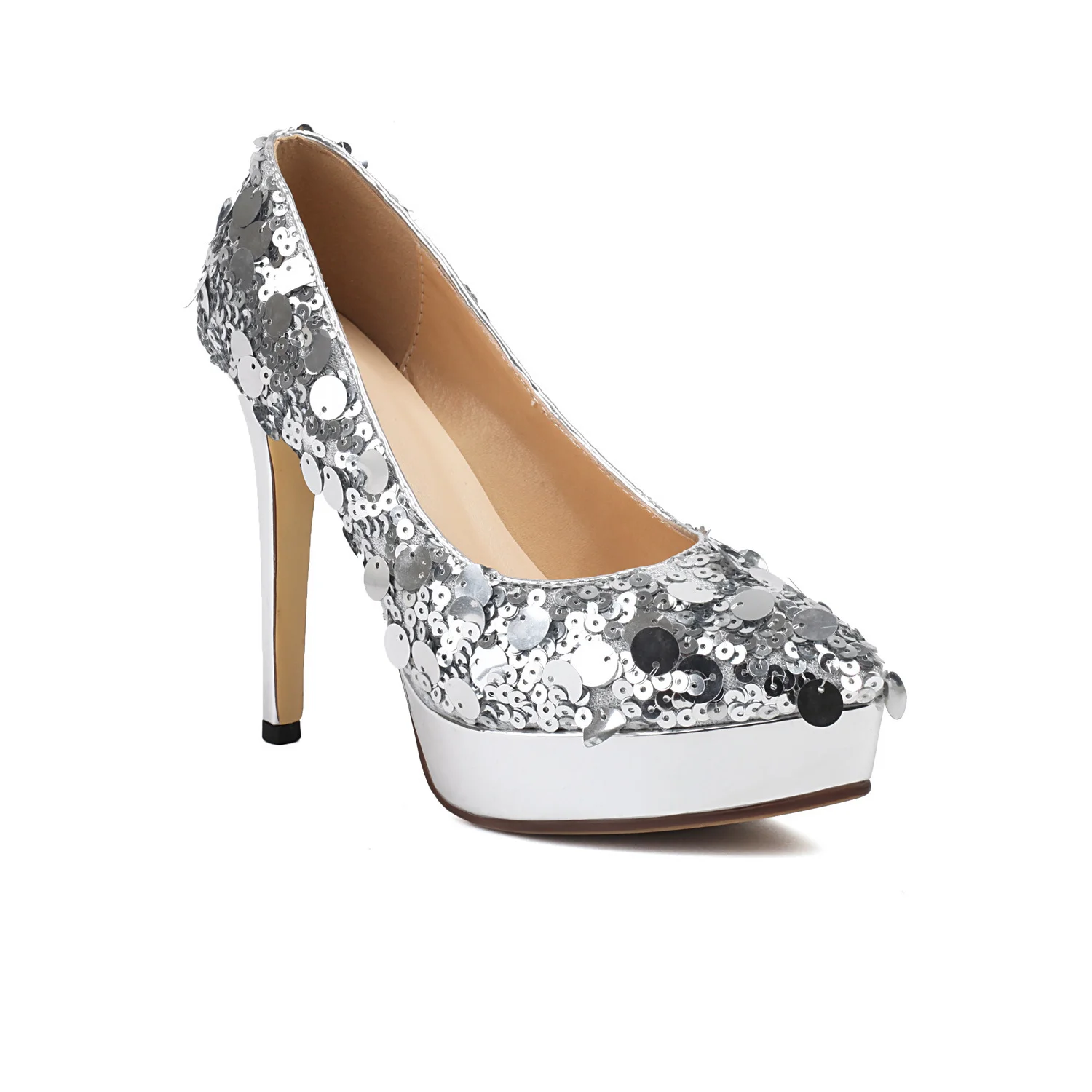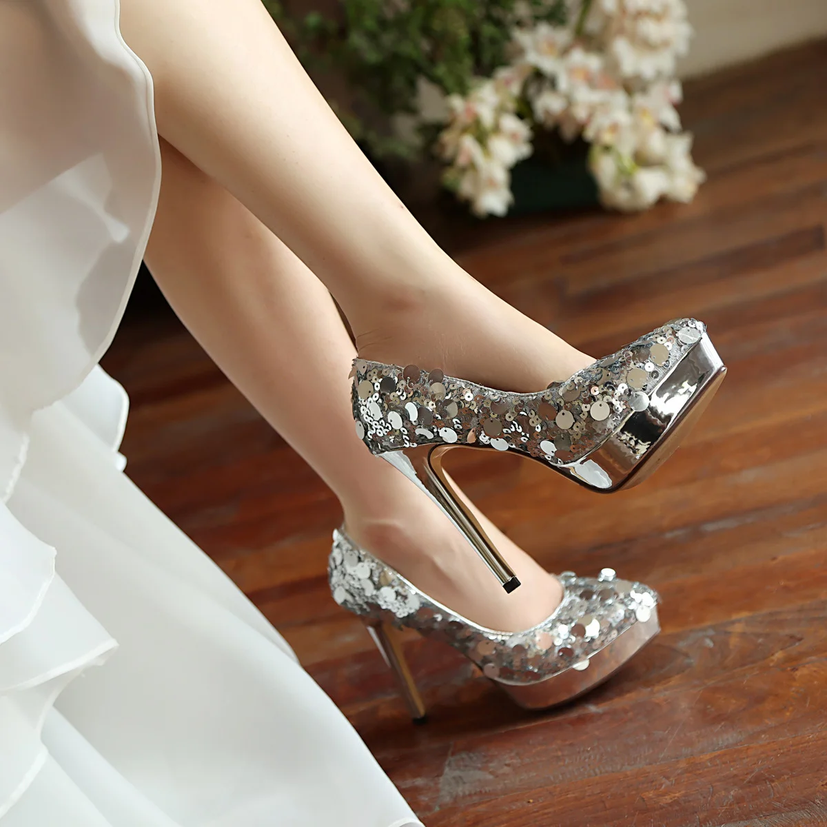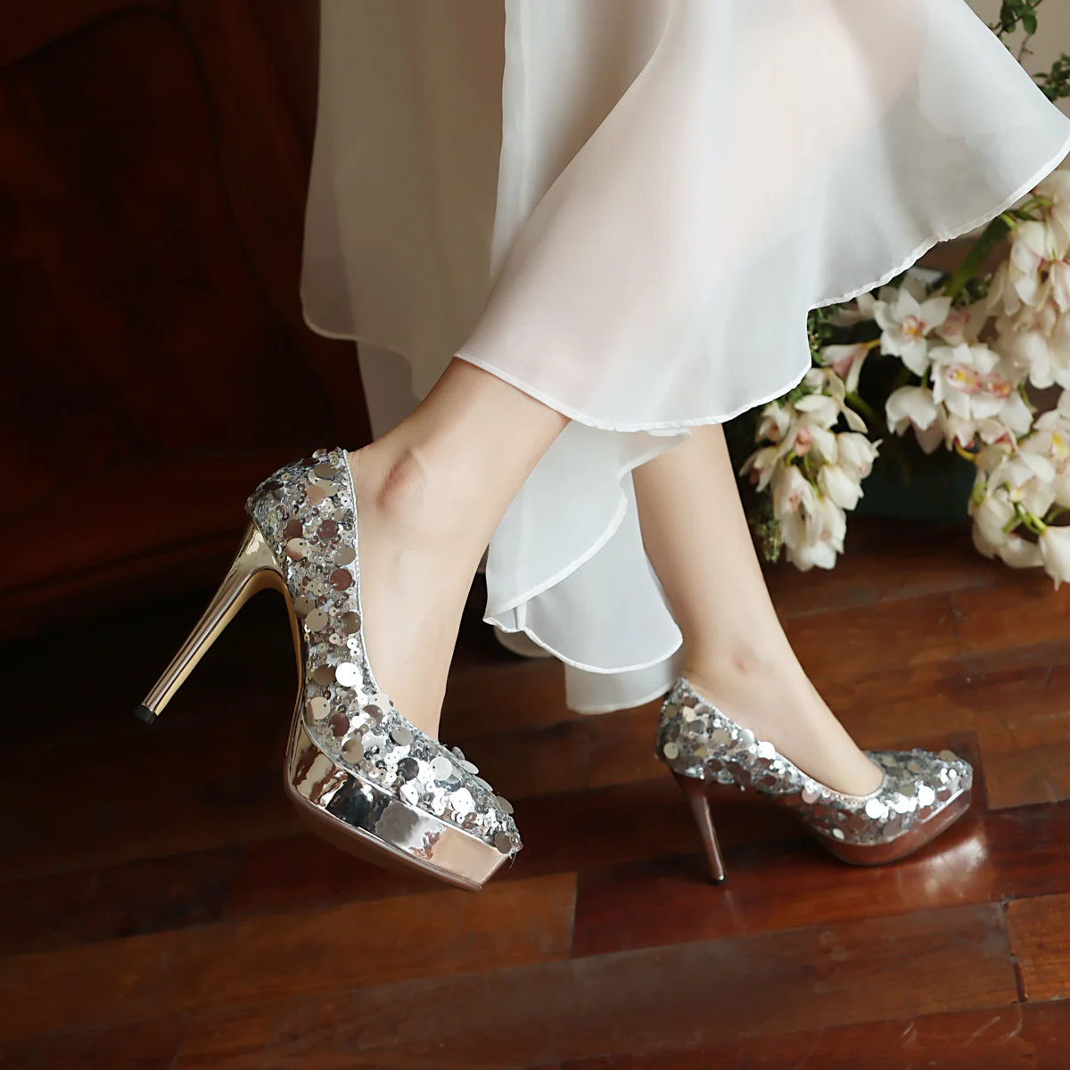 European American Style Bridal Slip-On Thin Heels Shoes Anti-Slippery Breathable Wedding Shoes Show Stage Sequined High Heels