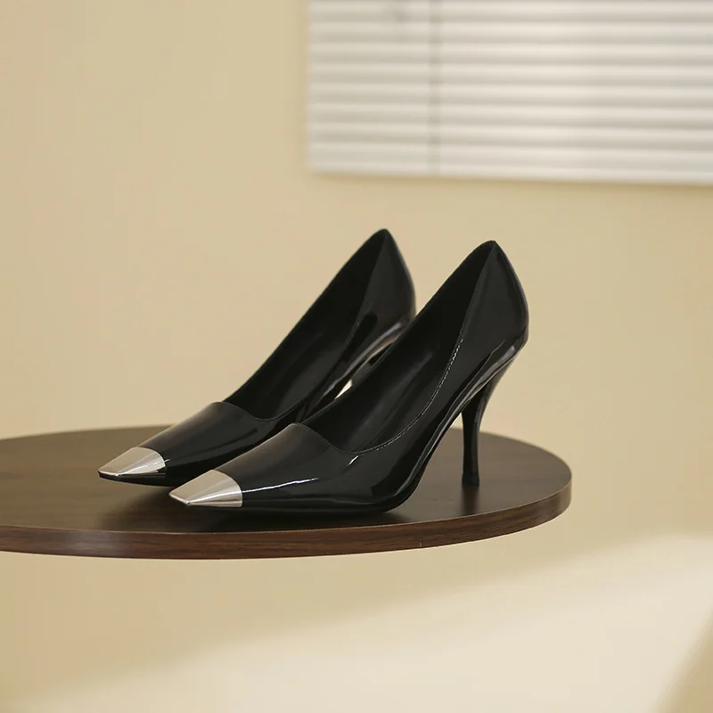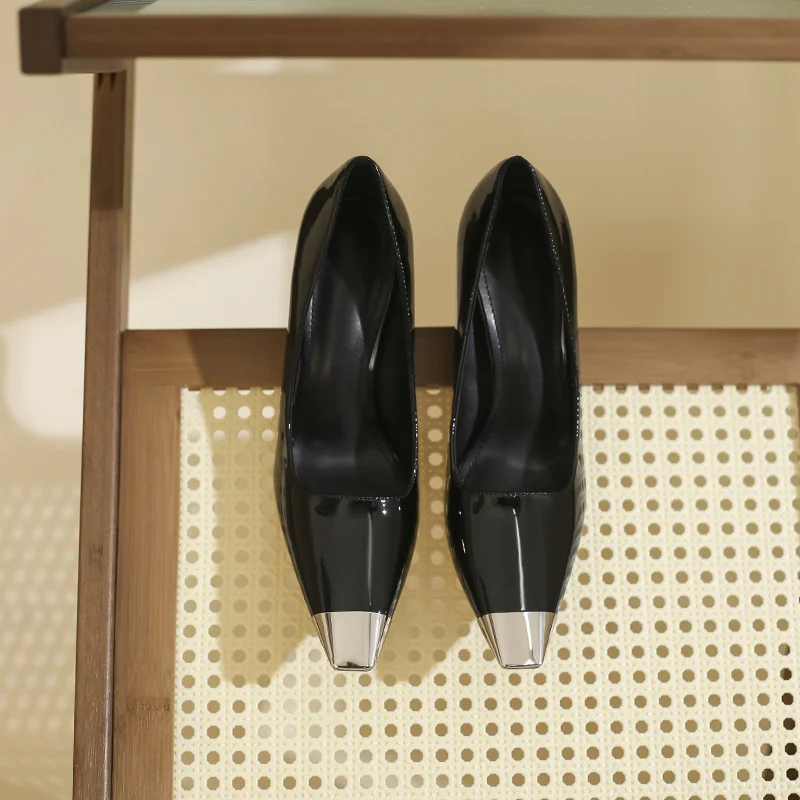 New Metal square Head Thin Documentary Shoes Black Patent Leather High Heels for Women
