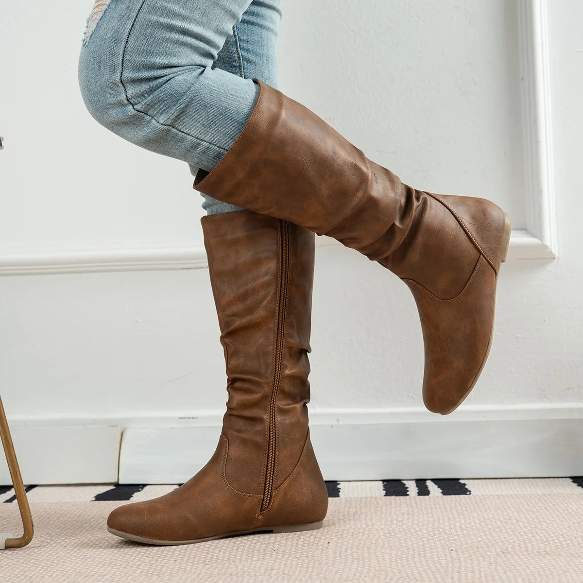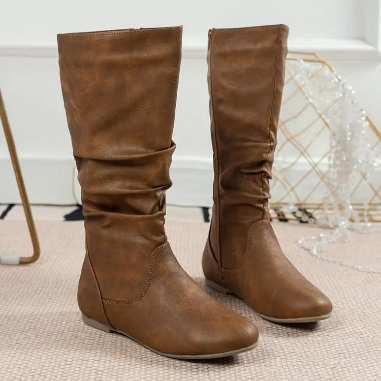 European and American Wind Round Head Large Size Side Zipper High Boots Women Cross-border Retro Thin Leather Boots Knight Boots