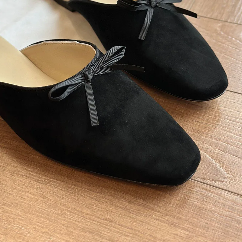 Black Women's Shoes with Bow Decoration Half Drag Casual Temperament Handmade Shoes Luxury Genuine Leather Sole