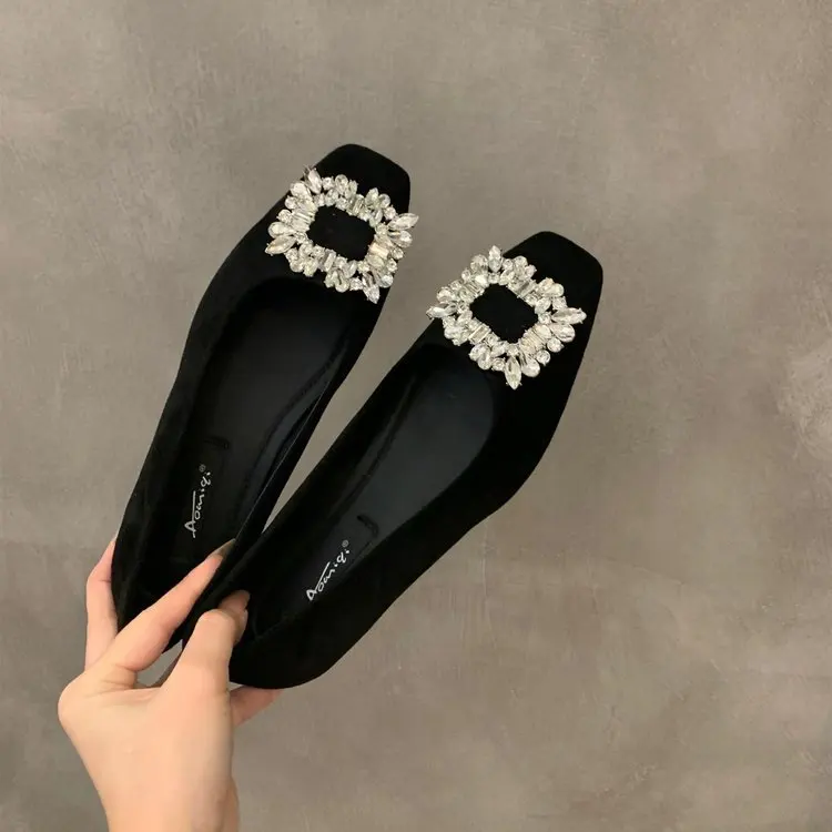 2026 New Style Womens Black Business Flat Shoes Elegant Square Toe Silver Accents Rhinestone Details