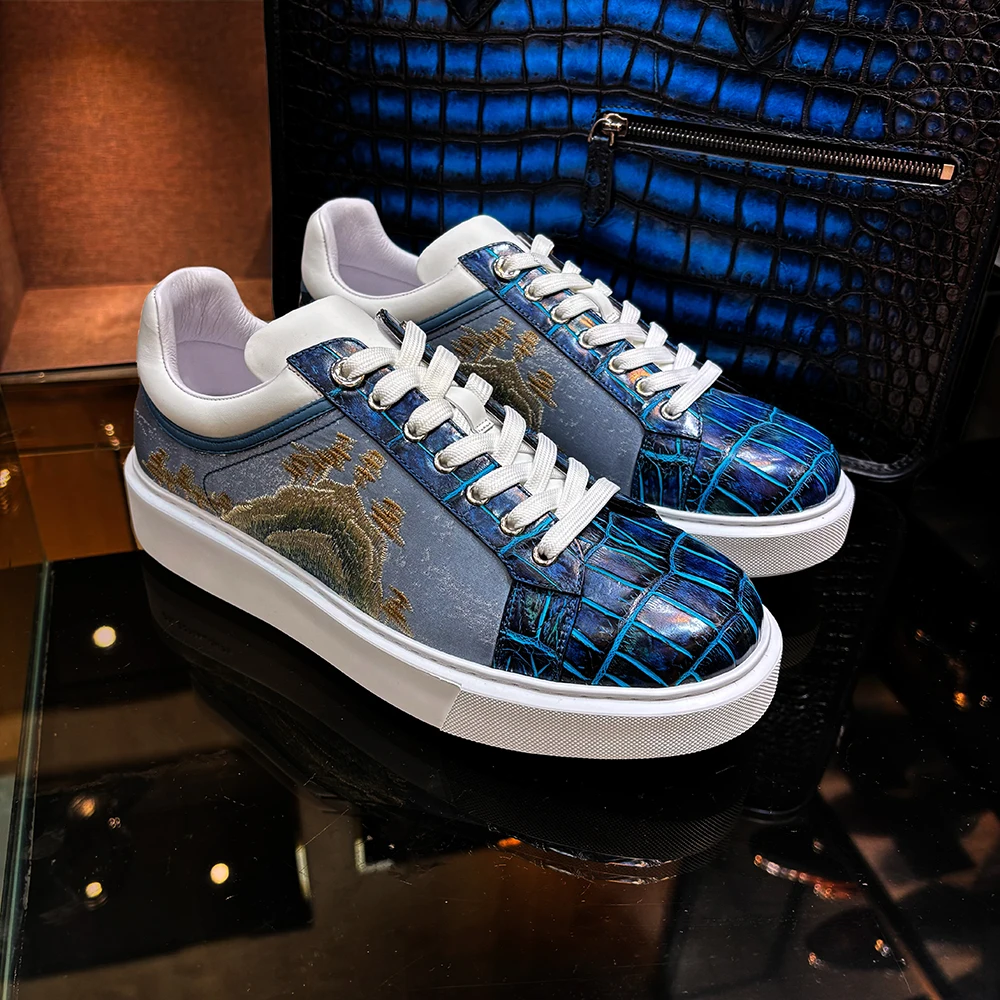 Luxury Handmade Crocodile Leather Designer Men Shoes Skateboard Men's Casual Shoes Embroidery Pattern Walking Style Shoes Men