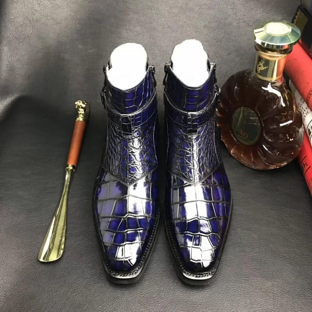 Blue Pure Crocodile Leather Ankle Korean Boots for Men Zip-up Other Trendy Dress Boots Goodyear Luxury Buckle Strap Men's Boots