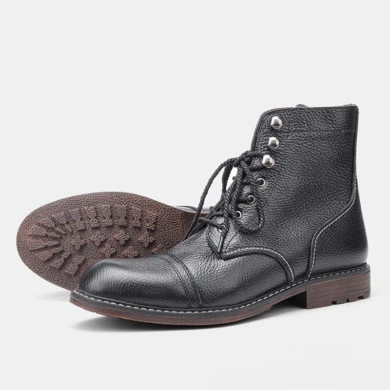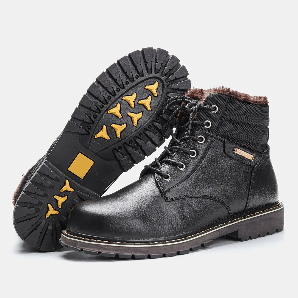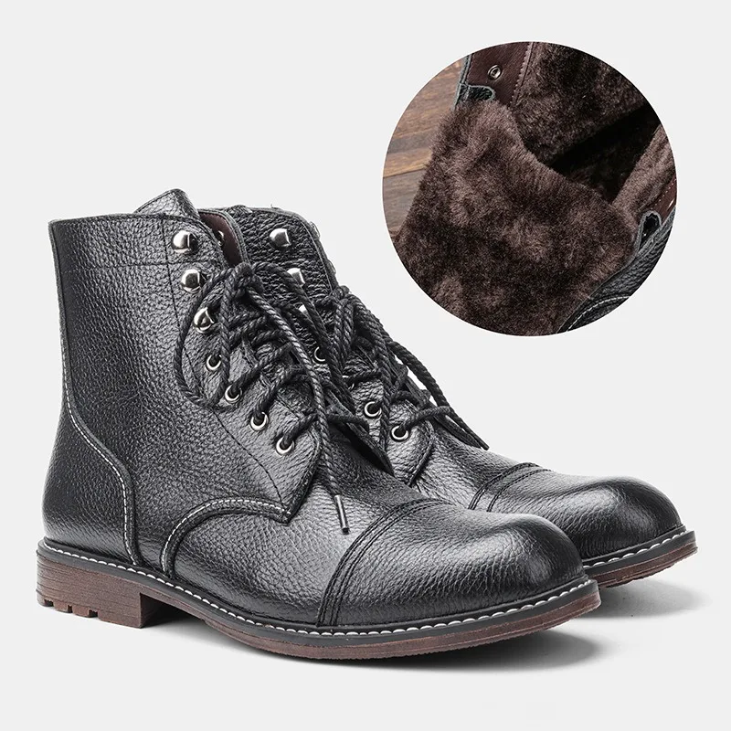 Motorcycle Cowhide Boots Mens Fur Lining Winter Fashion Wool Lining Genuine Leather Boot Zipper Botas Hombre