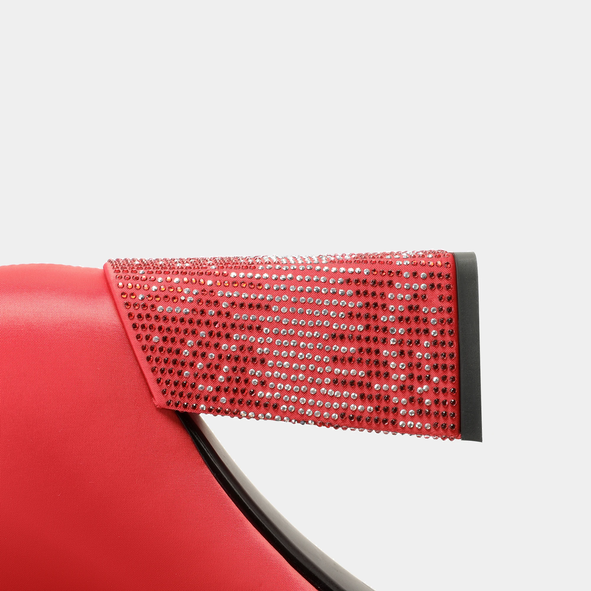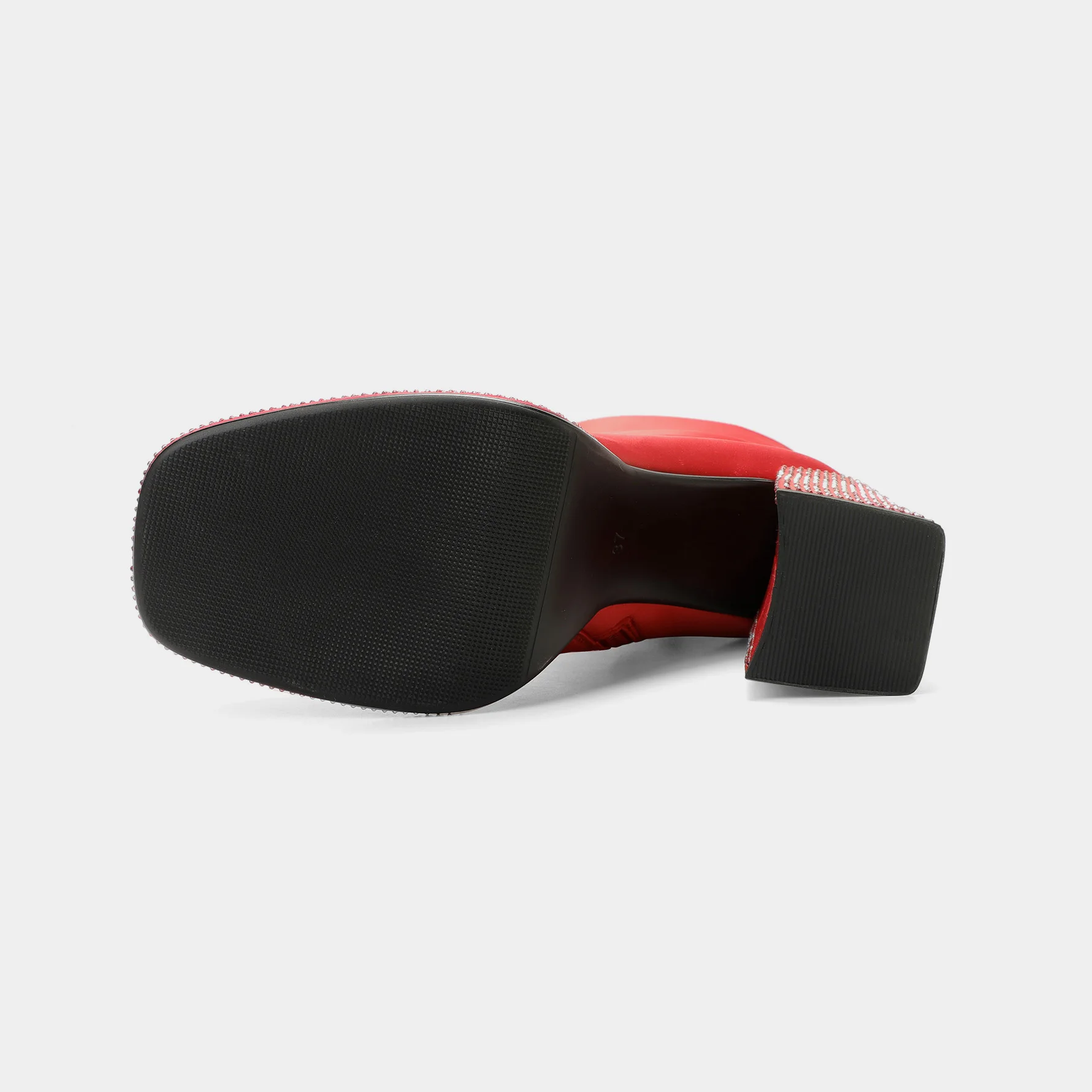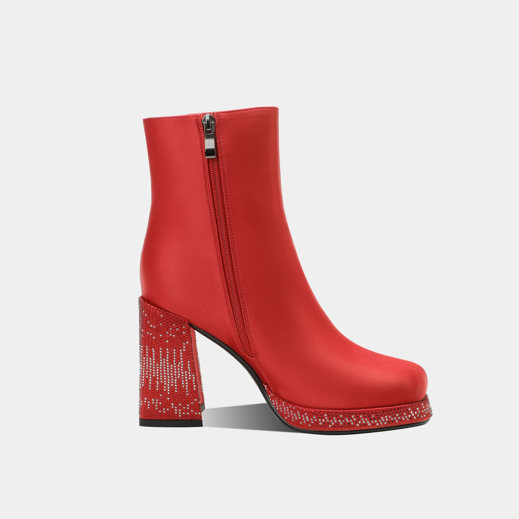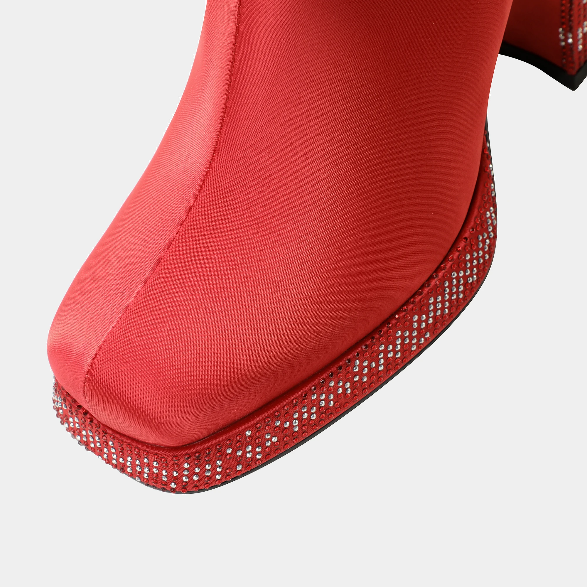 Red Satin Fashion Ankle Boots with Embellished Block Heels and Zip Closure Rhinestone Accentuated Bootie