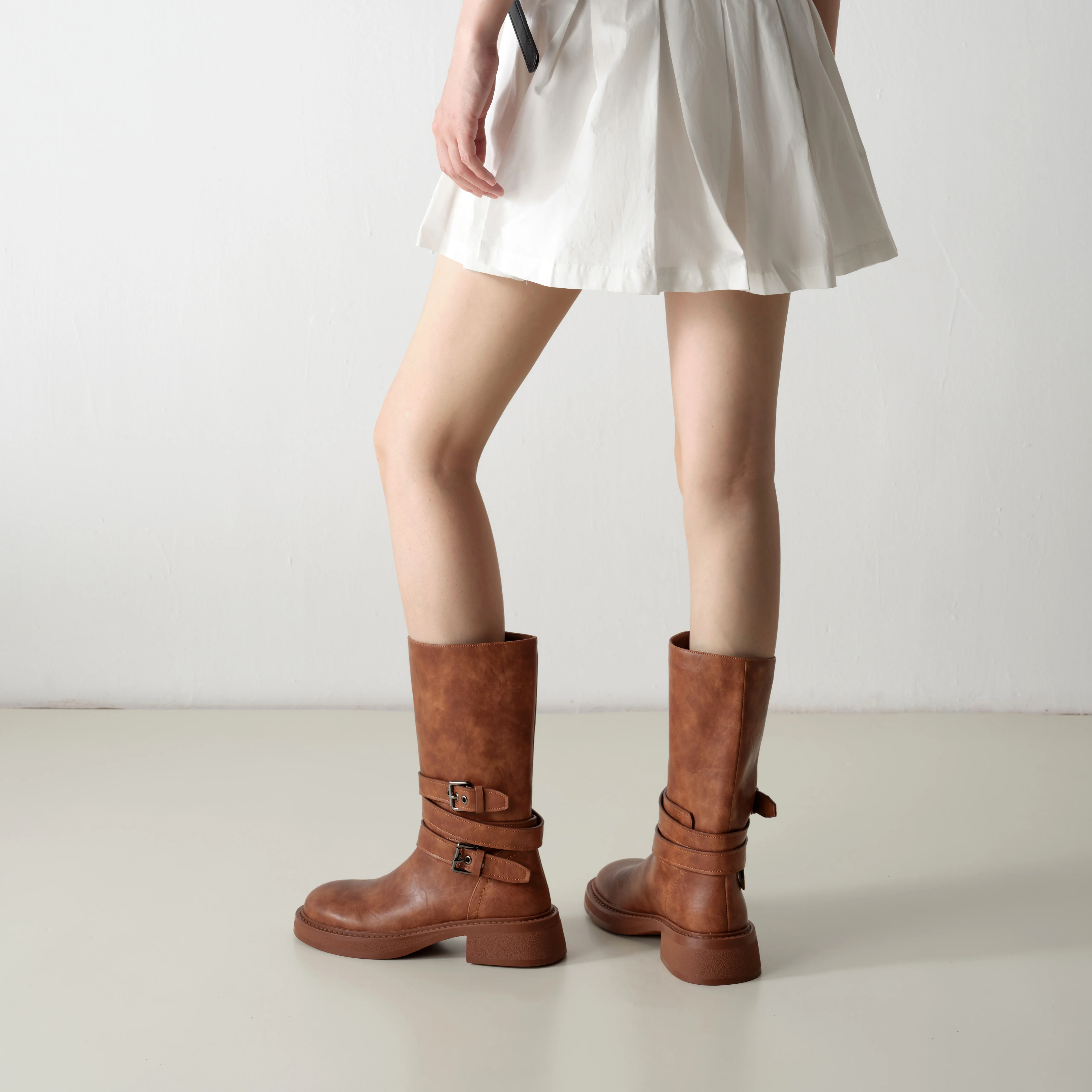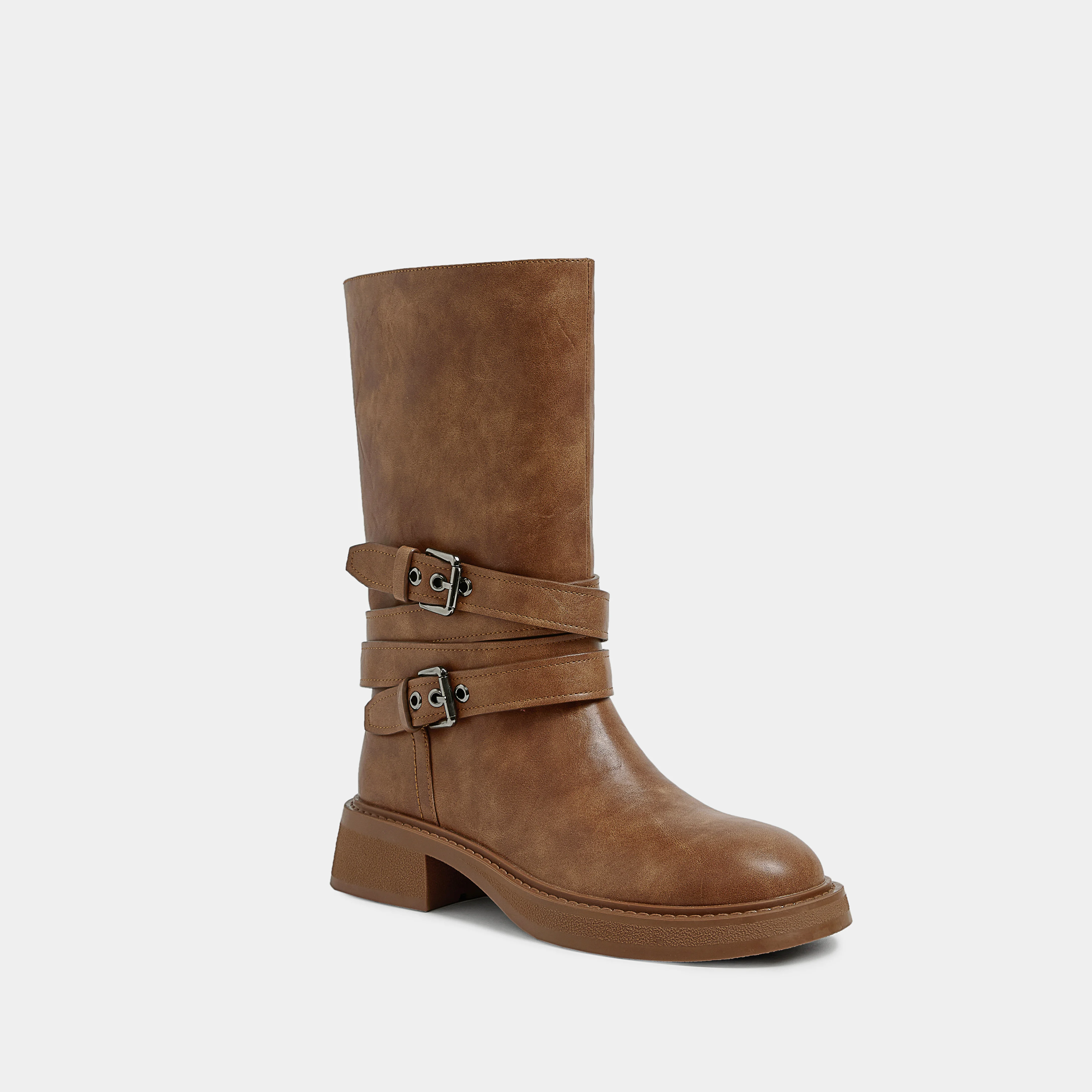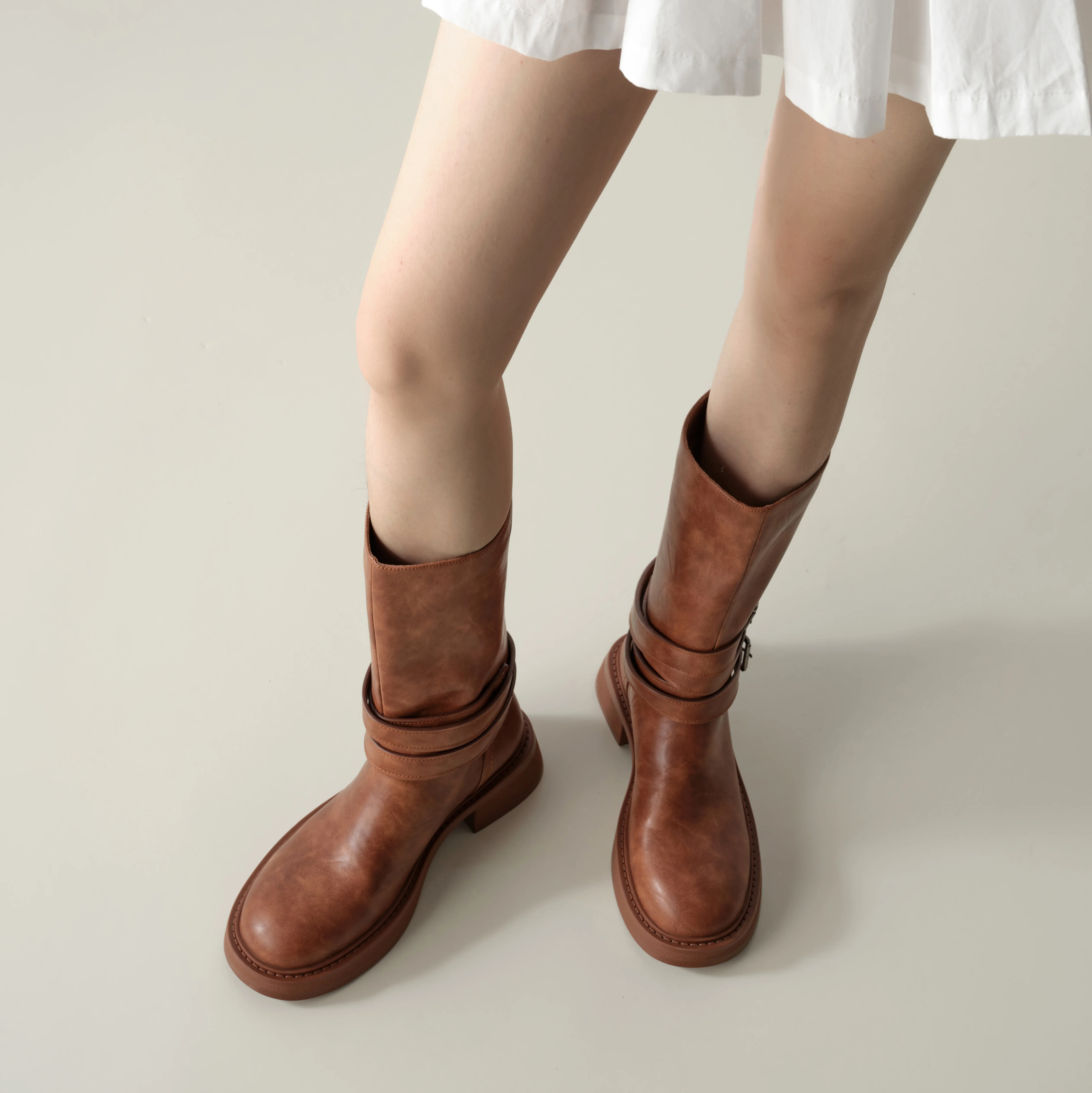 Women's Vintage Mid-Calf Western Cowboy Boots Leather Belt Buckle & Concho Detail Casual Party Wear Slip-On Closure Winter Style