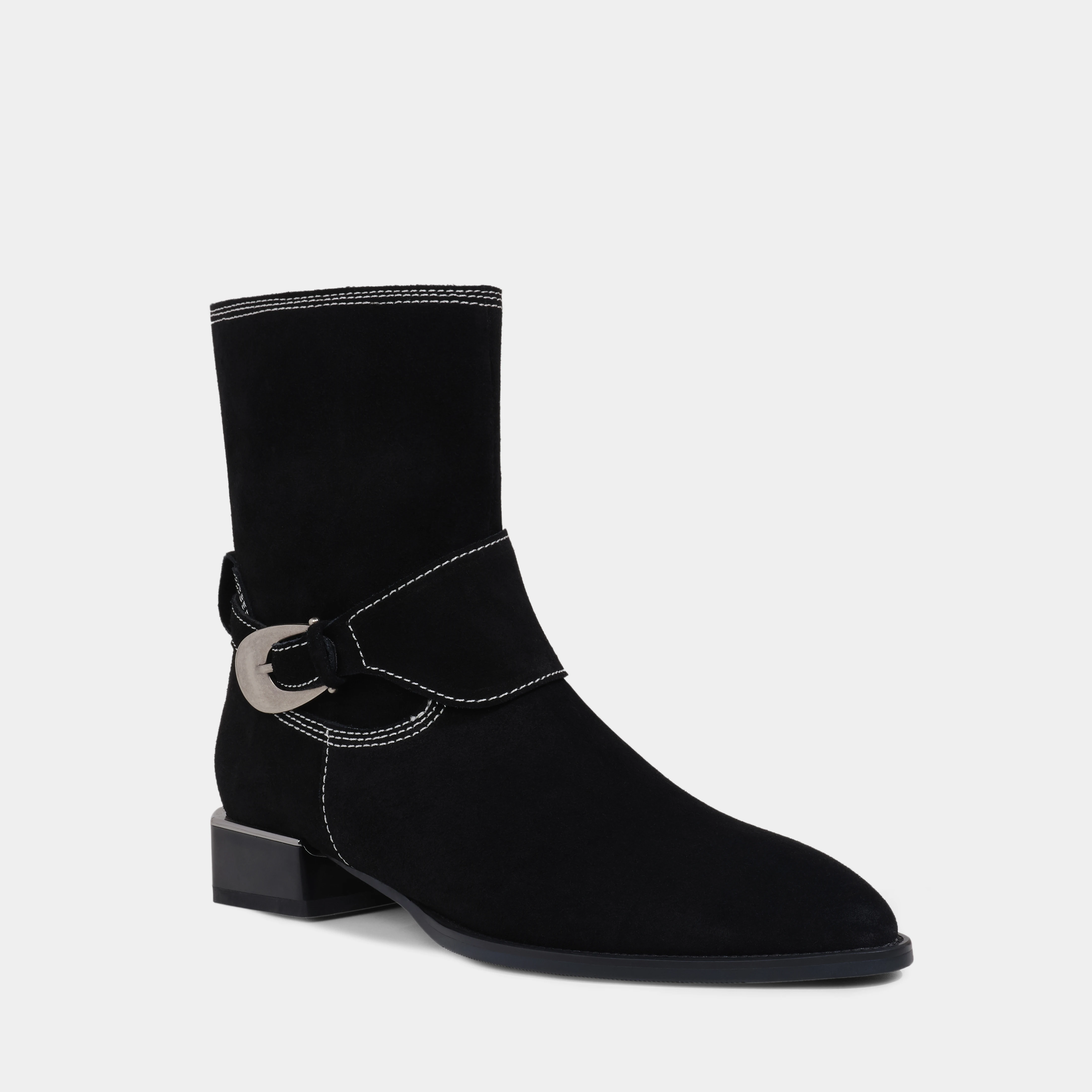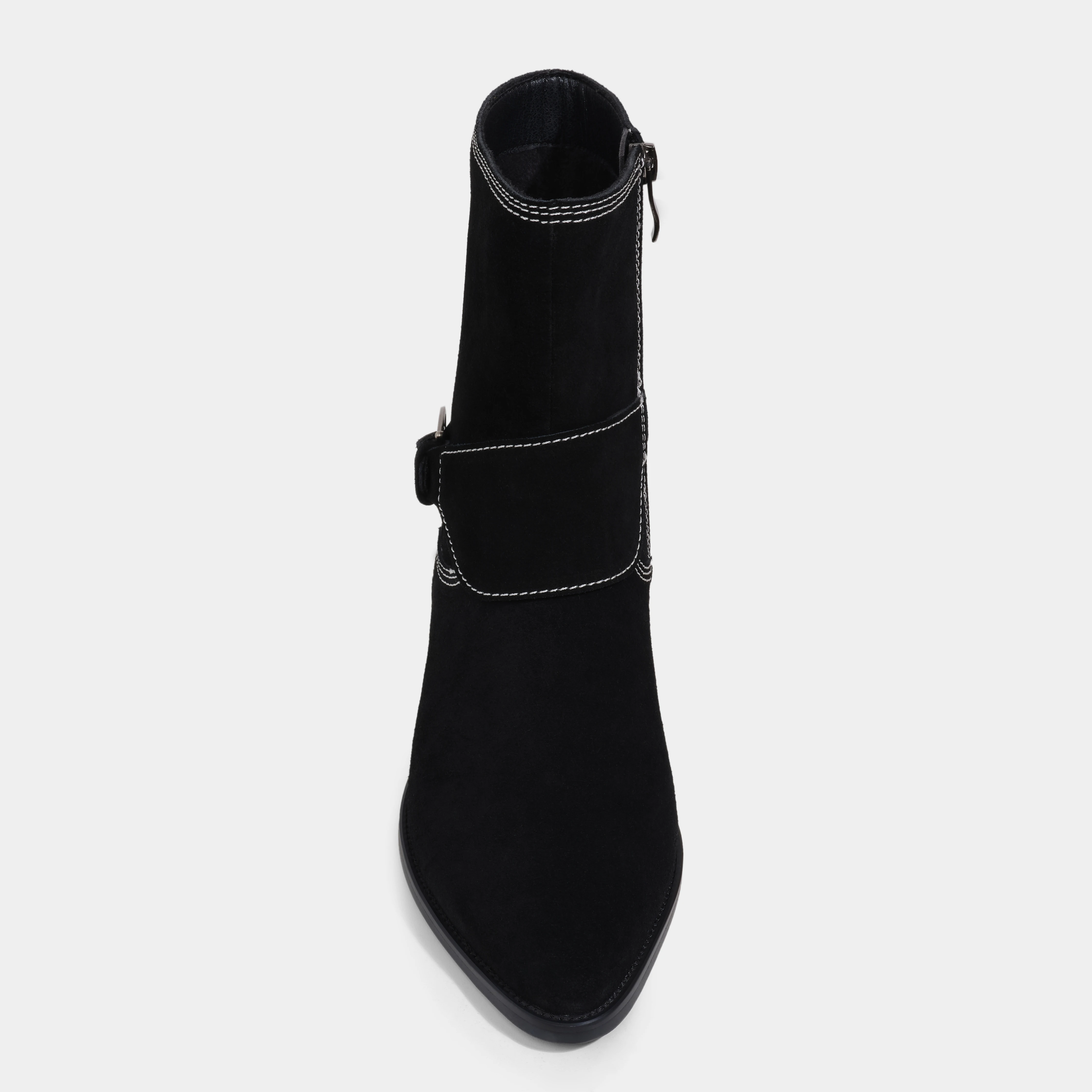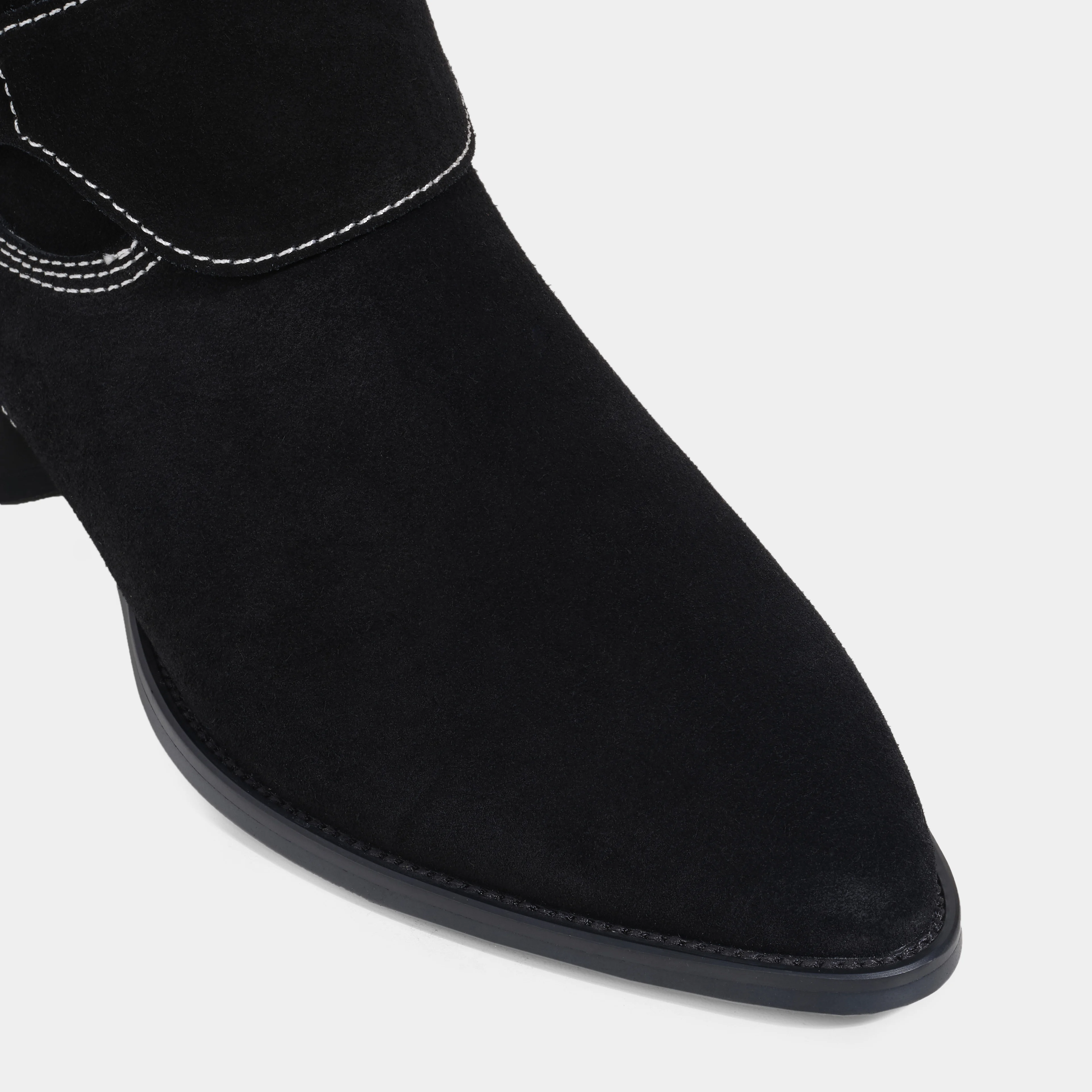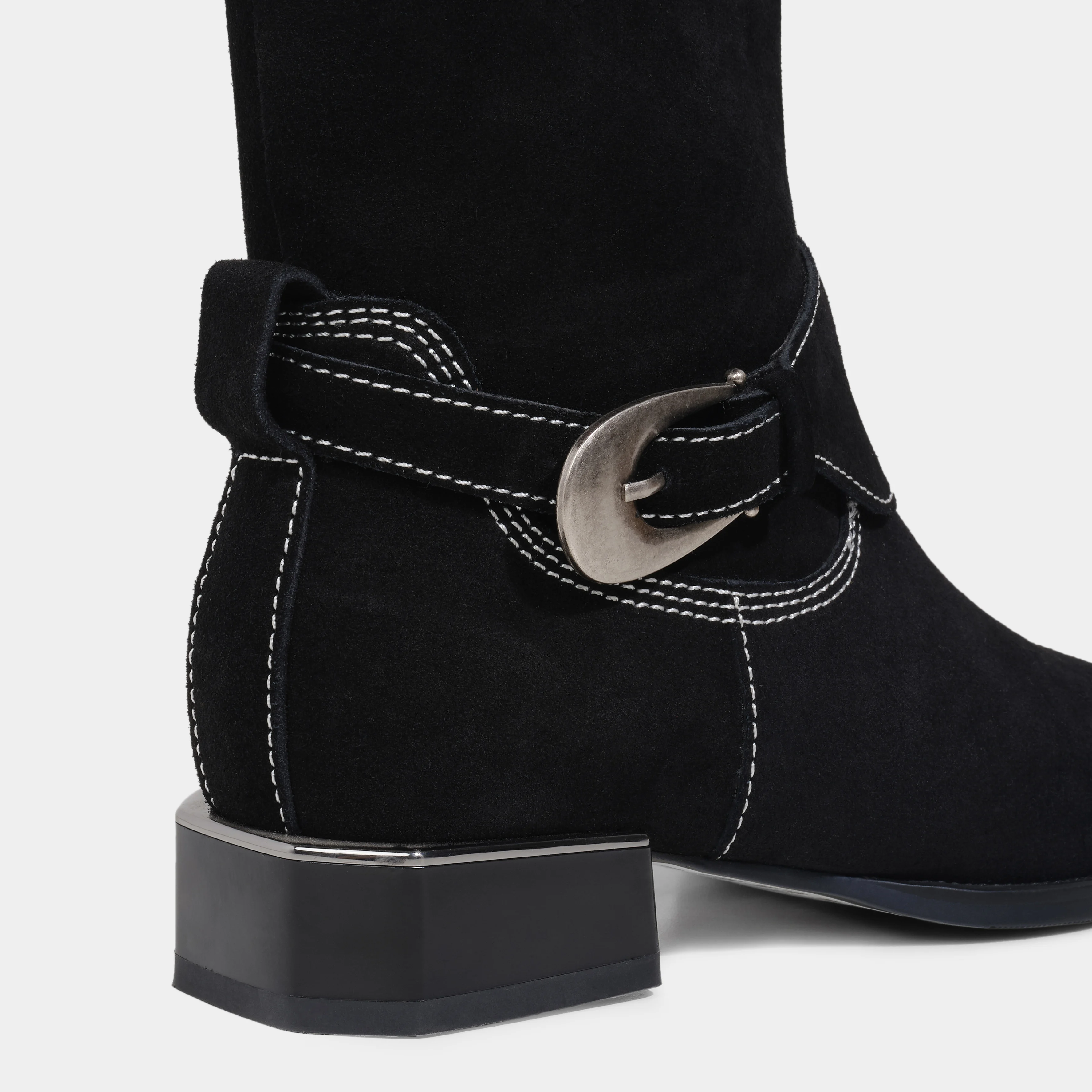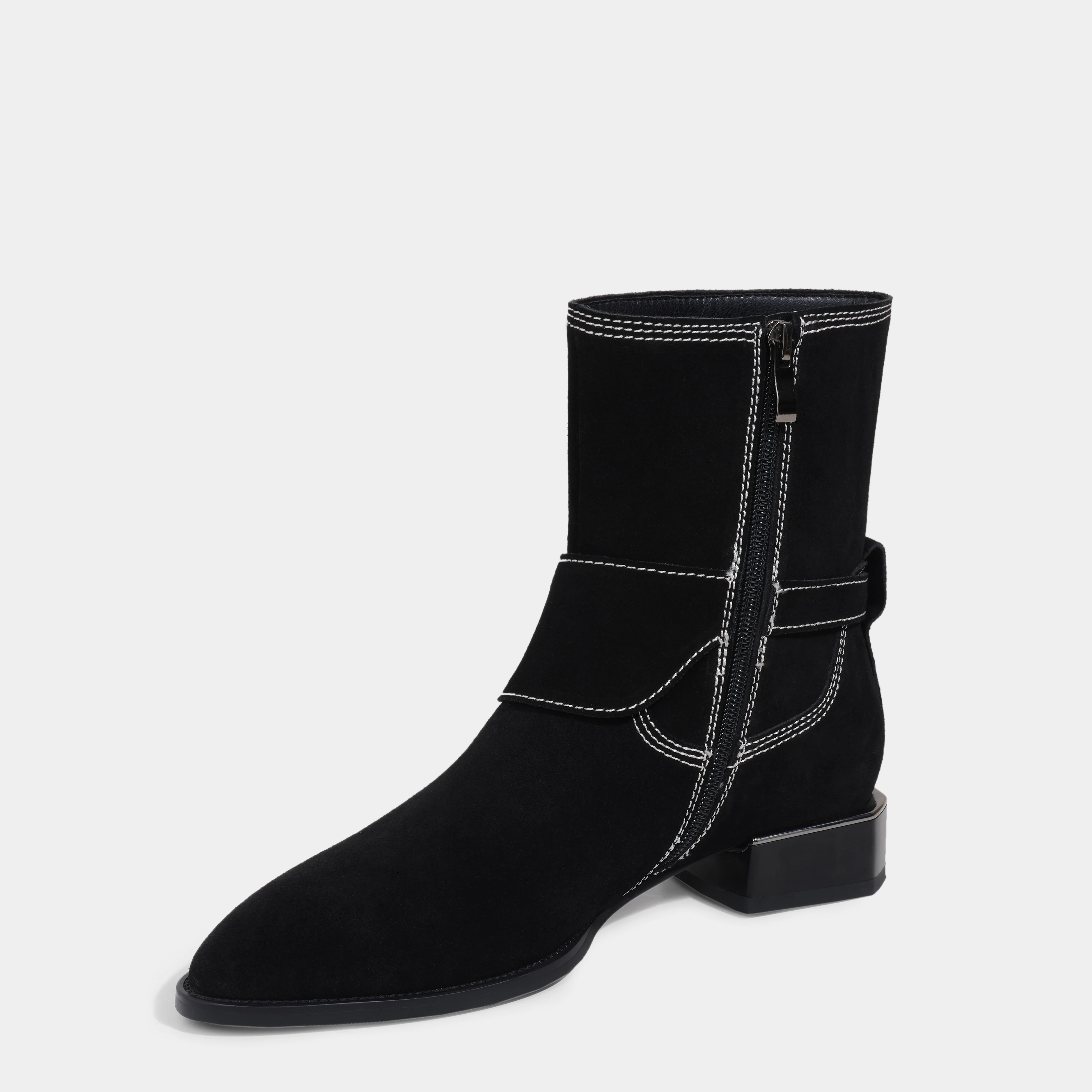 Elegant Western-Style Ankle Boots with Chunky Block Heel & Buckle Strap Detail Korean Classic Suede Bootie for Autumn