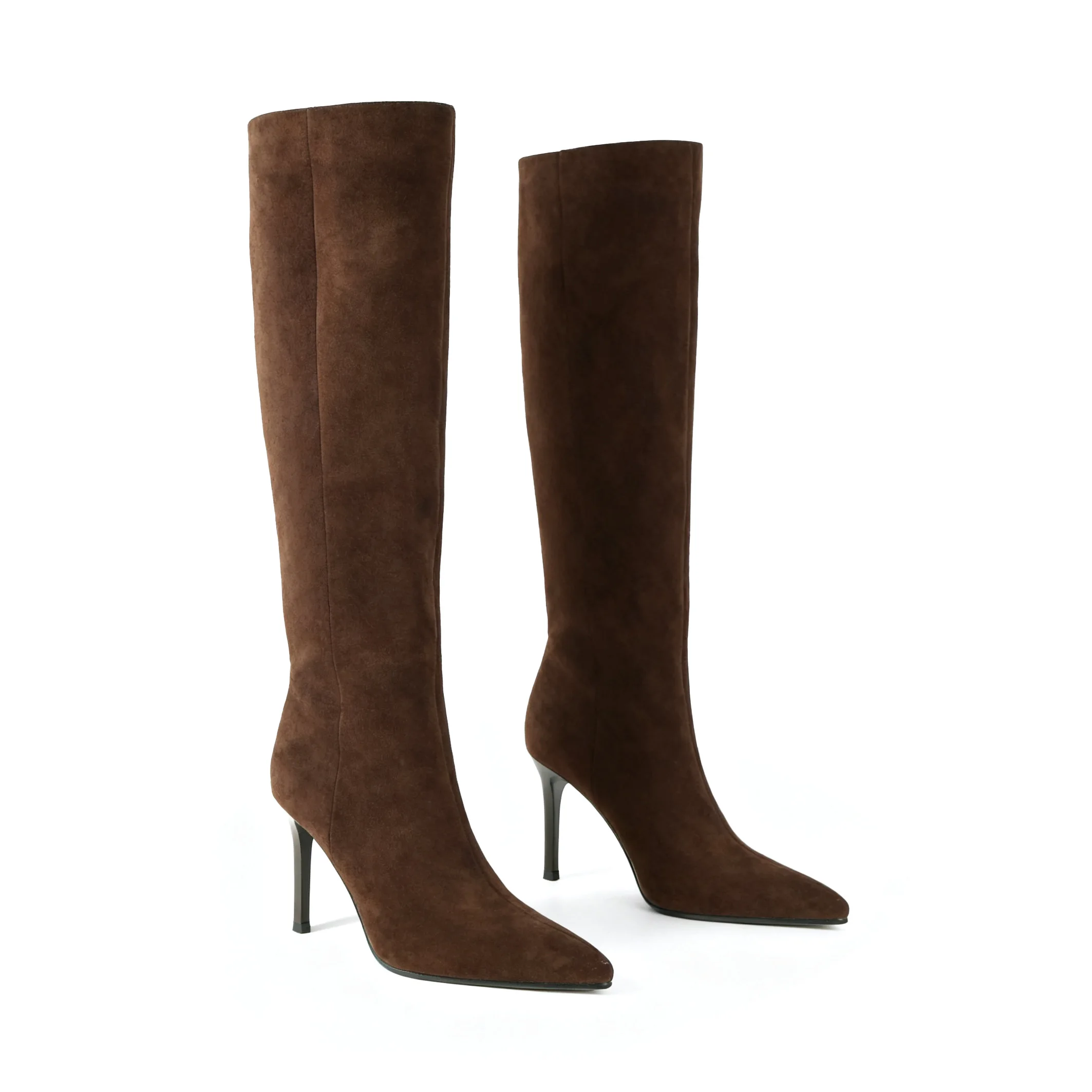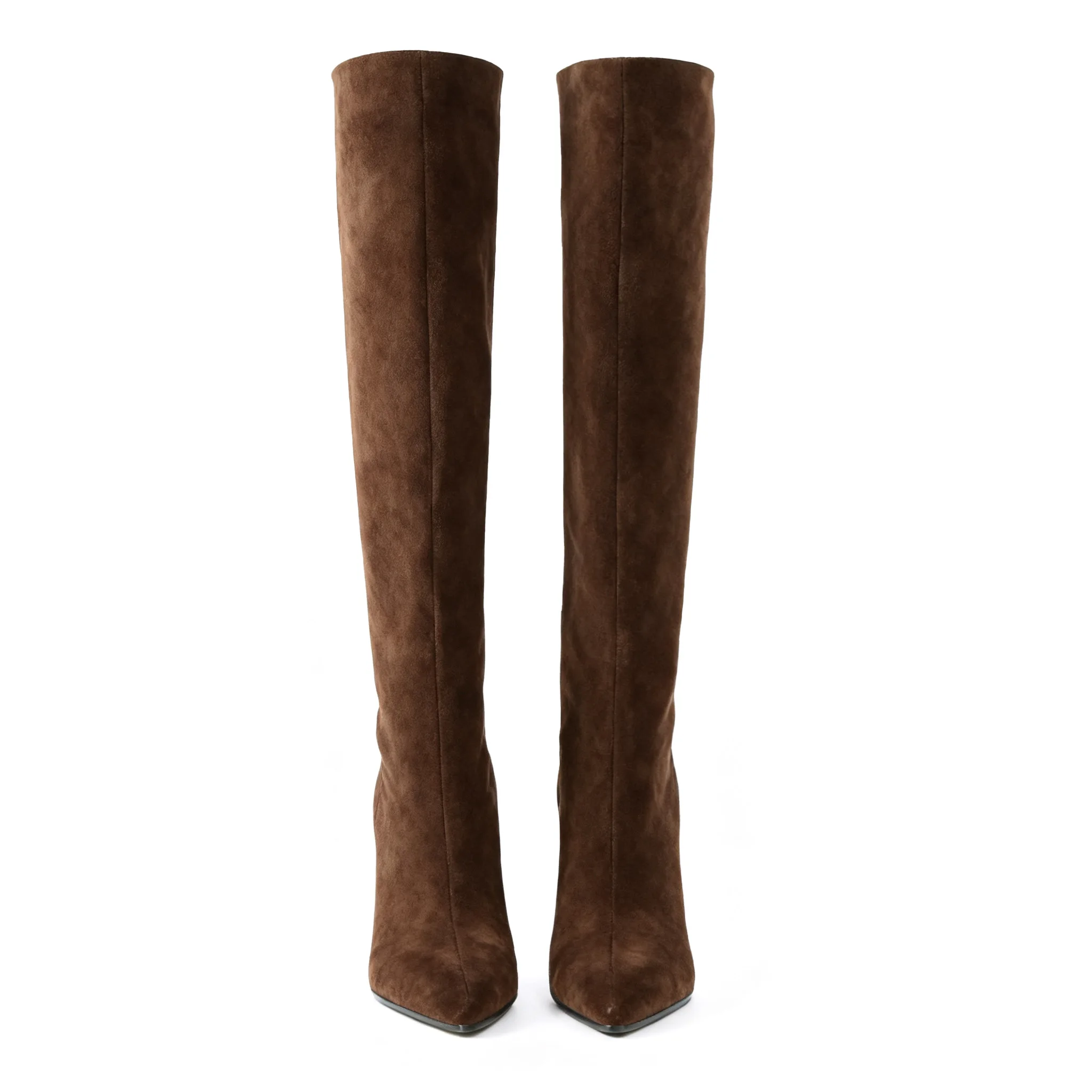 Brown Cow Suede Autumn/Winter Knee-High Boots with Pointed Toe Stiletto Heel Slip-On Closure & Comfort Trendy Style