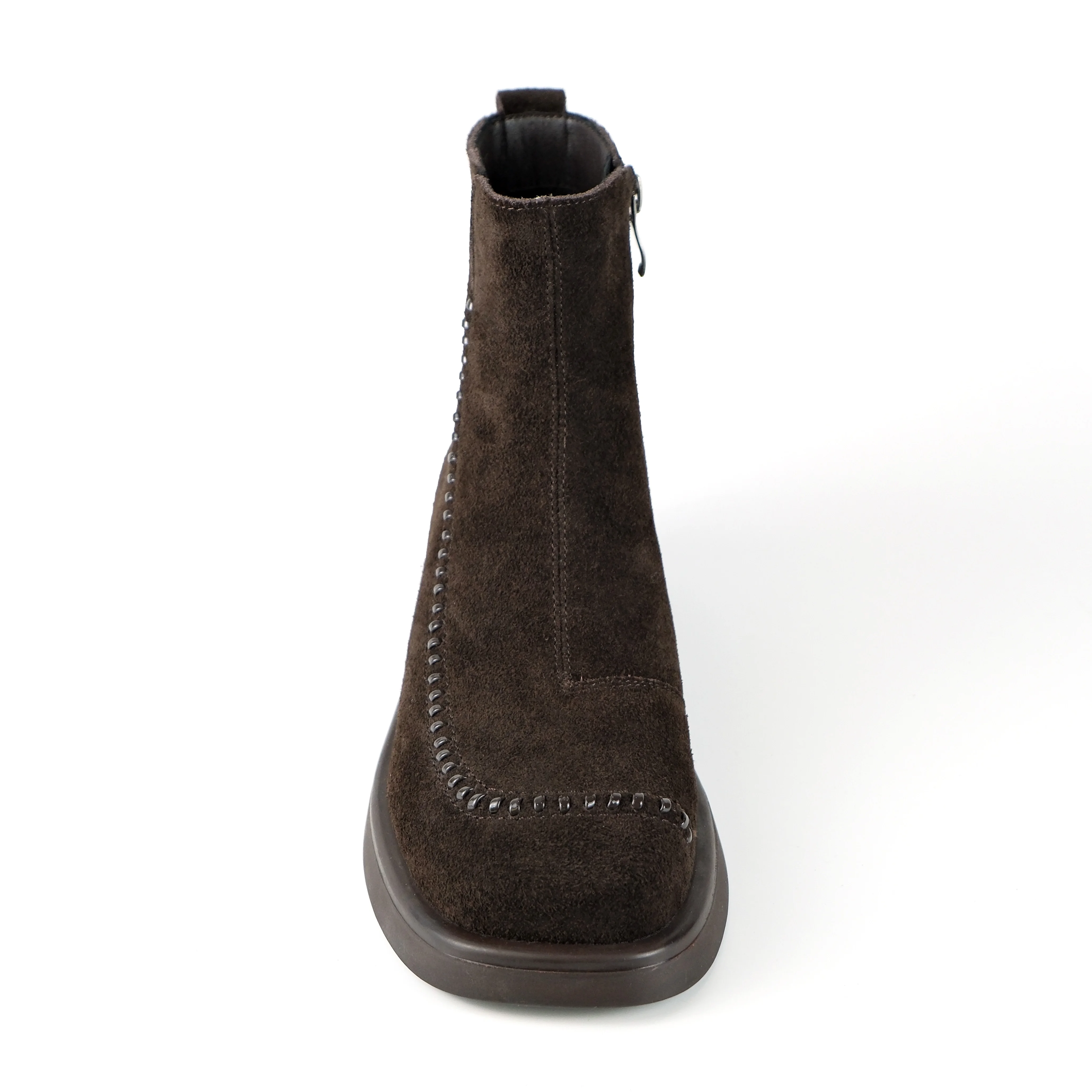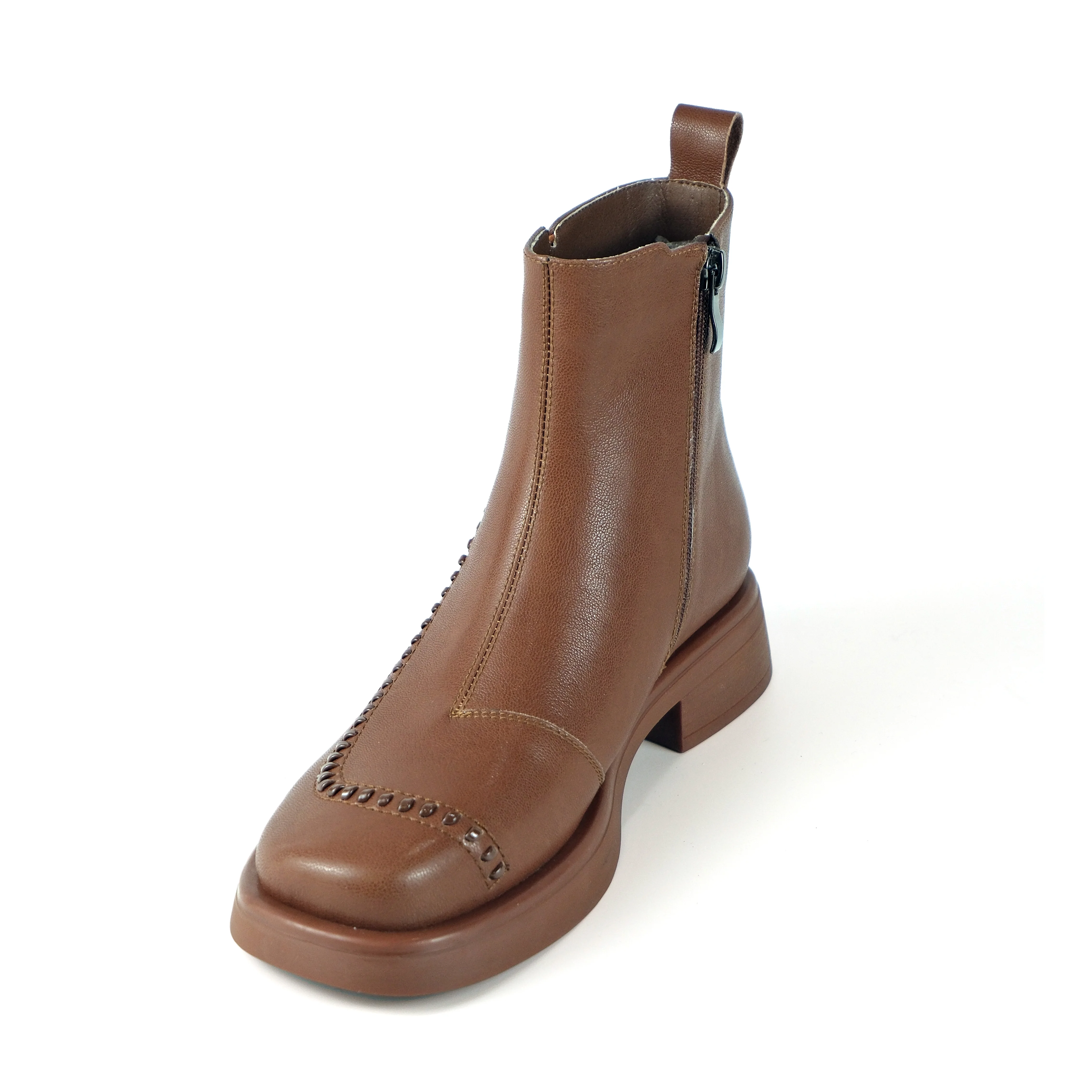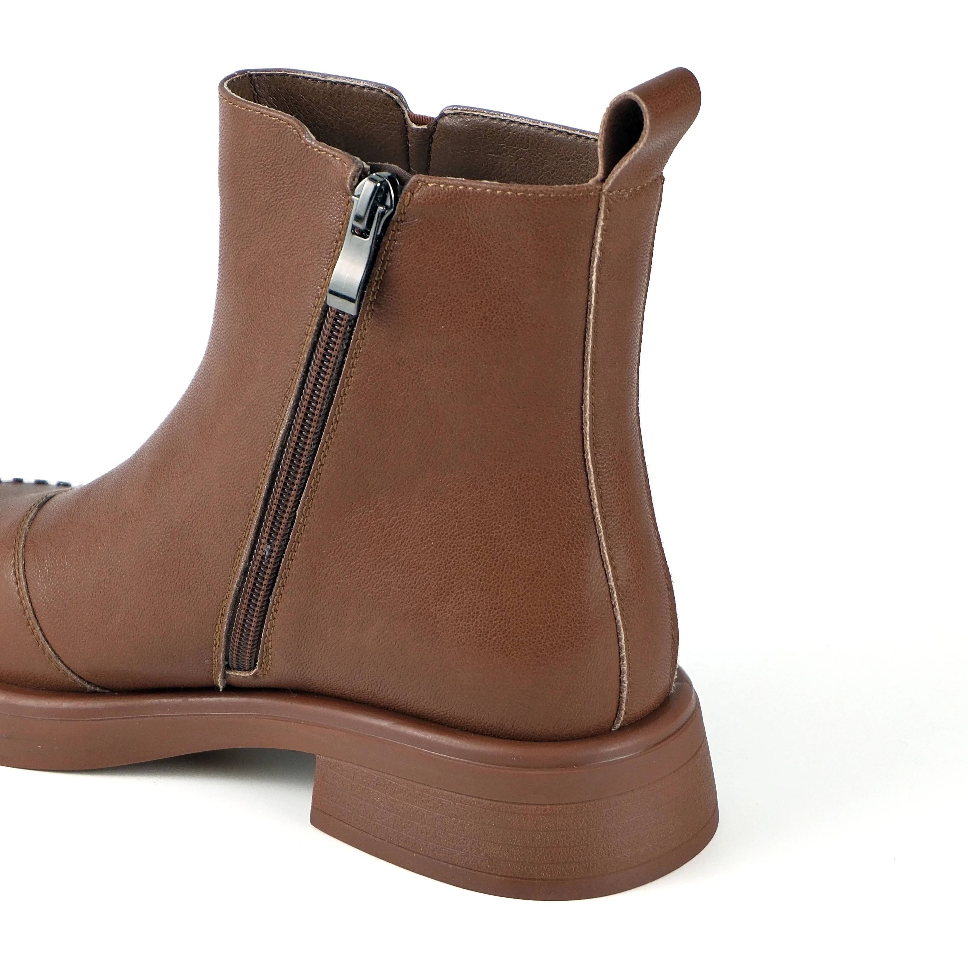 Women's Dark Brown Action Leather Ankle Boots-PU Lining Studded Stitch Low Block Heel Casual Dress Shoes 2026 Autumn