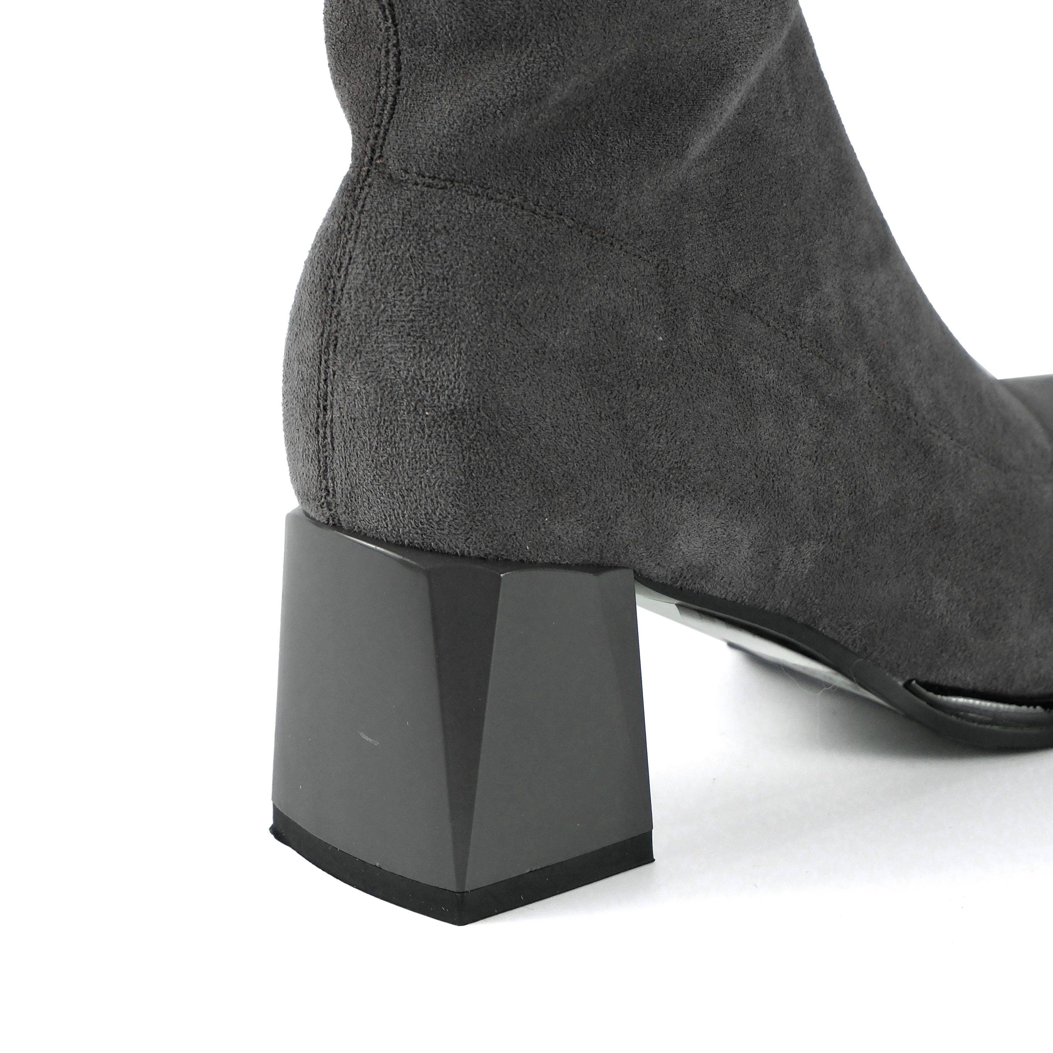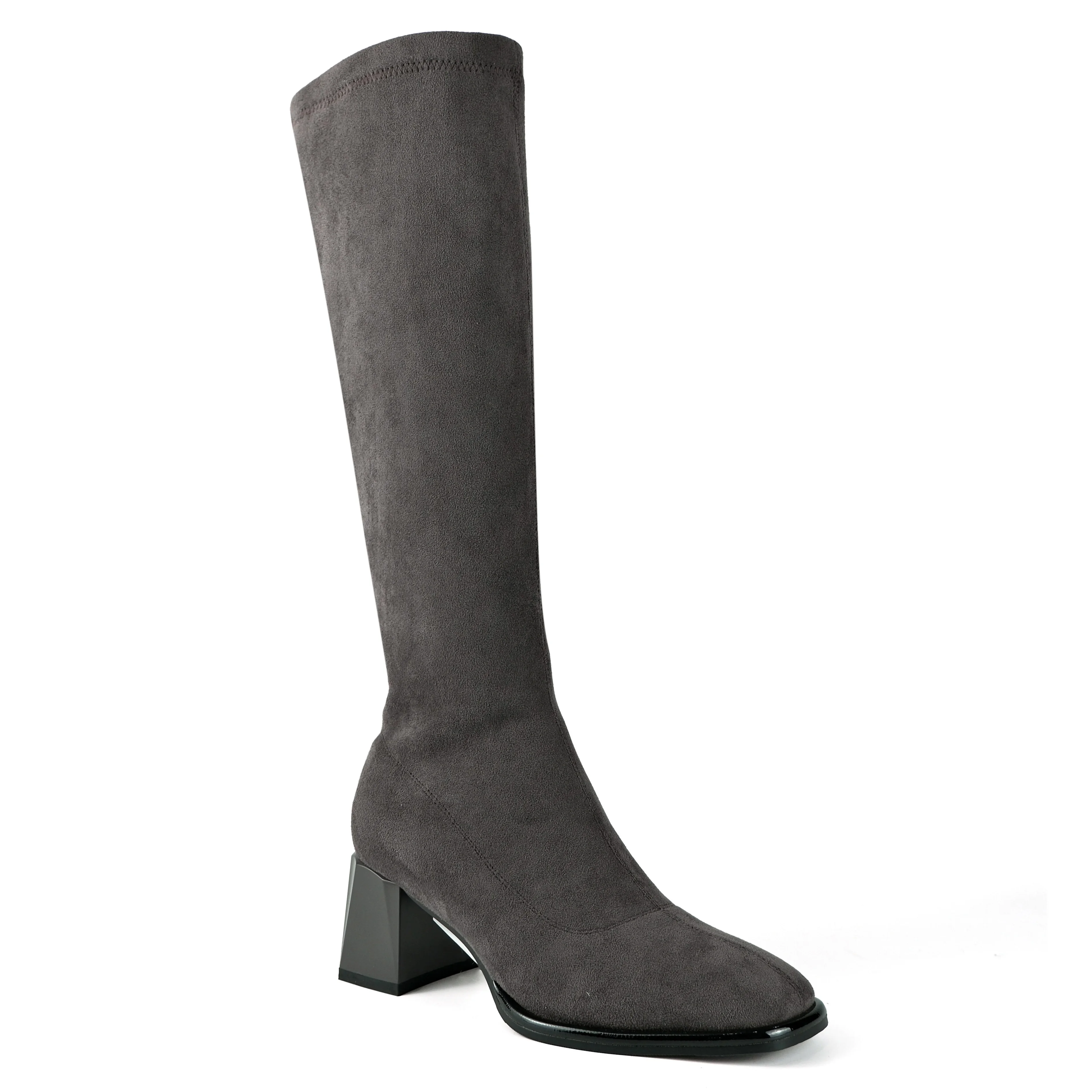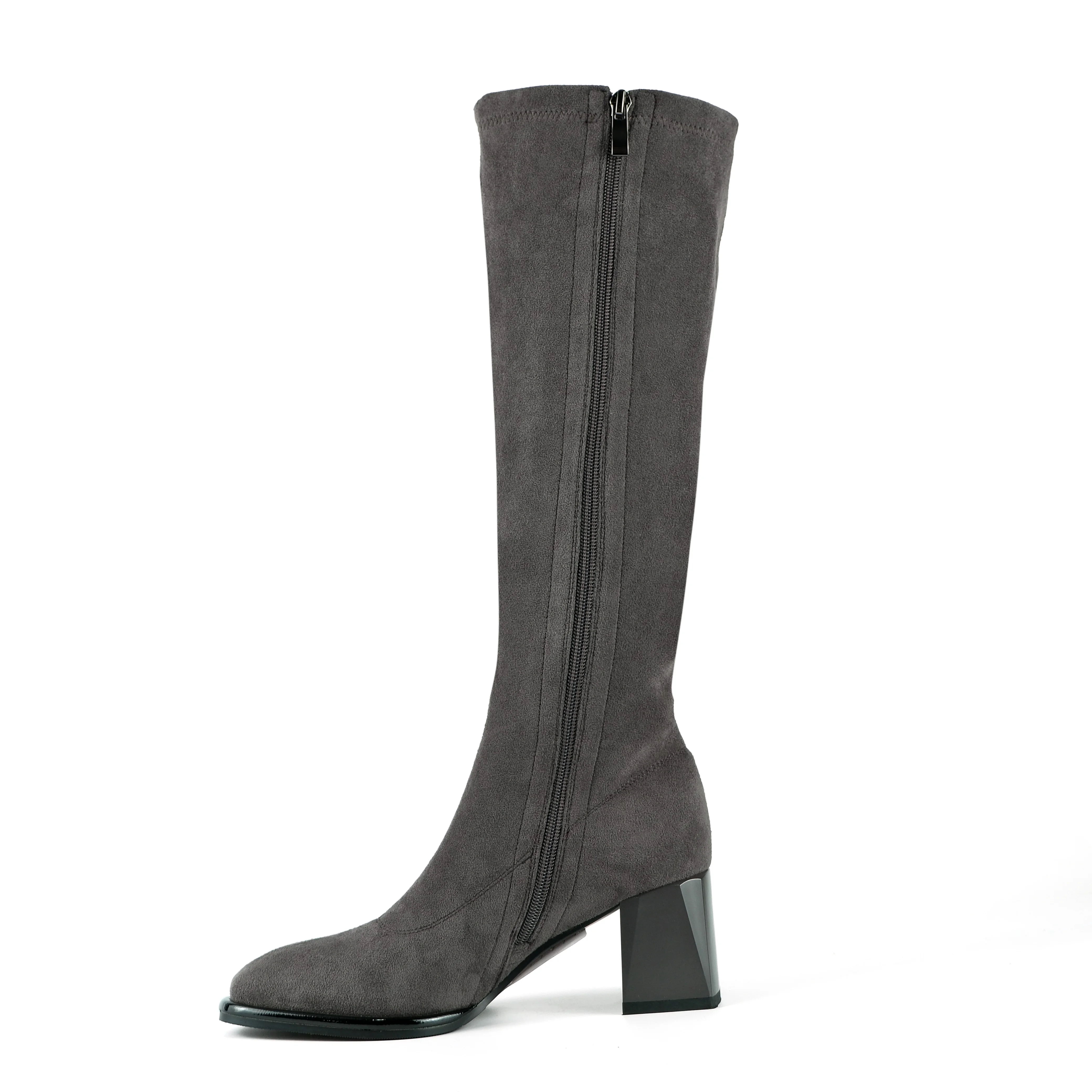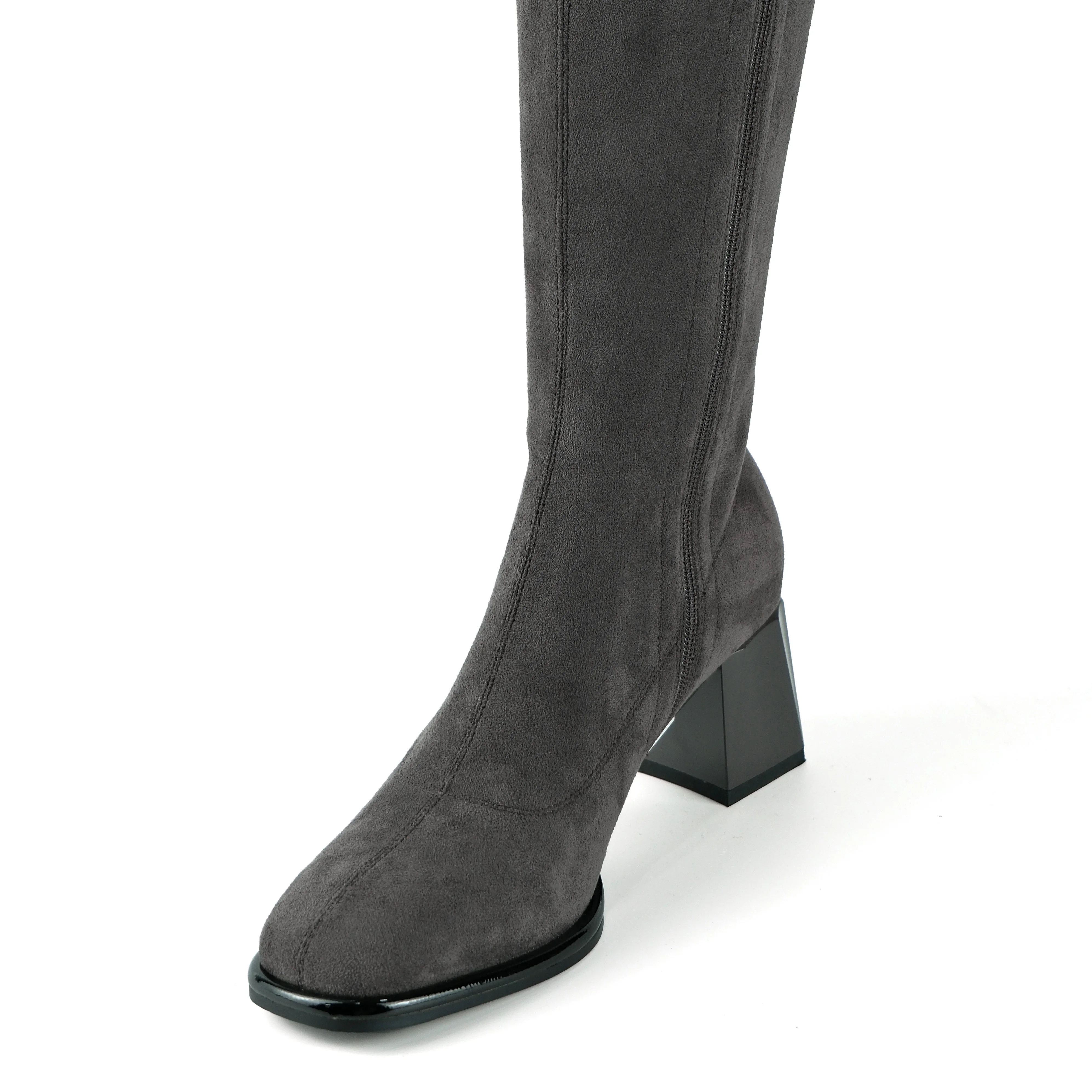 Women's Gray Faux Suede Knee-High Boots - Zipper Detail Block Heel Slim-Fit Footwear 2026 Autumn
