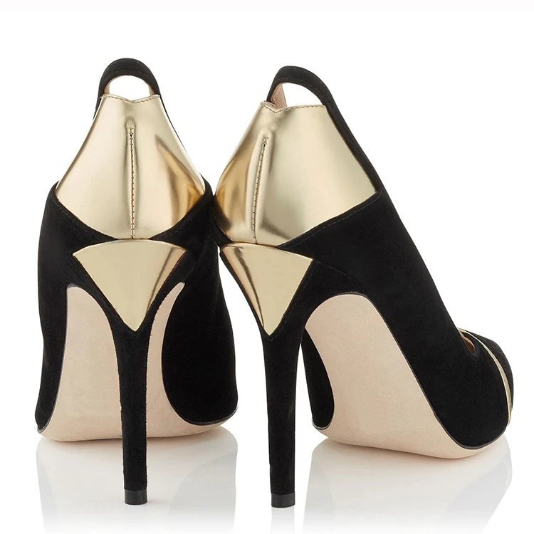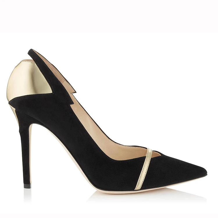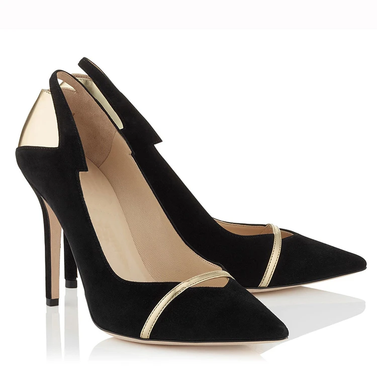Factory Direct Women Black Suede Pumps Gold Accent Pointed Toe High Heel Custom Logo Office Party Wholesale