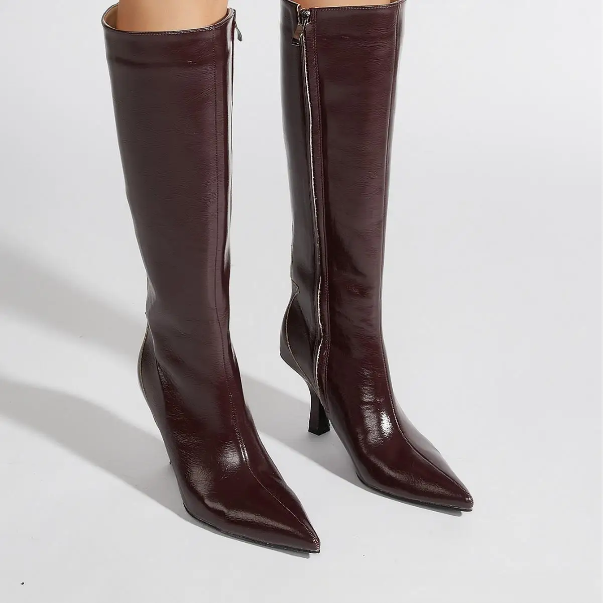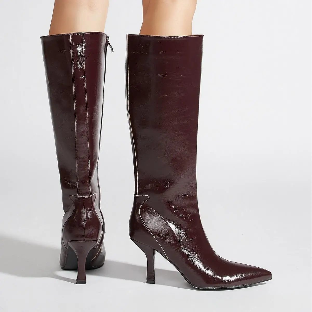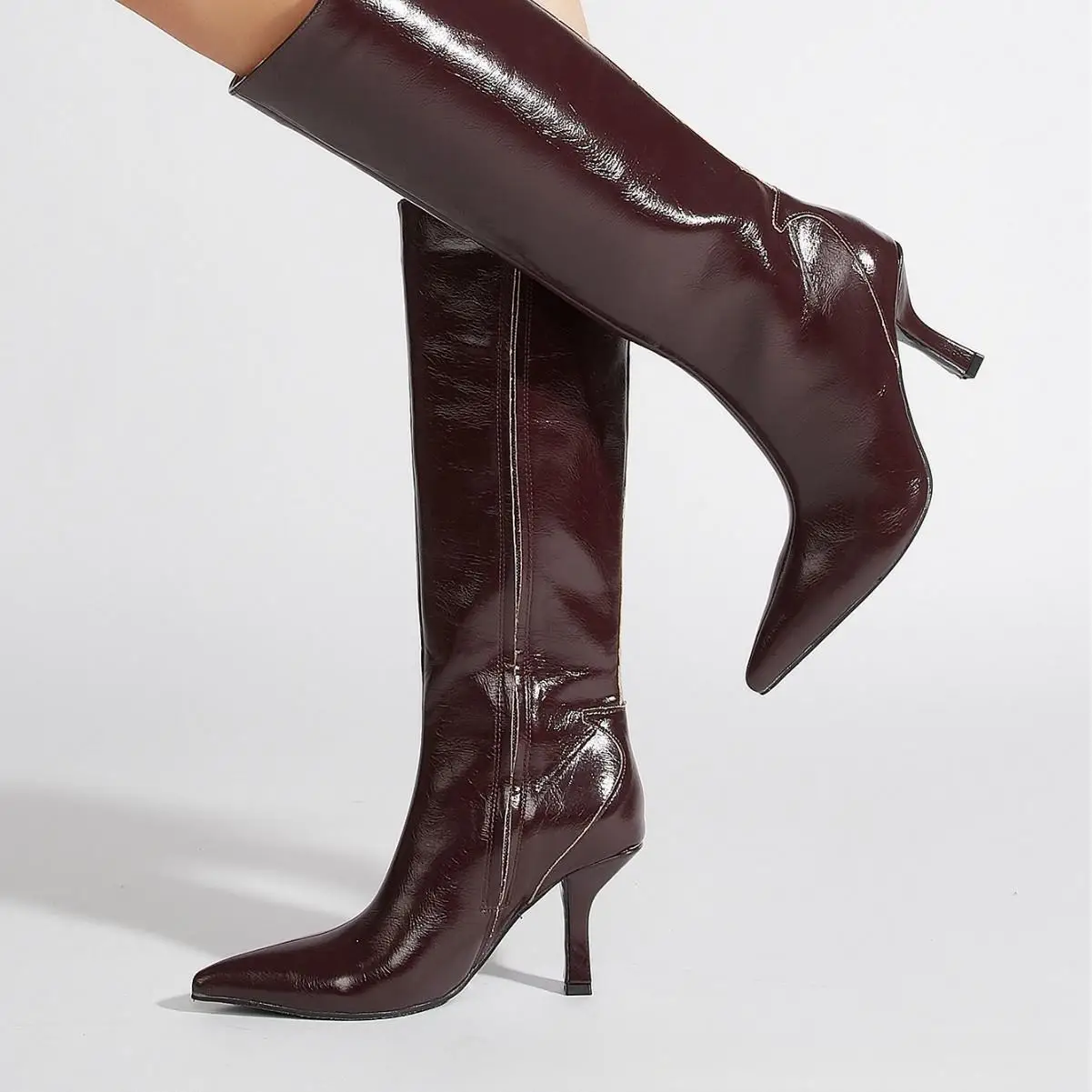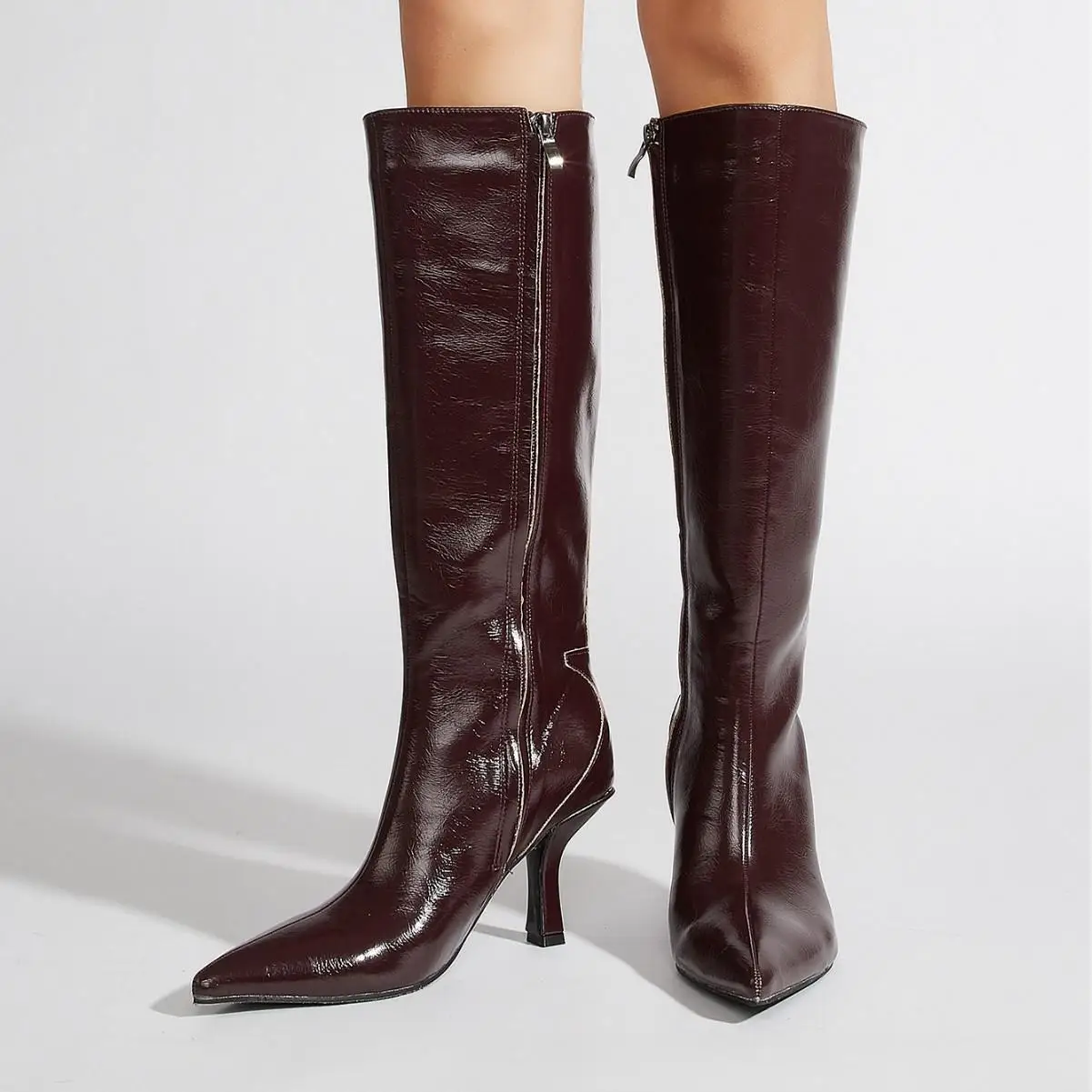 BUSY GIRL CXX181 High Heel Boots Women's Burgundy Patent Leather Knee-high Boots with Side Zipper Pointed Toe Thin Heels Boots