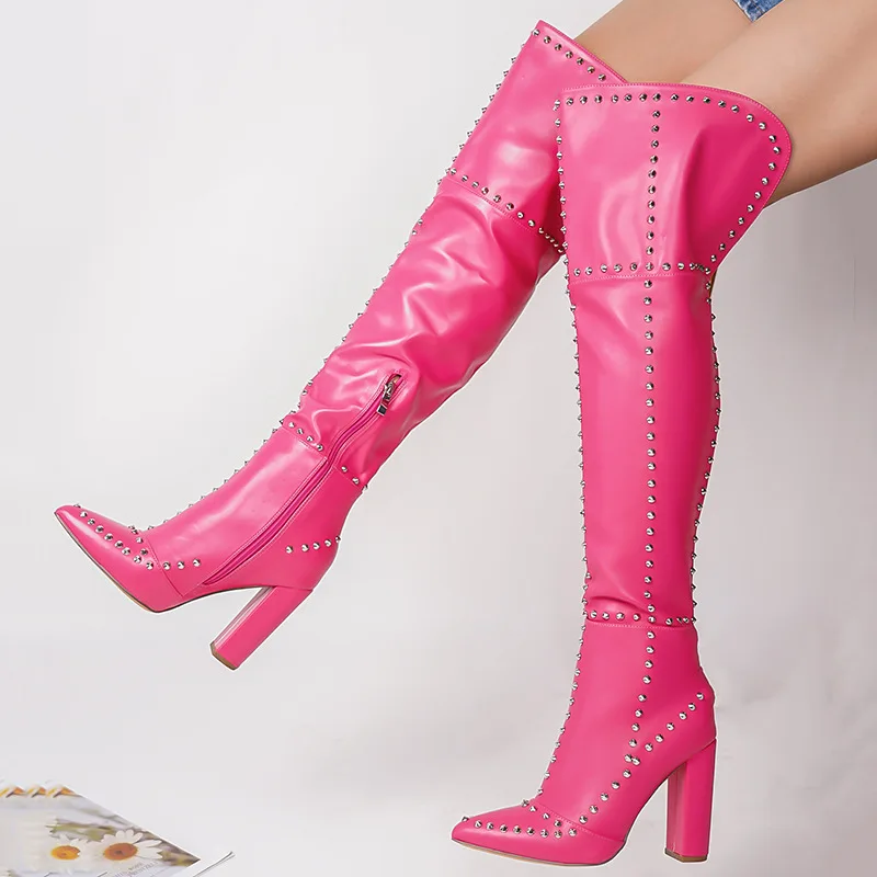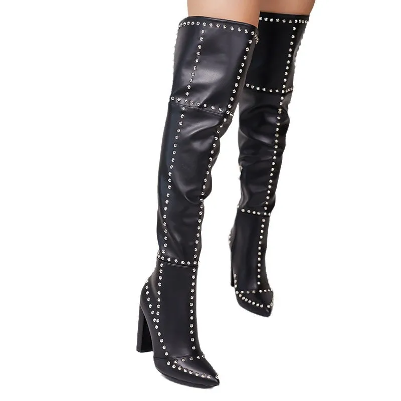 BUSY GIRL QLD21 Women's Over-the-Knee Block Slim High Heel Boots New Style All-Match Knee Boots All-Over Rivets for Ladies