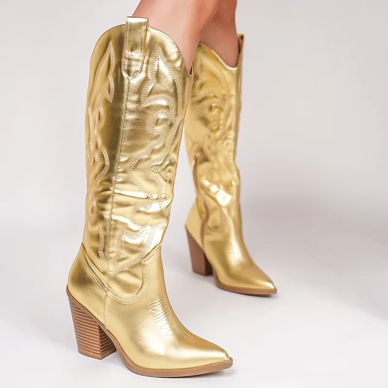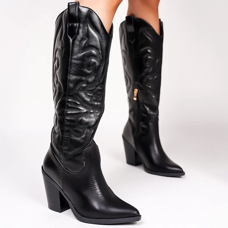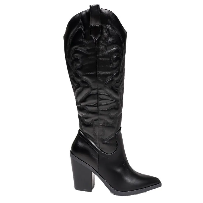 BUSY GIRL QLD27 Chelsea Knight Pointed Thick Heel High Heel Retro Boots Women's Western Cowboy Boots Fashion Breathable