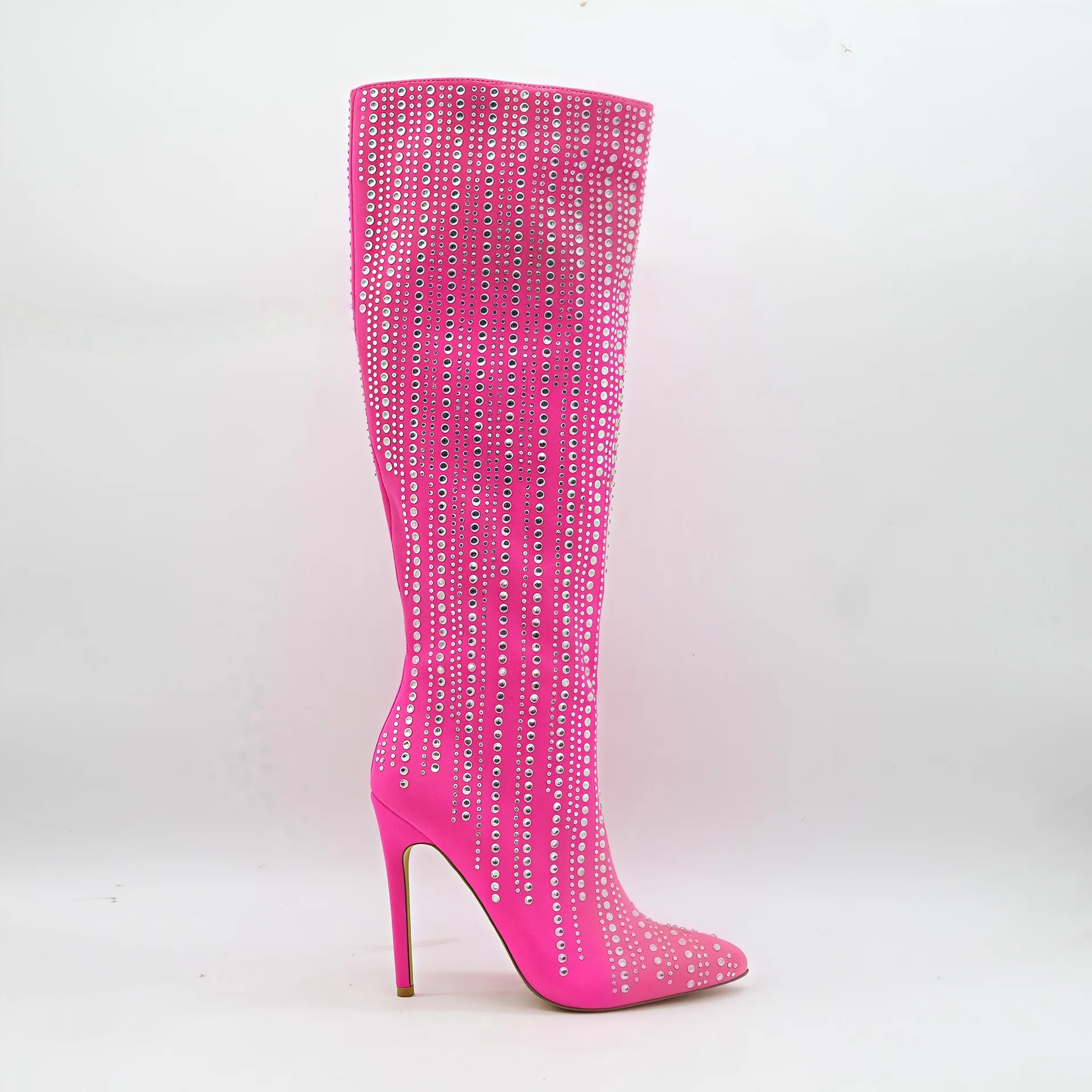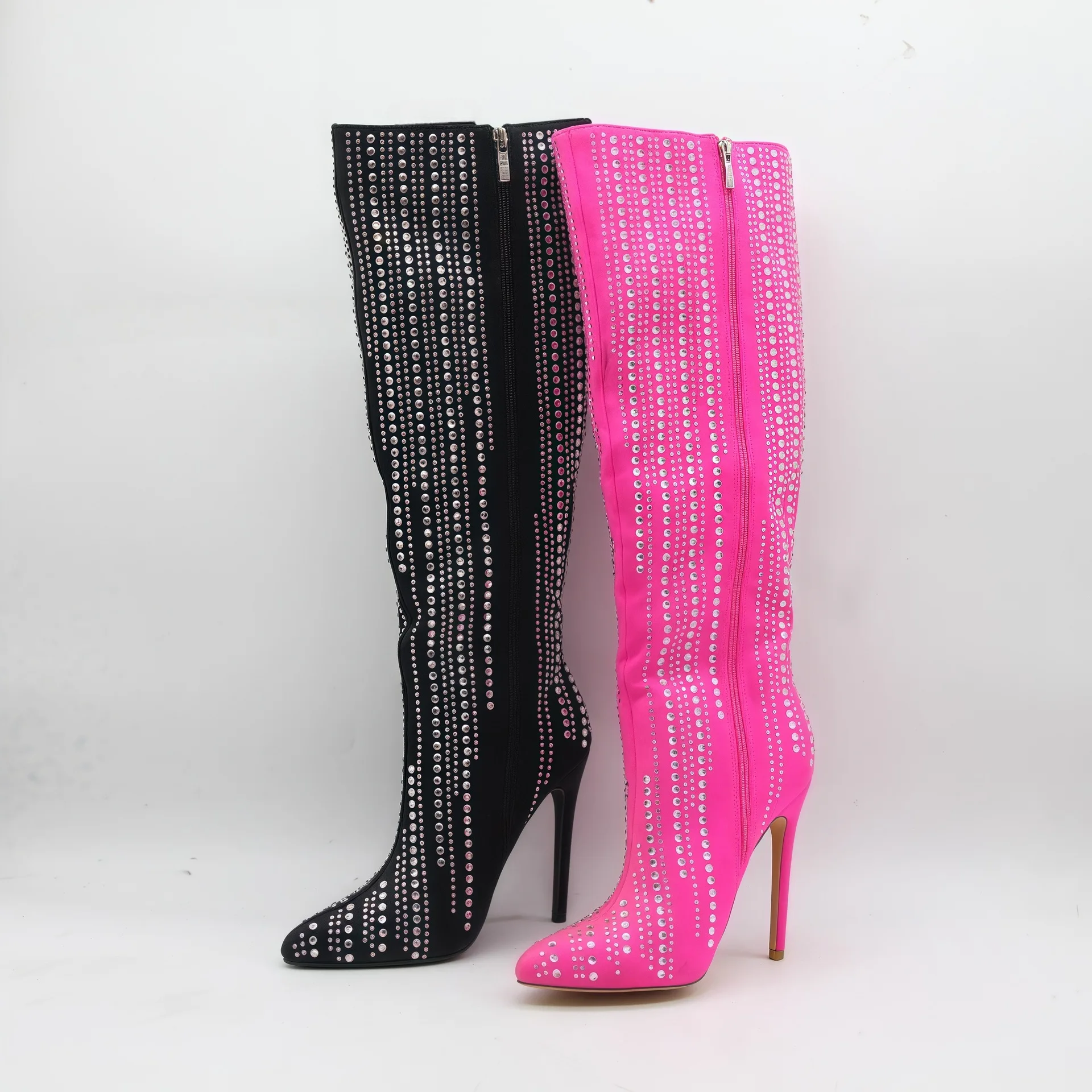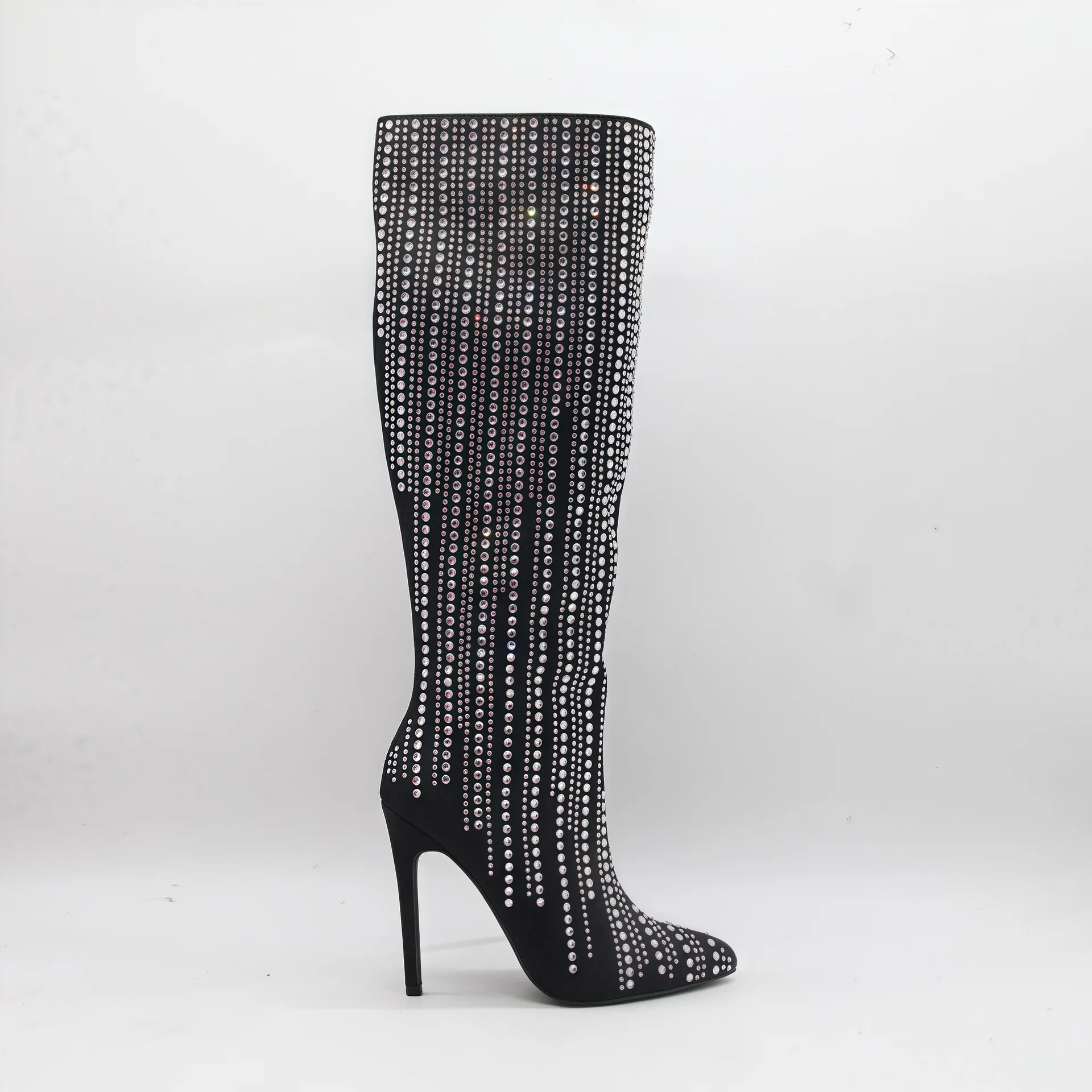 BUSY GIRL HQ1136 Women Boots Super High Heel Rhinestone Pointed Toe Knee High Boots Starry Dress Stiletto Breathable Women Boots