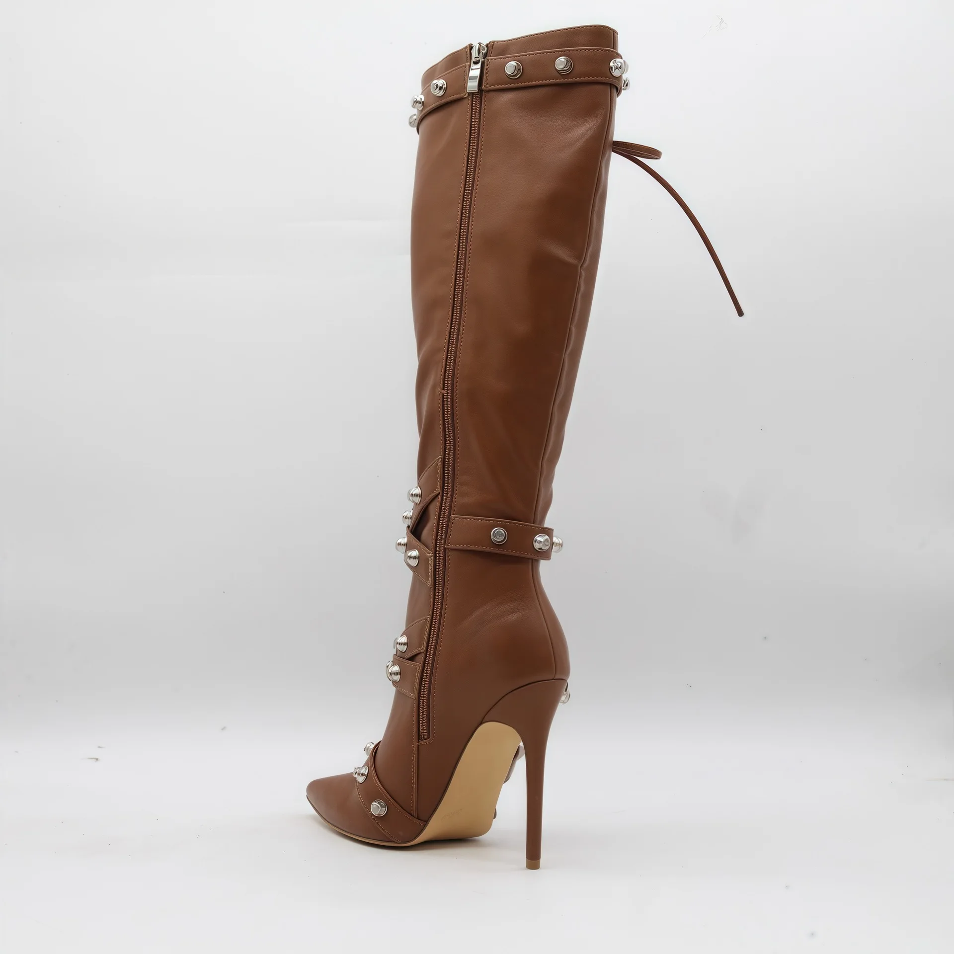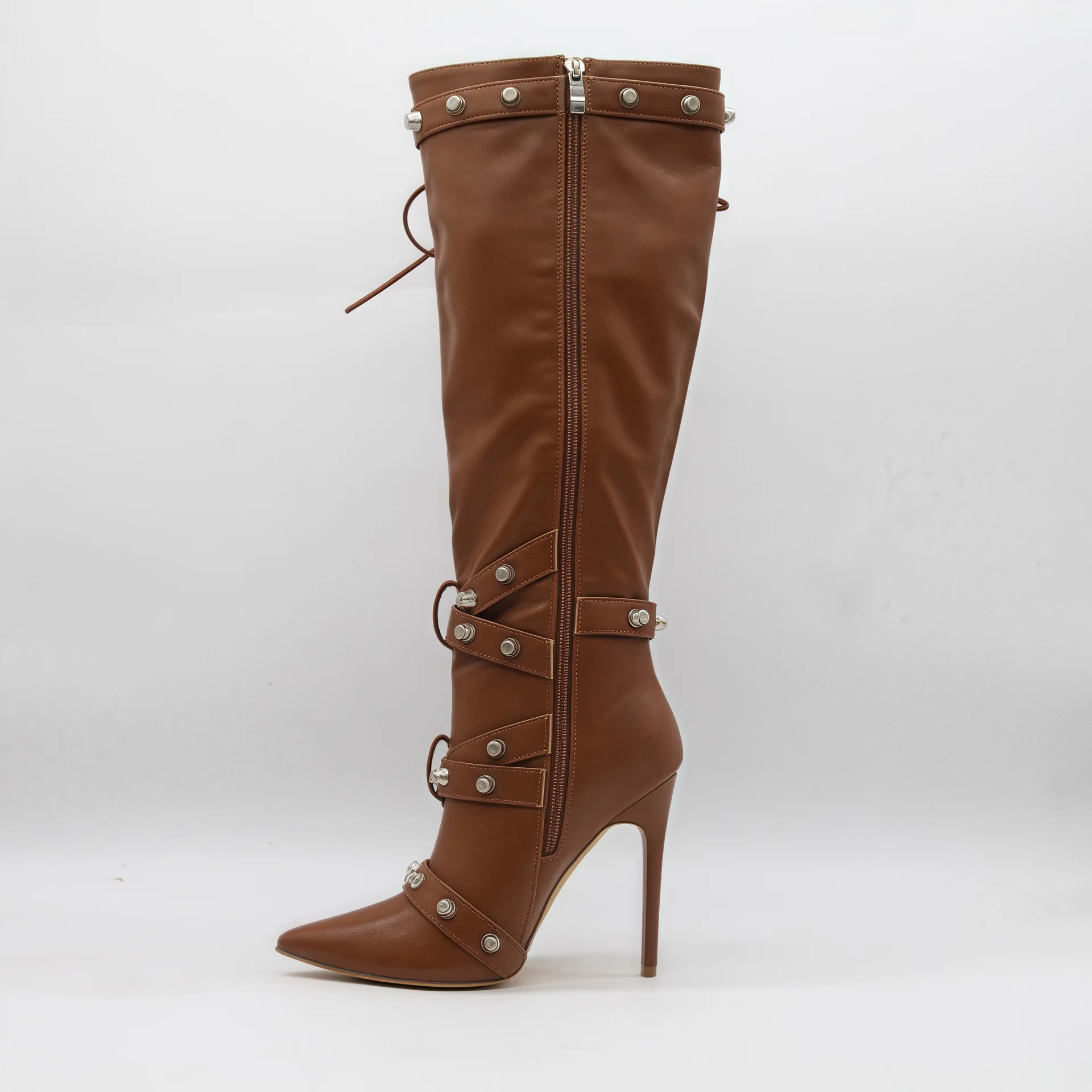 BUSY GIRL HQ1154 Custom Logo Boots Wholesale Patent Leather Sexy studded High-top Pointed-toe Stiletto Boots with Side Zipper