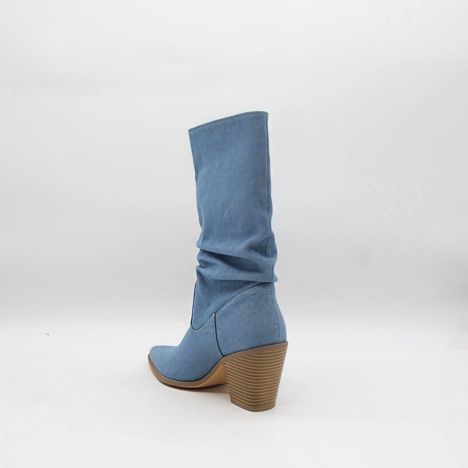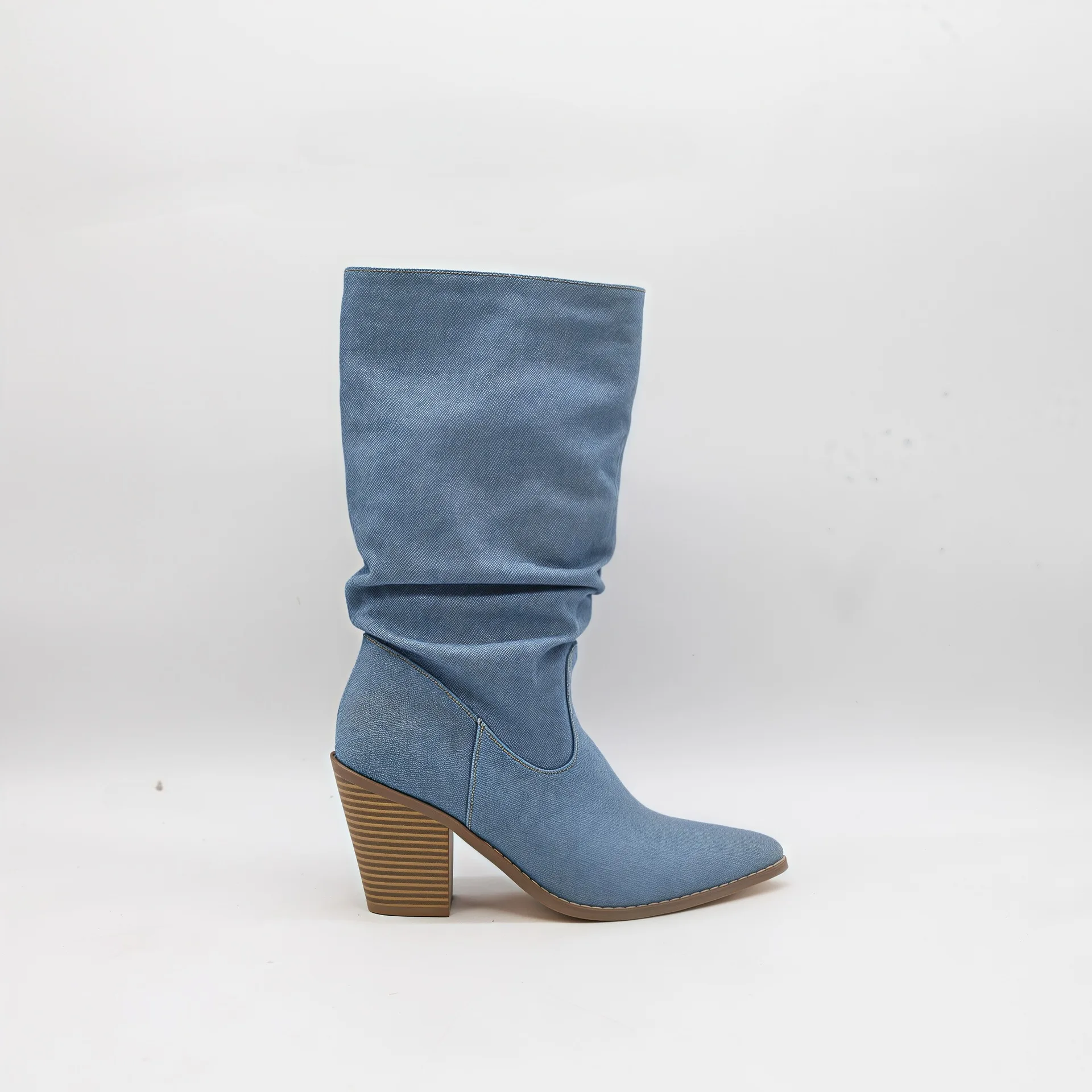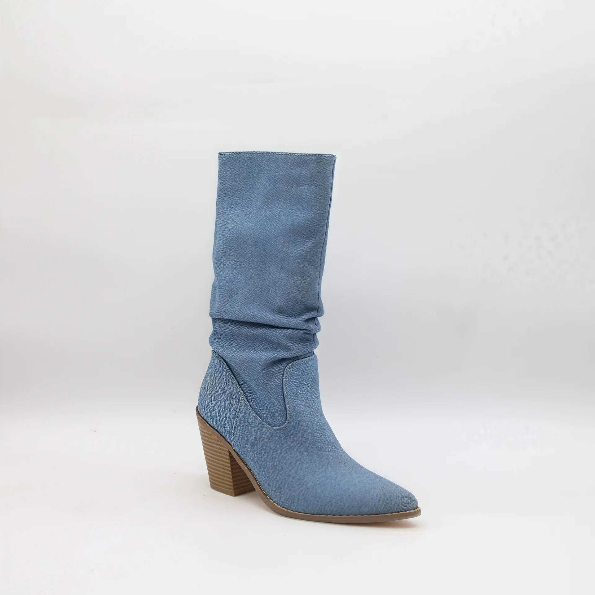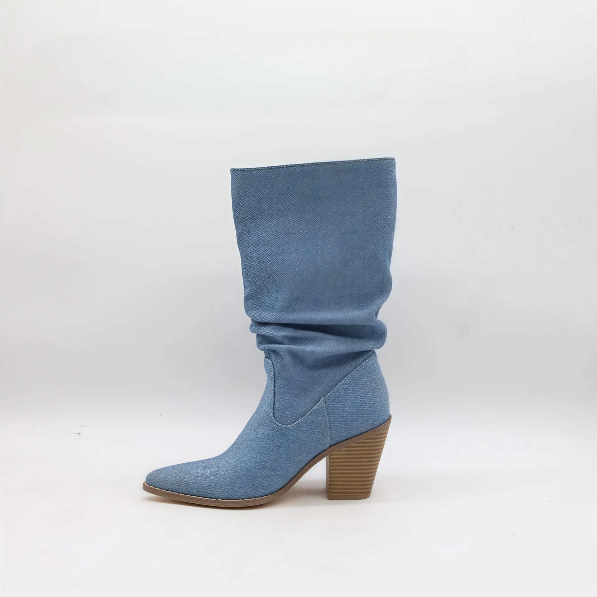 BUSY GIRL HQ1156 Custom Women Boots 2026 Western Cowboy Boots Blue Pointed Toe Pleated Slouch Boots Chunky Heel Mid-Calf Boots