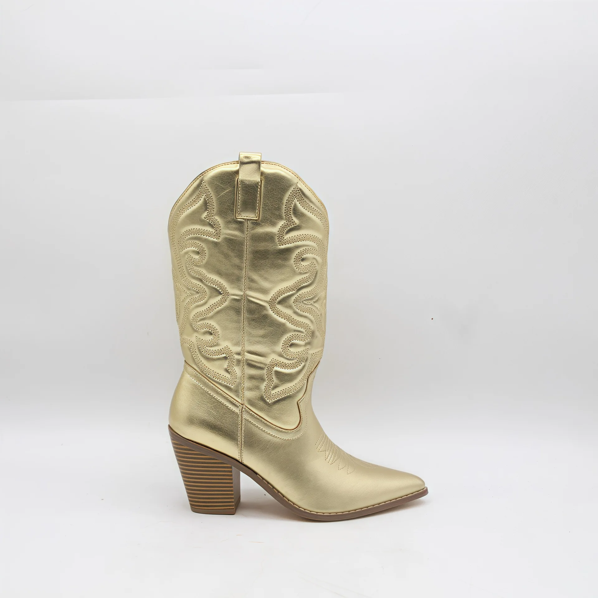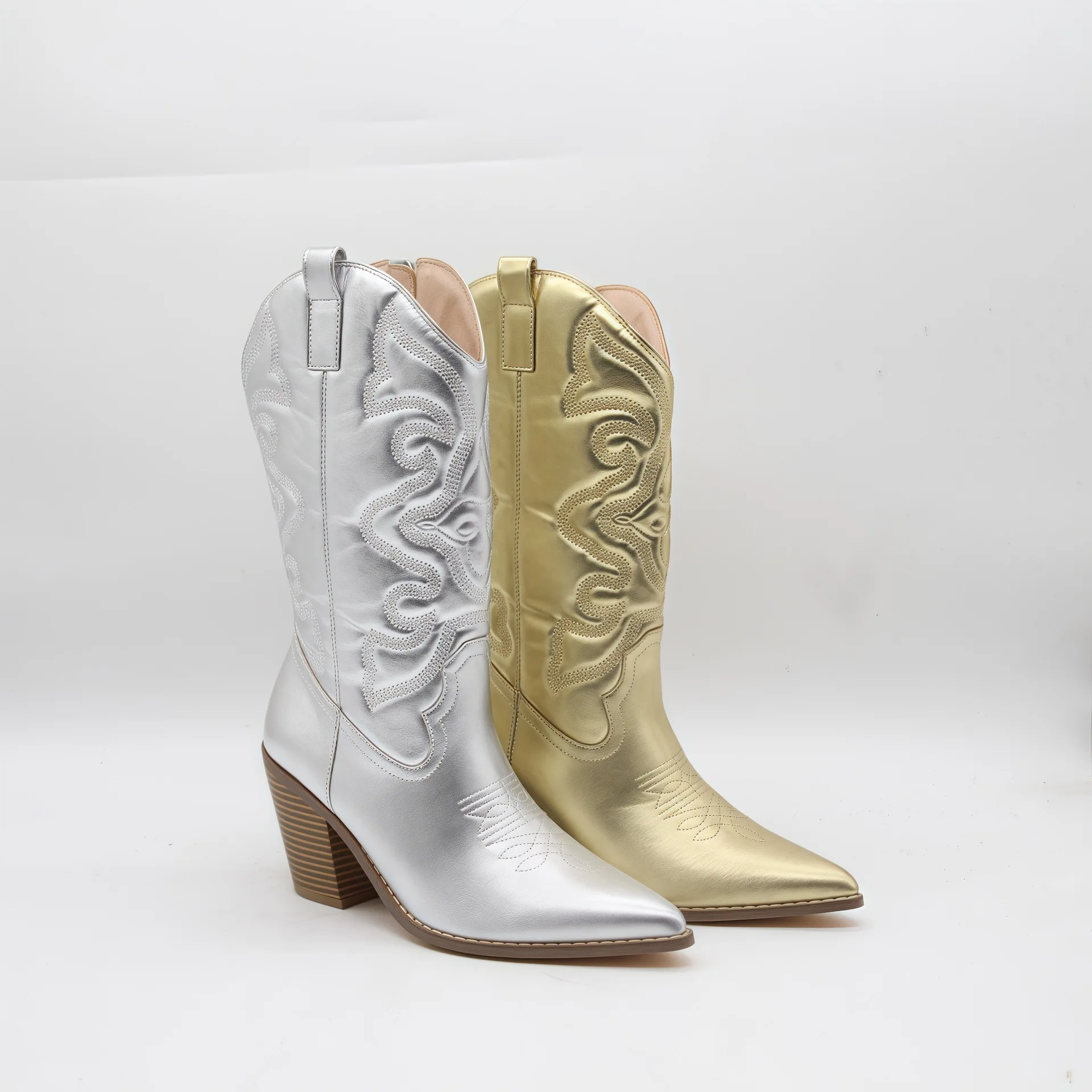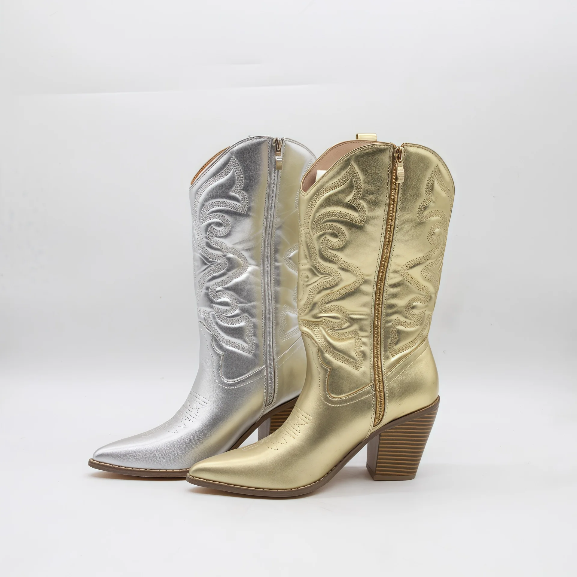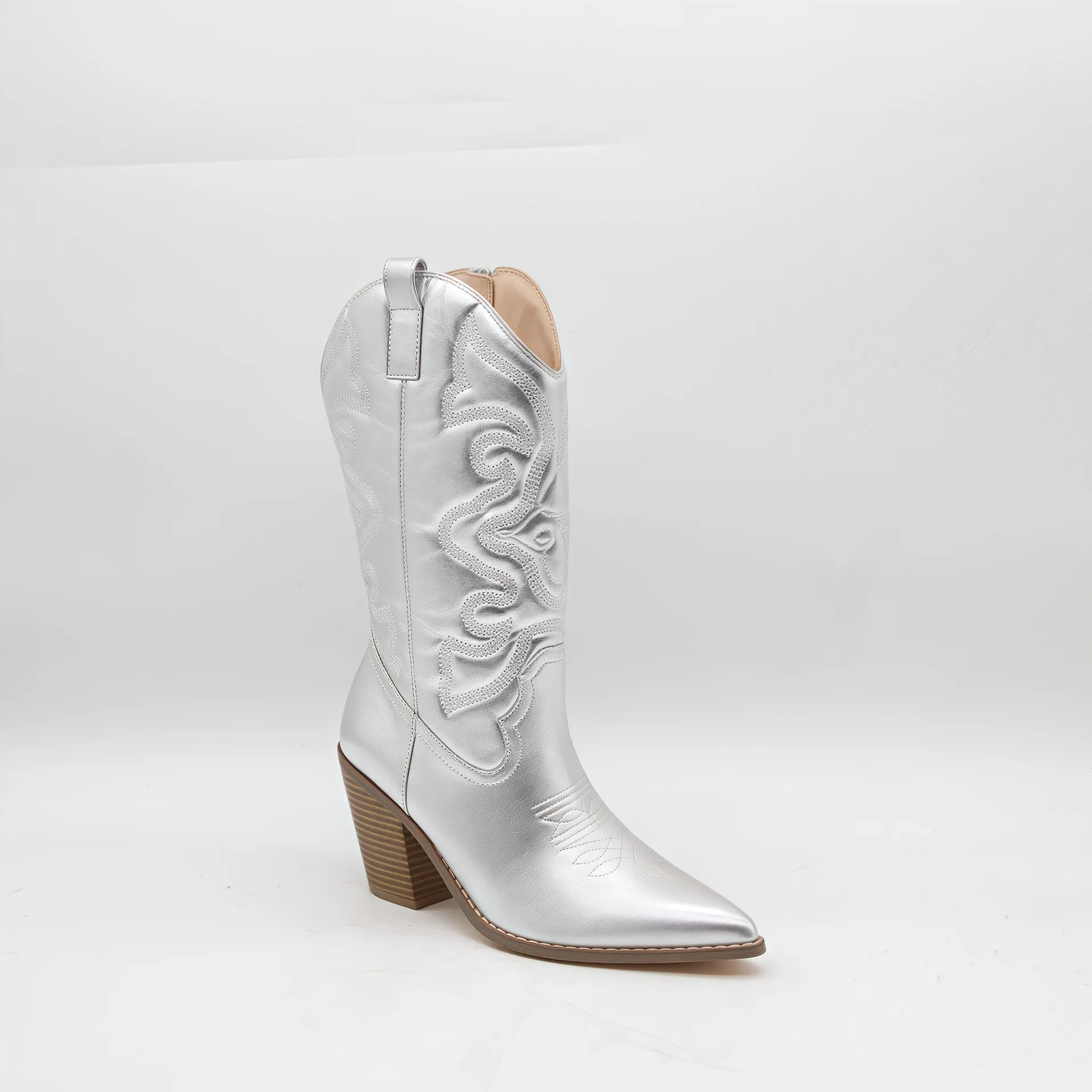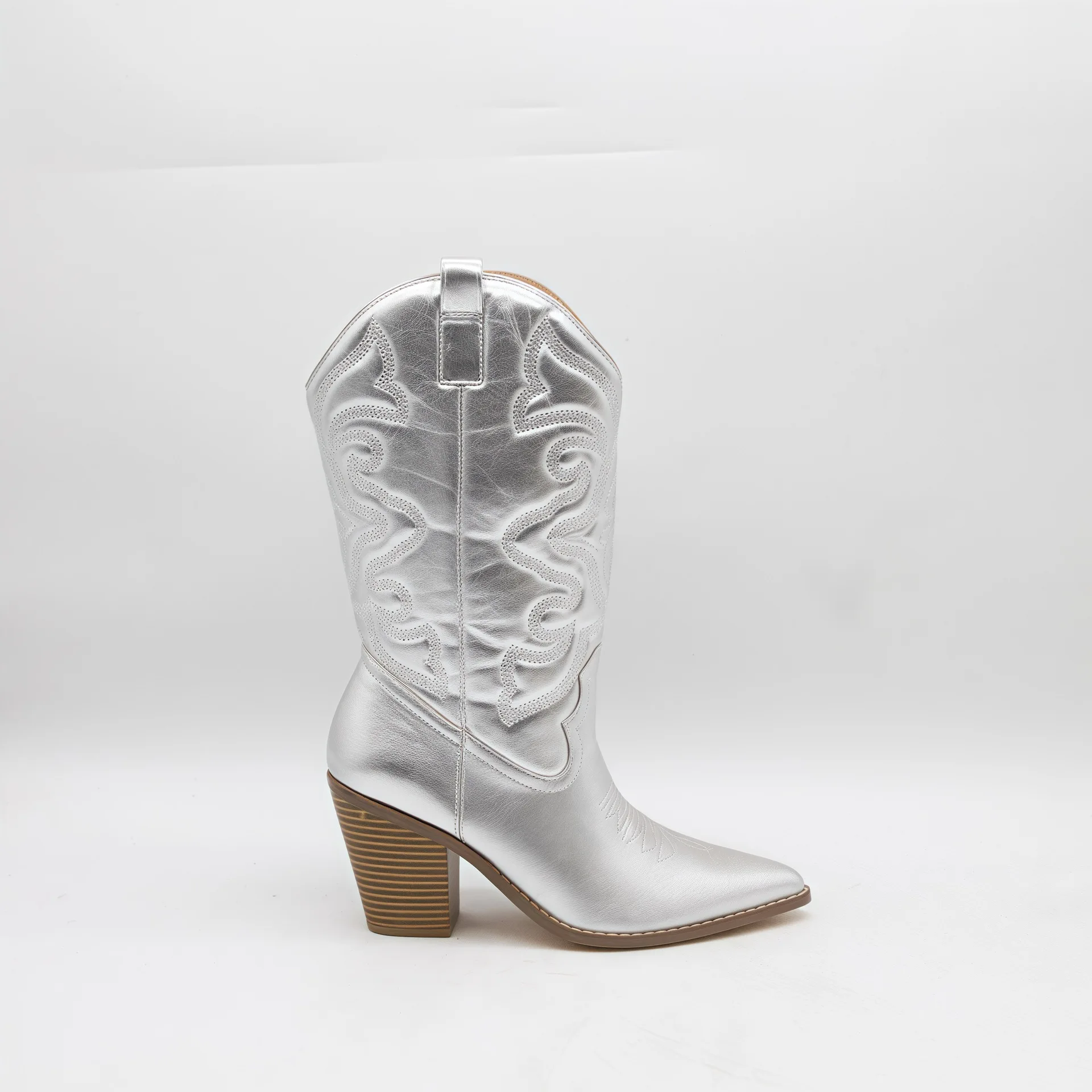 BUSY GIRL HQ1161 Wholesale Women's Silver Metallic Western Cowboy Boots with Embossed Pointed Toe Block Heel Boot PartyStatement
