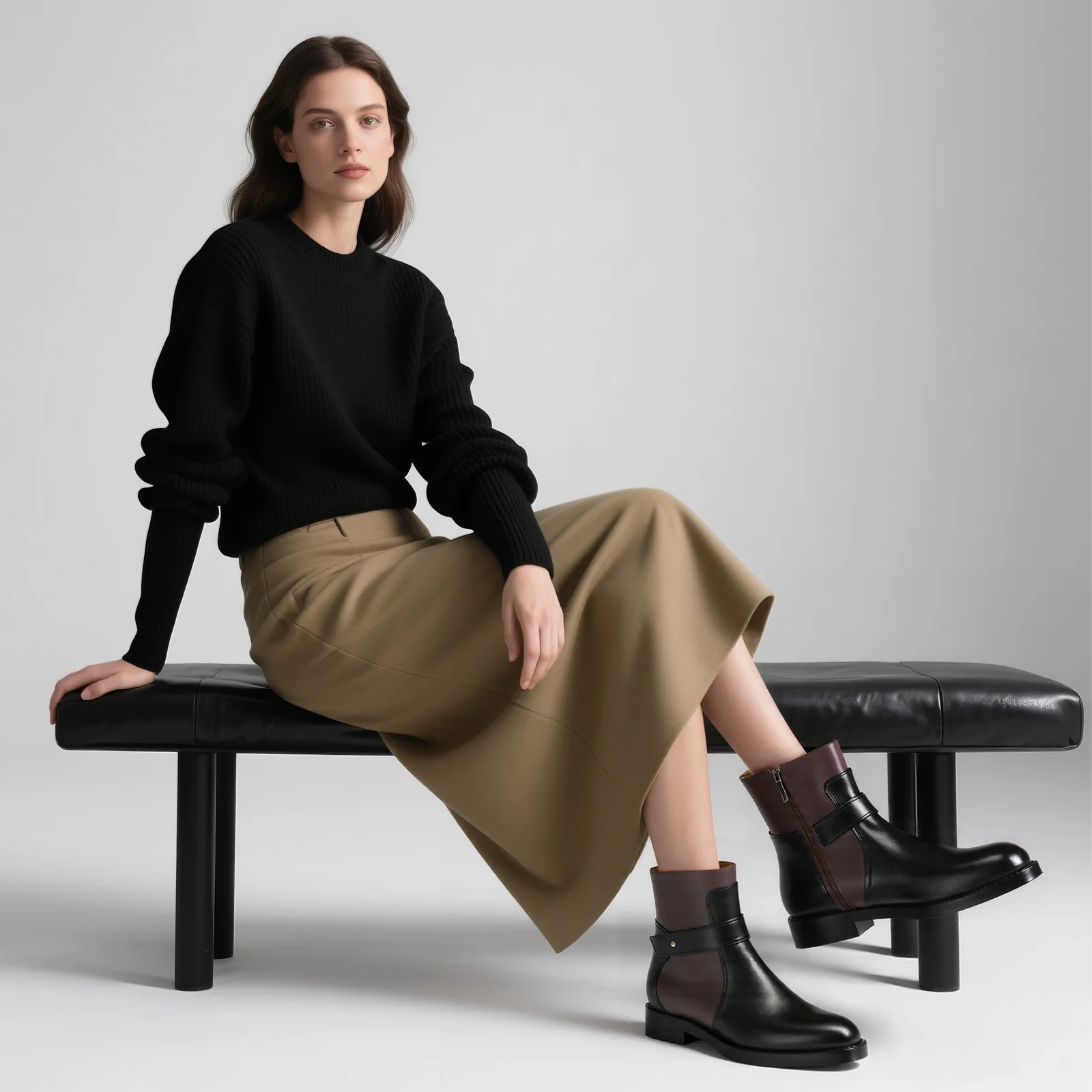 Women's Color-Block Leather Boots Premium Material Belt Buckle Detail Chunky Heel Slip-On Closure Midi Boot Height Fashion Trend
