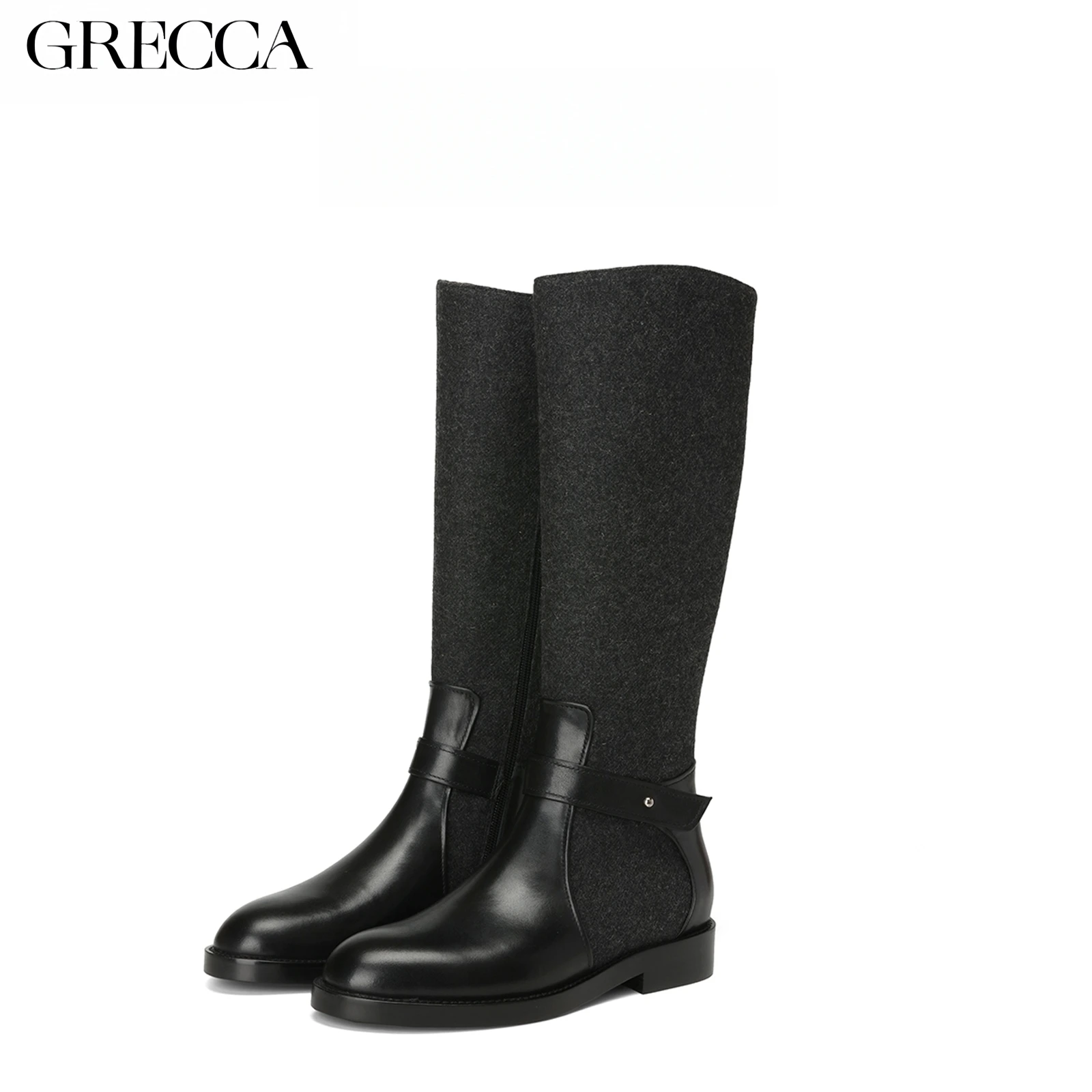 GRECCA Women's Brown Wool- Leather Mix Knee-High Boots Low Heel Buckle Accent Versatile & Trendy Design Western Style