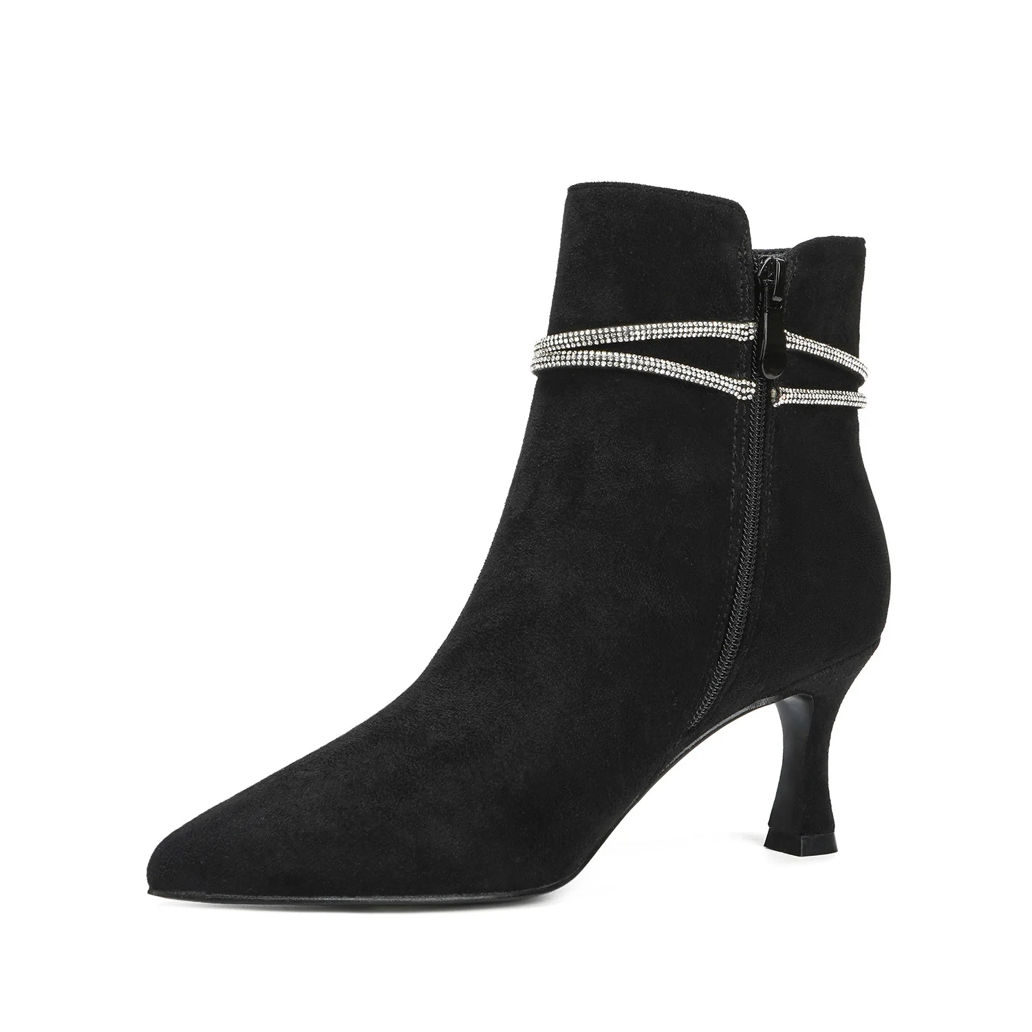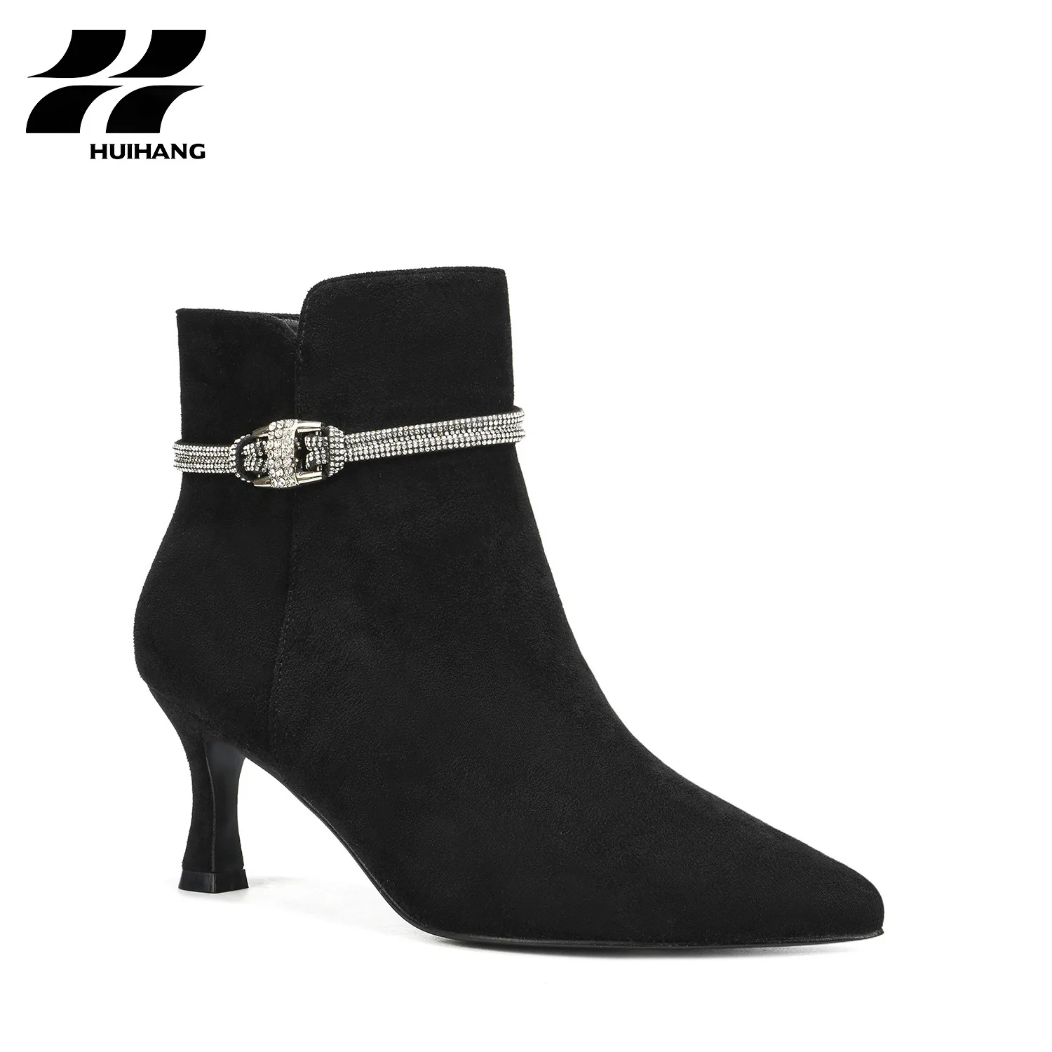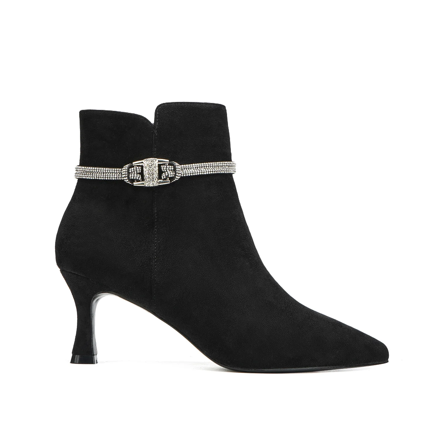Women's Winter Suede Stiletto Ankle Boots Rhinestone Buckle Strap Trendy Pointed Toe Evening Party Footwear Zip Closure PU