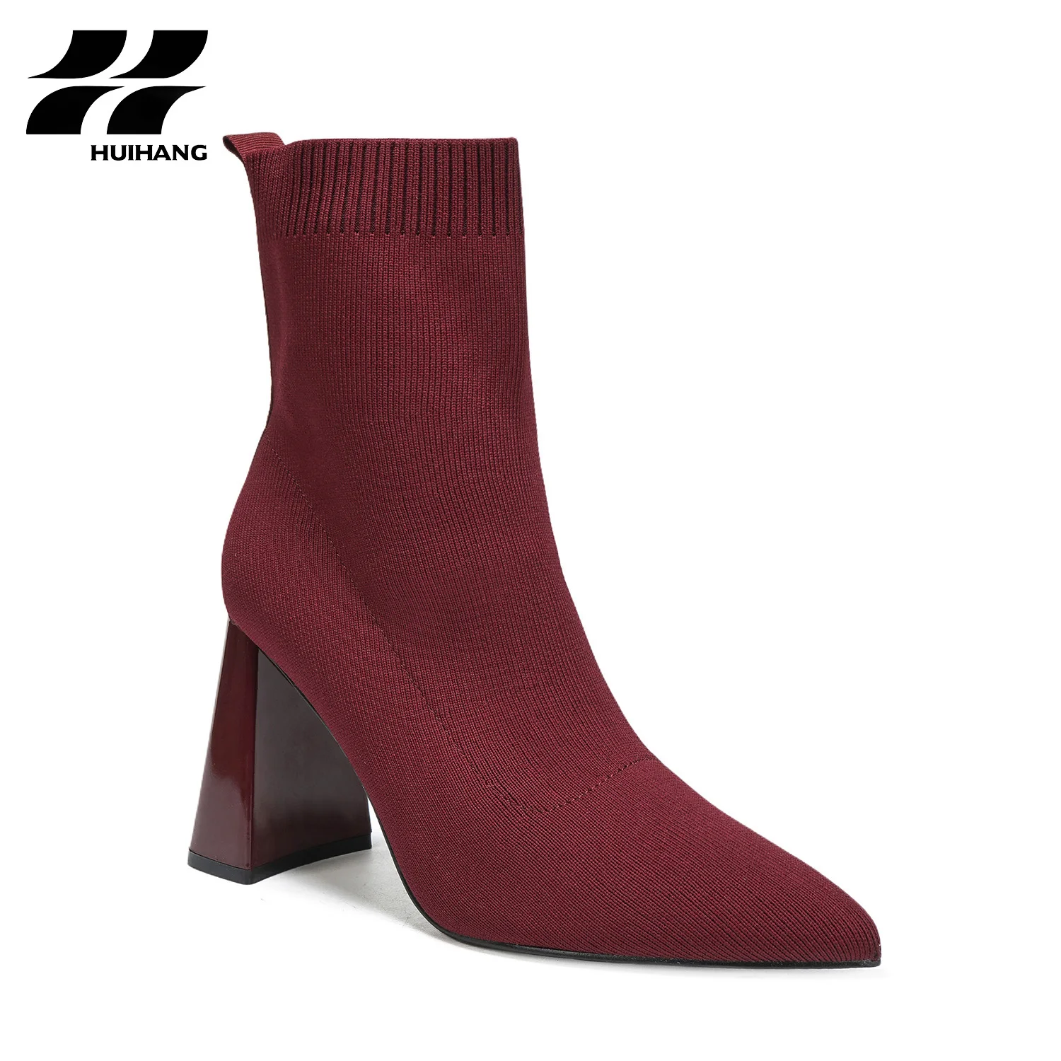 Women's Chic Brown Solid Pattern Block Heel Boots Slip-On Ankle-High Pointed-Toe Design Height Increasing Comfortable for Winter