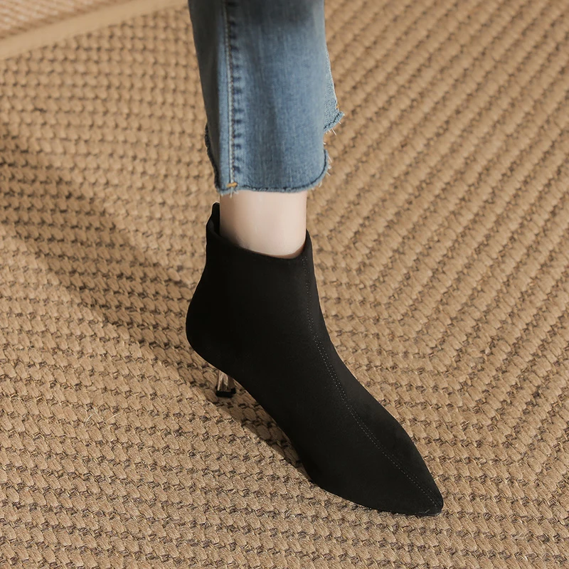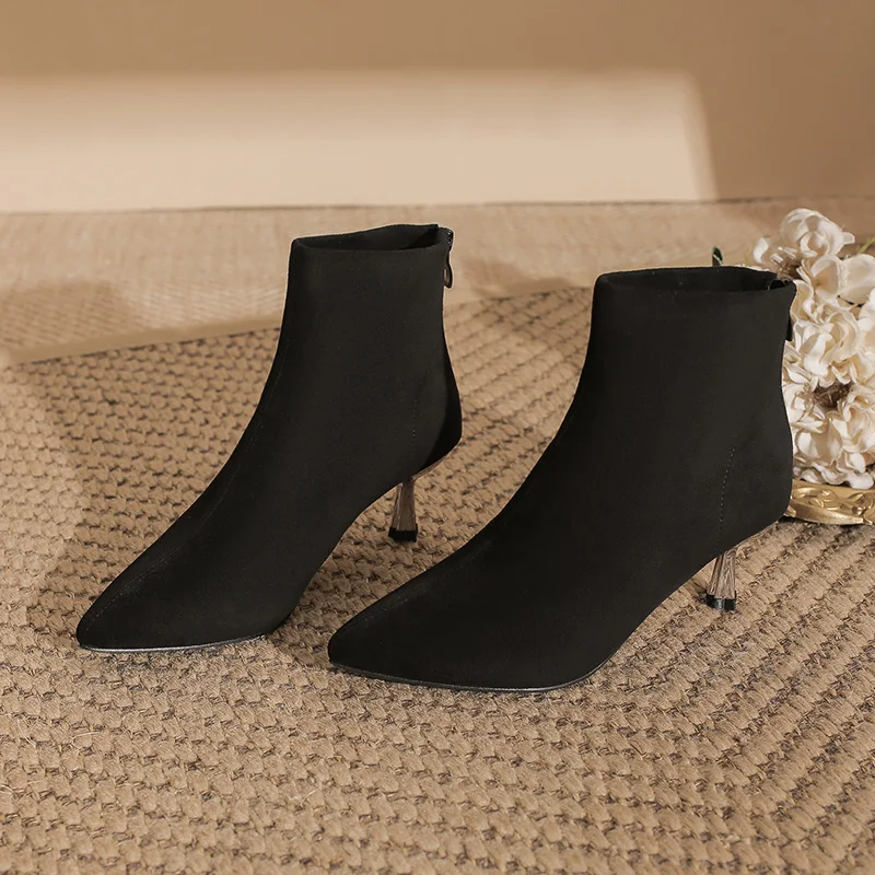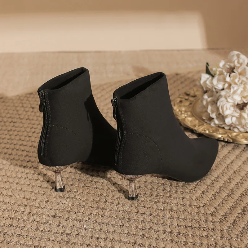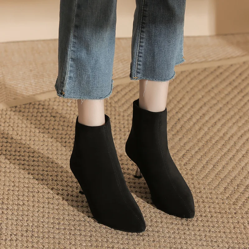 Fashion Black Suede Ankle Boots with Pointed Toe & Metallic Stiletto Heel, 5CM Heel for Autumn & Winter