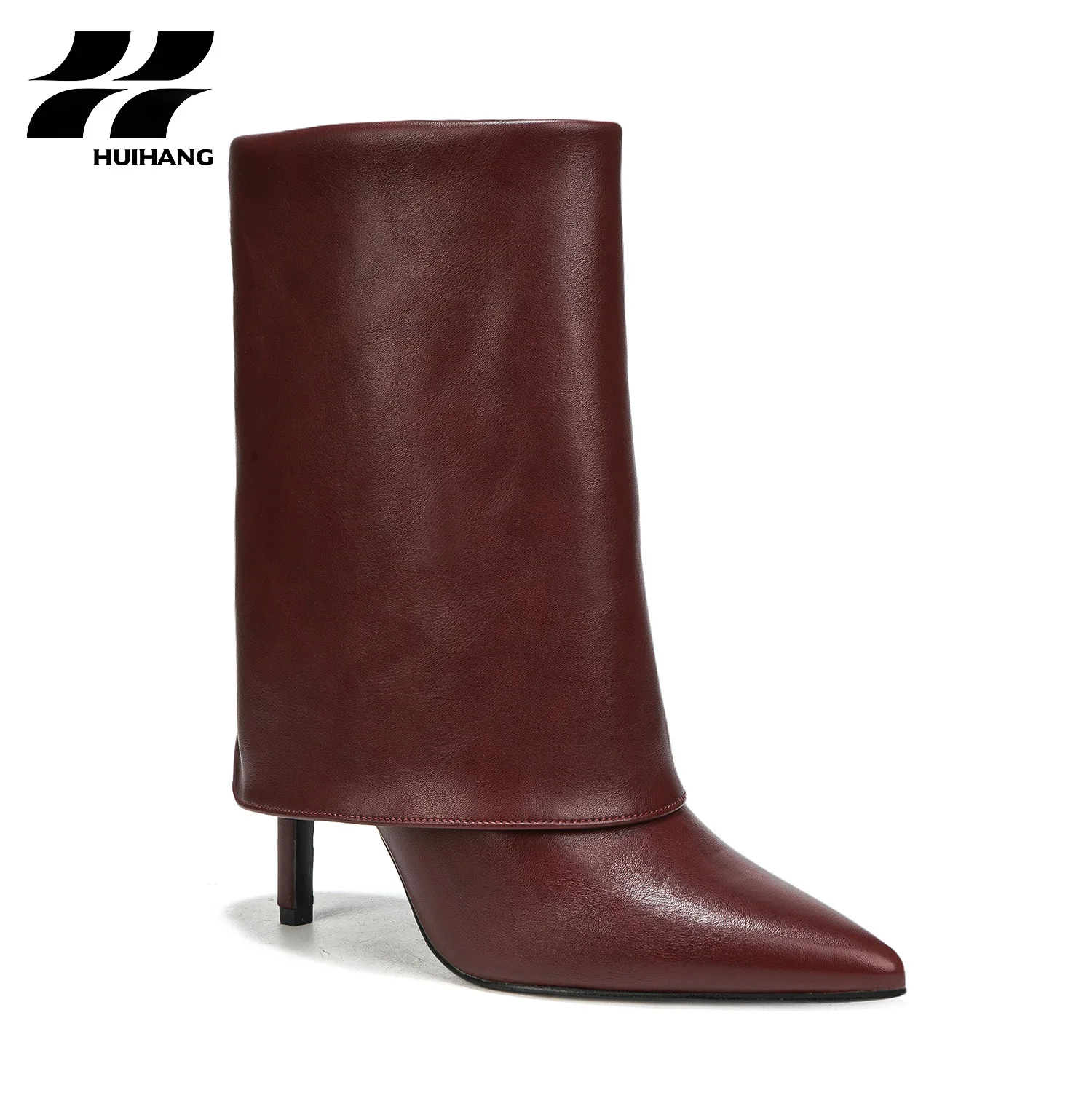 Chic Women's Brown PU Knee-High Pointed-Toe Stiletto Heel Boots Slip-On Ankle Height Increasing with Fold-Over Cuff for Winter