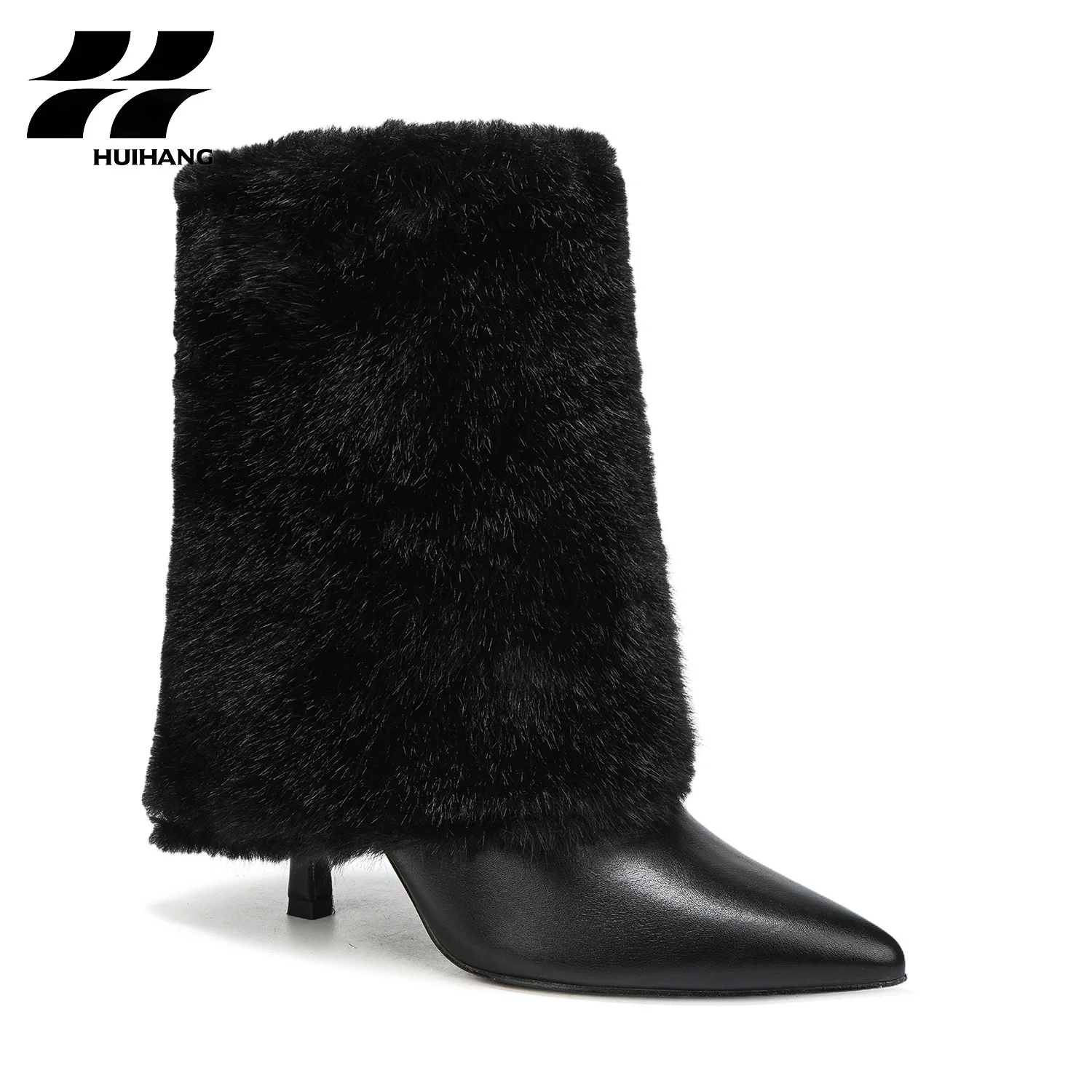 Women's Winter Fashion Ankle-High Stiletto Heel Boots Brown PU Faux Fur Pointed Toe Slip-On Closure Height Increasing High Top