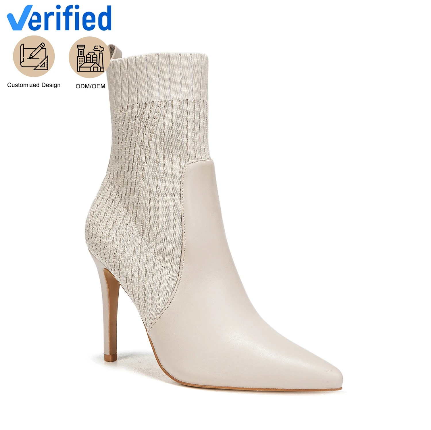 Chic Women's Beige Knit & PU Ankle-High Stiletto Heel Boots Slip-On Winter Style with Comfort & Height Increasing Feature