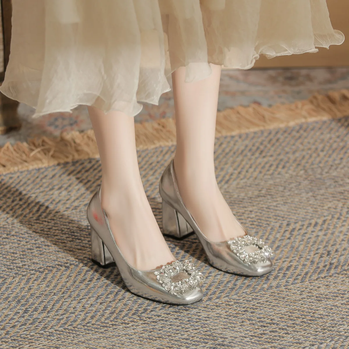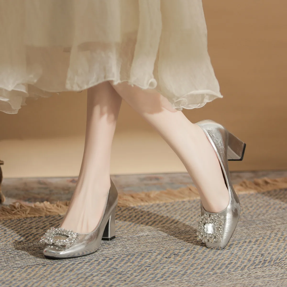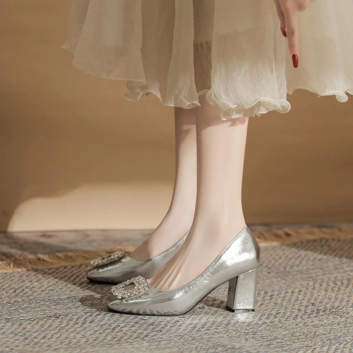 Chic Women's Silver Metallic Microfiber Square Toe Square Heel Pumps Rhinestone Buckle Height Increasing Solid Wedding Shoes