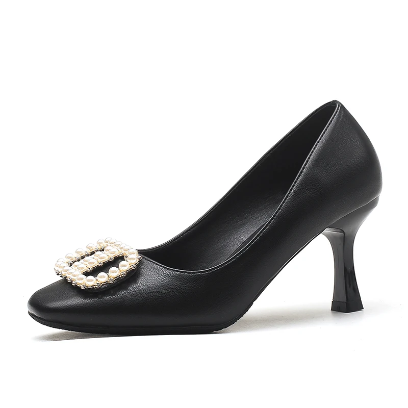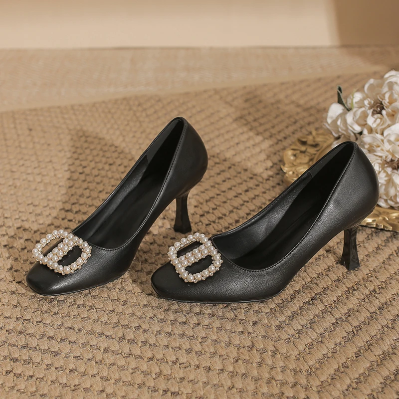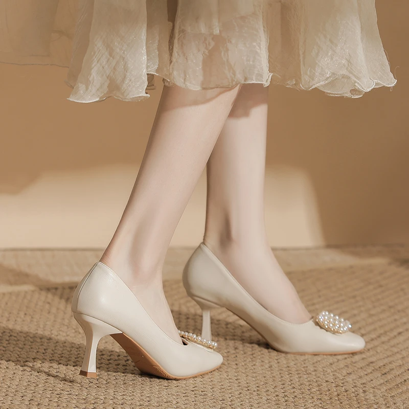 Elegant Ivory Microfiber Round Toe Stiletto Heels with Pearl Buckle, 5CM/7CM Slip-On Club Pumps for Summer