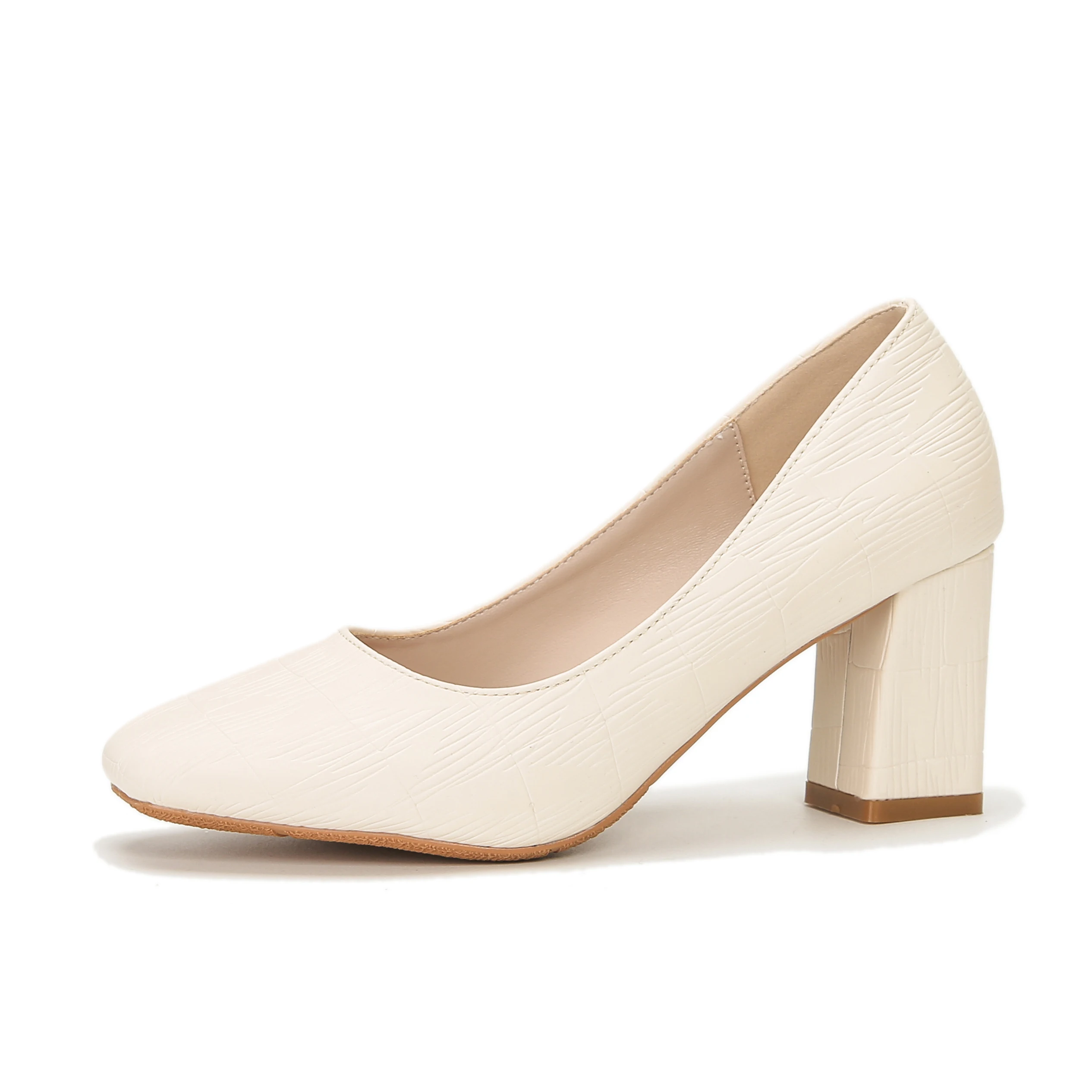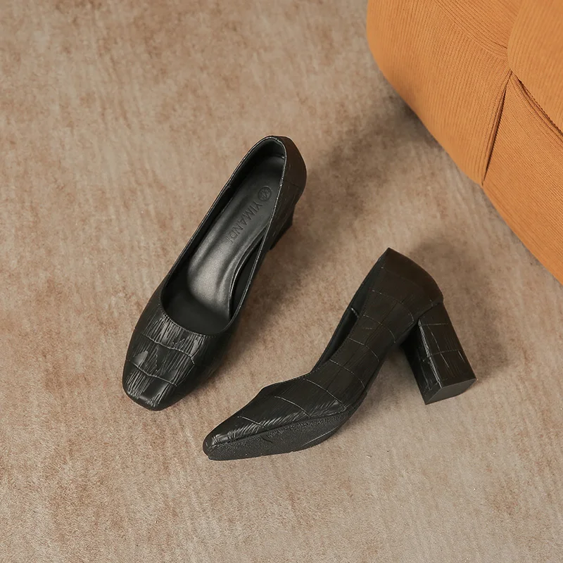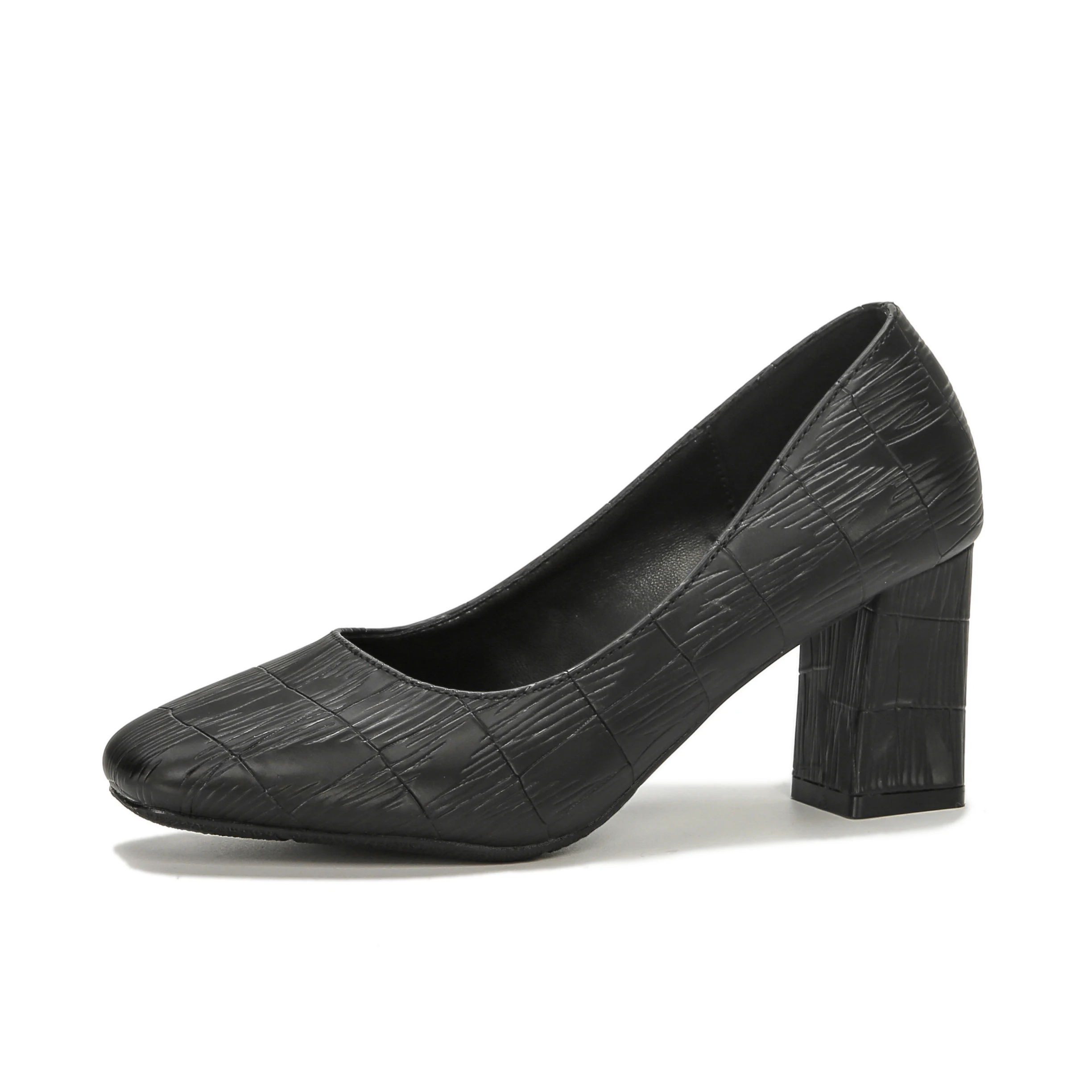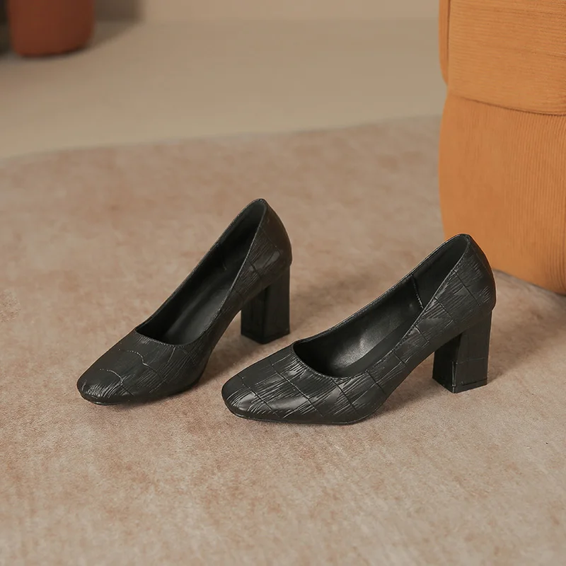 Women's Fashion Black Textured Microfiber Square Heel Office Shoes 7cm Comfort Summer Square Toe Slip-On Pumps