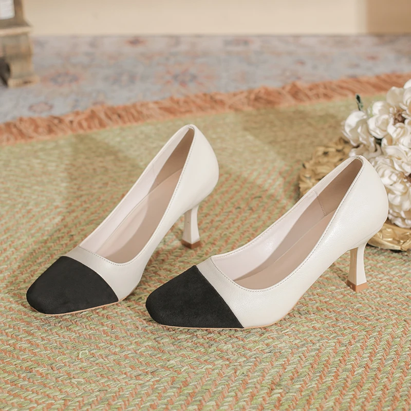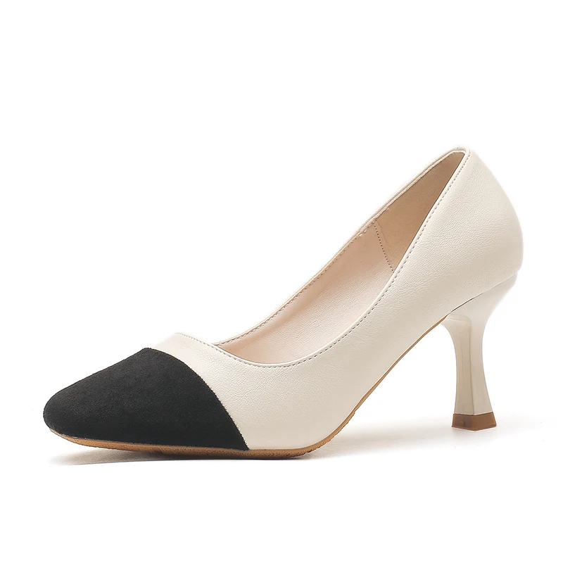 Beige & Black Two-Tone Microfiber Round Toe Stiletto Heels, Slip-On Club Pumps for Summer