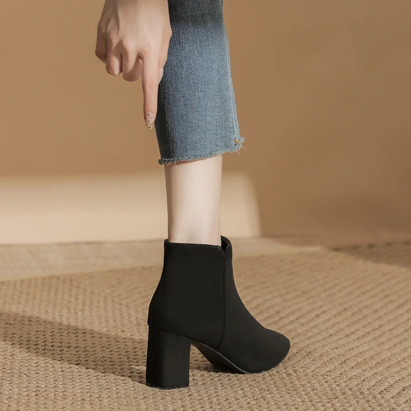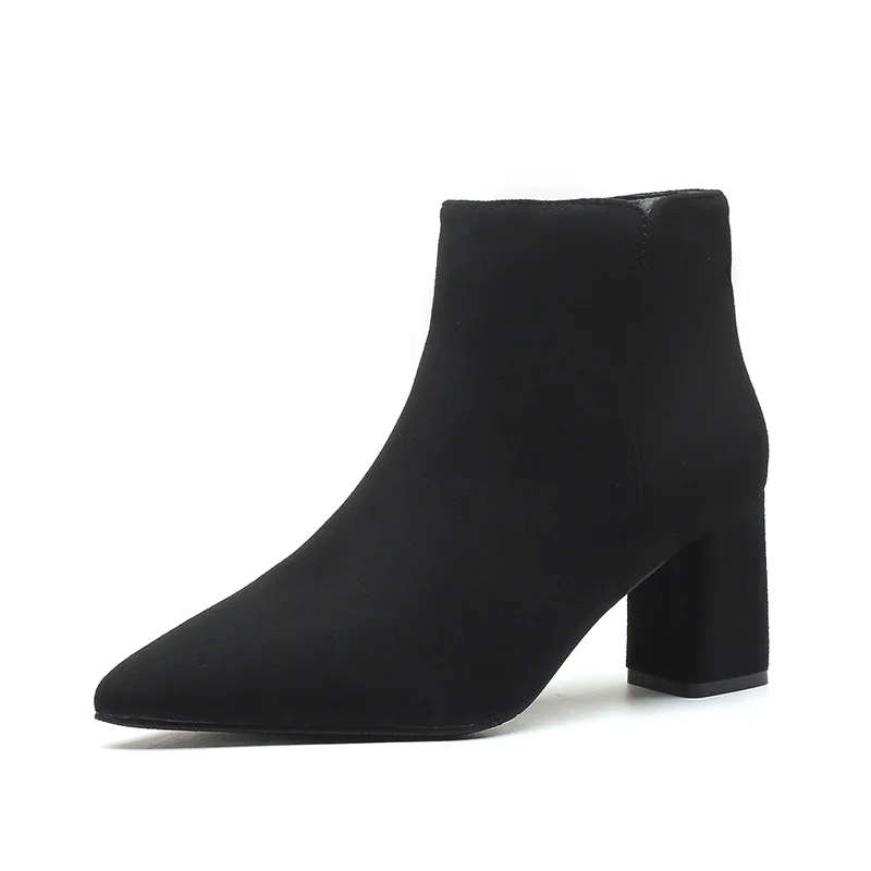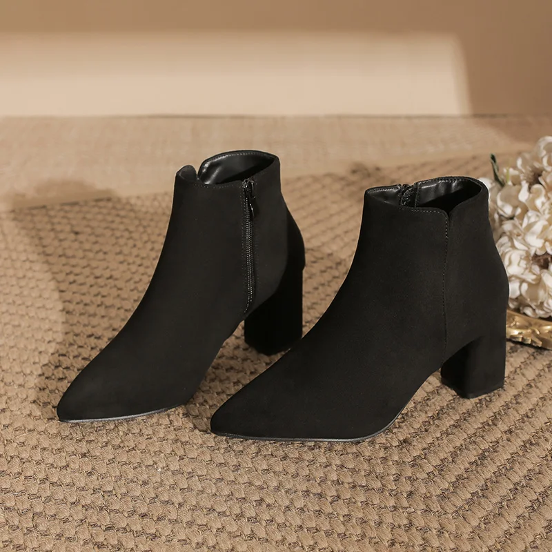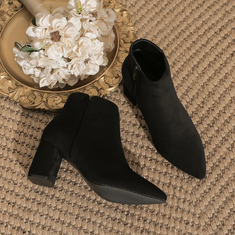 Black Suede Pointed Toe Block Heel Ankle Boots, Side Zipper Winter & Autumn Boots