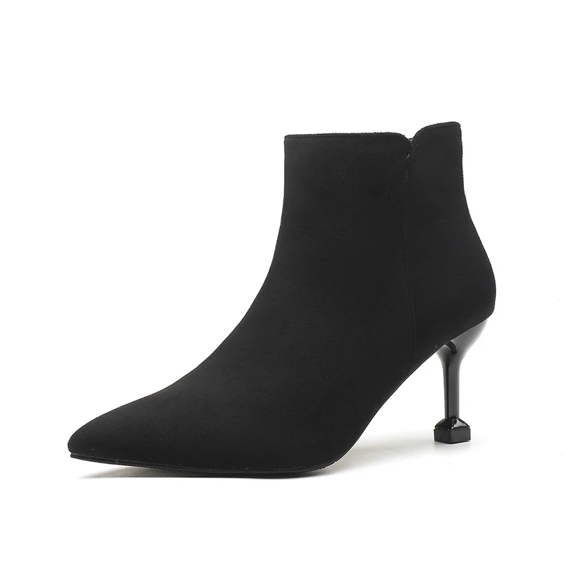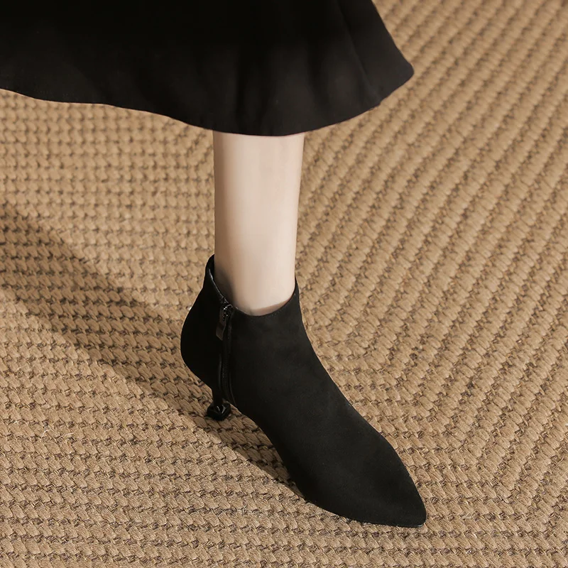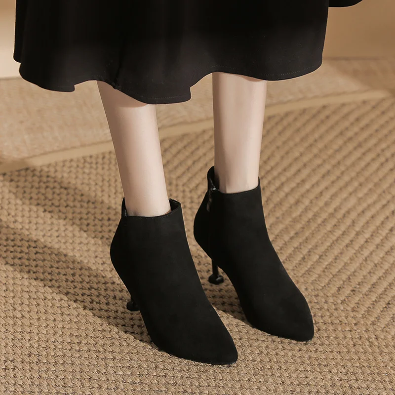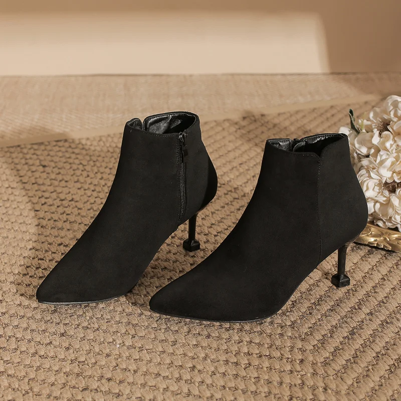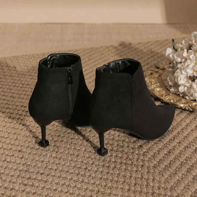 Black Suede Pointed Toe Stiletto Heel Ankle Boots, Back Zipper Winter & Autumn Boots