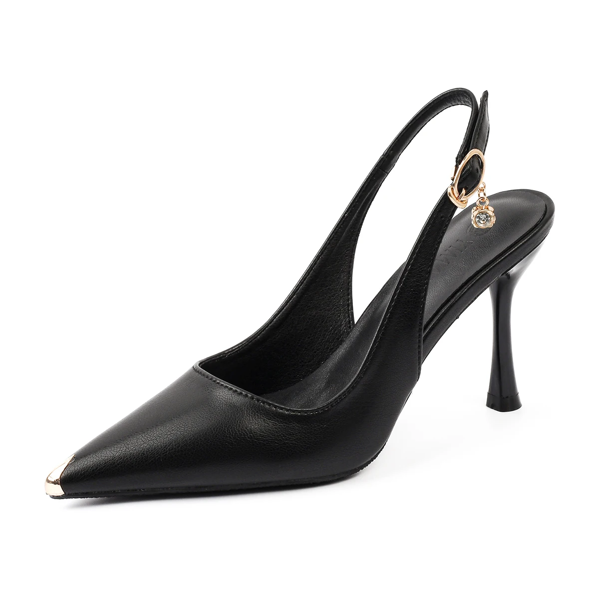 Black Microfiber Pointed Toe Stiletto Heel Slingback Sandals, 8.5CM Heel with Crystal Charm for Summer