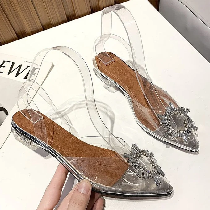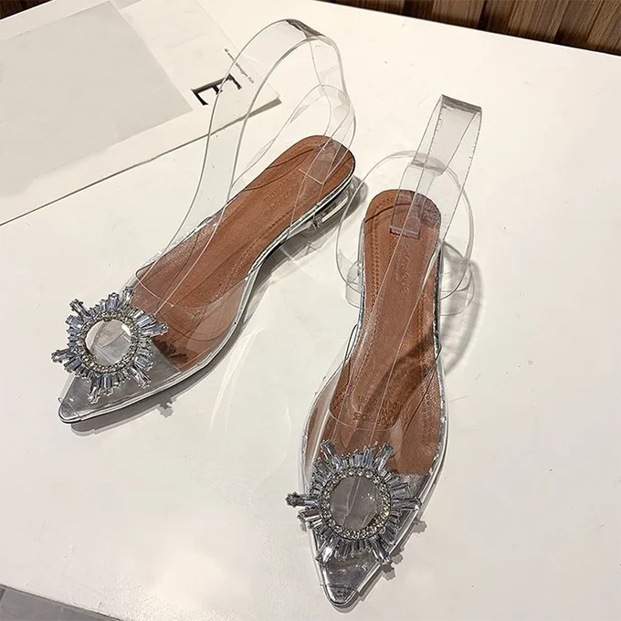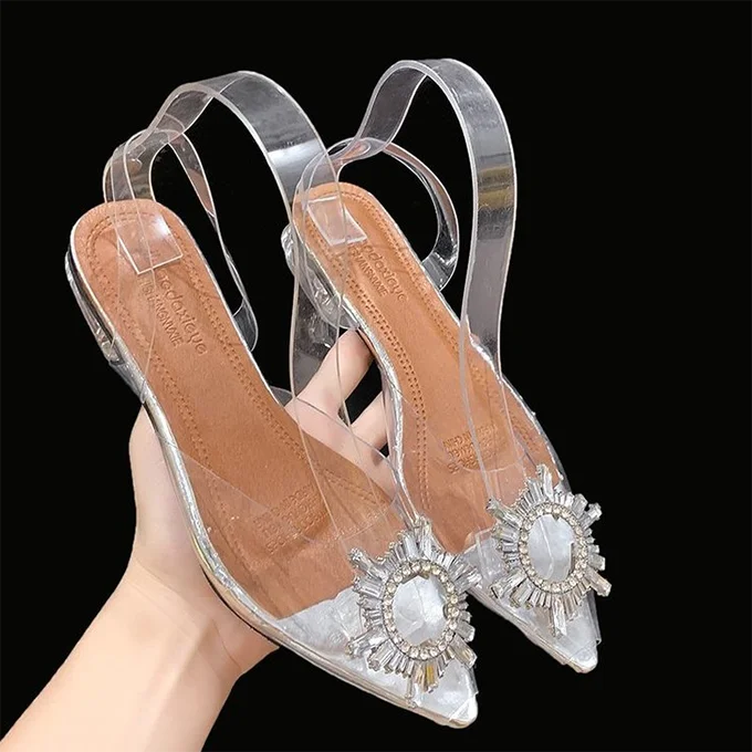 Wholesale Big Size PVC Transparent Crystal Heel Flat Ladies Clear Slides Low Heel Sandals for Women and Ladies Wedding Shoes