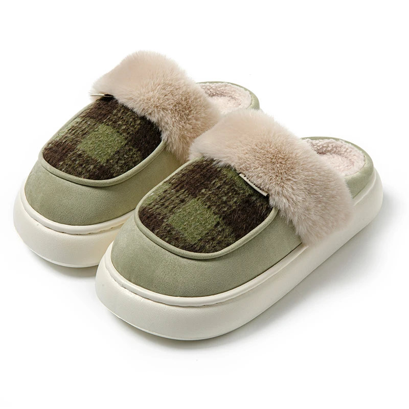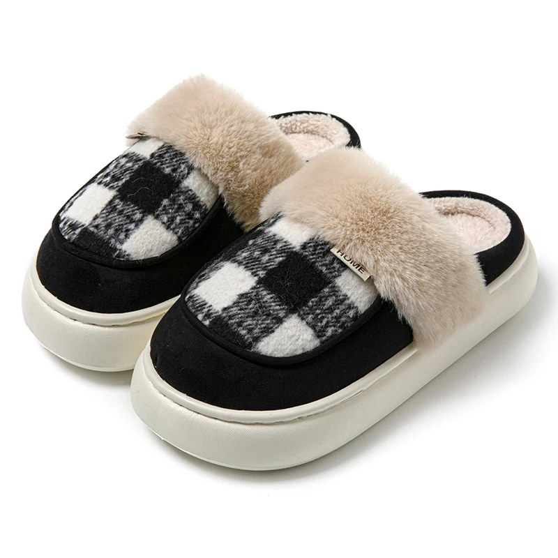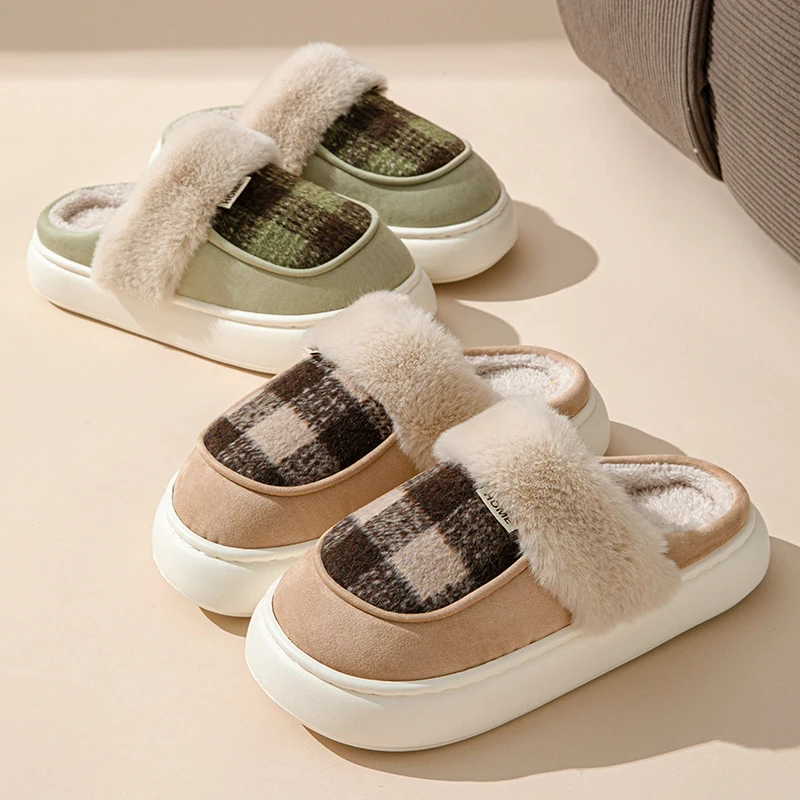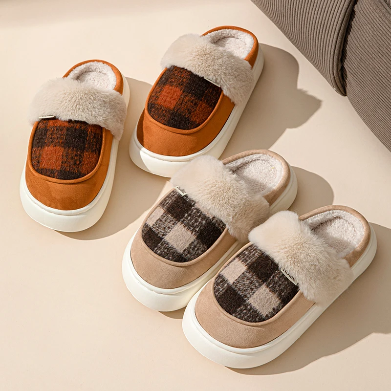 Couple's Comfortable Indoor Winter for Slippers Stylish Thick Plush Home Waterproof Closed-Toe Design Plaid Anti-Slippery
