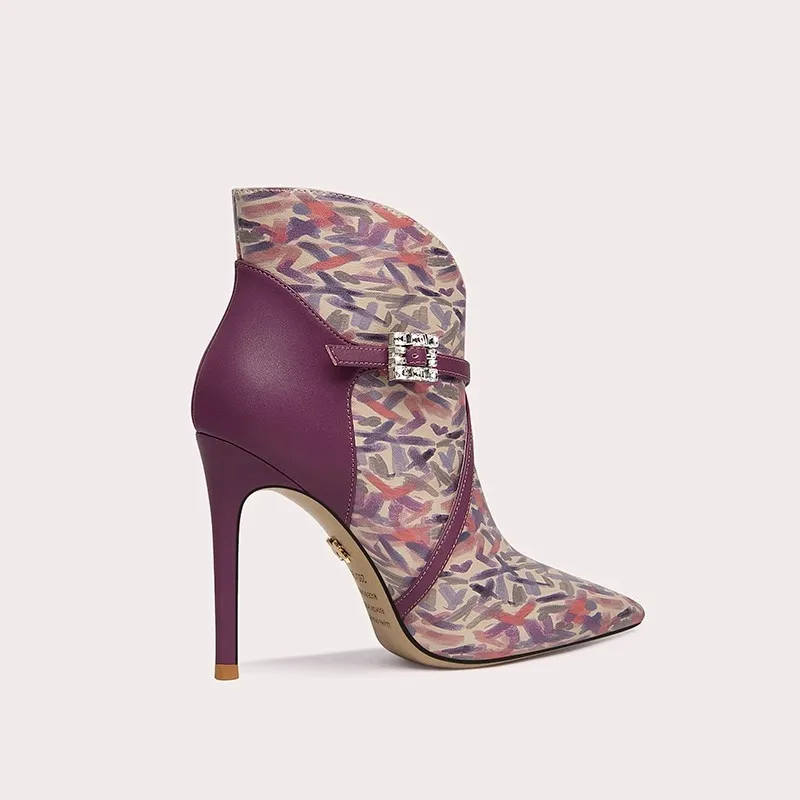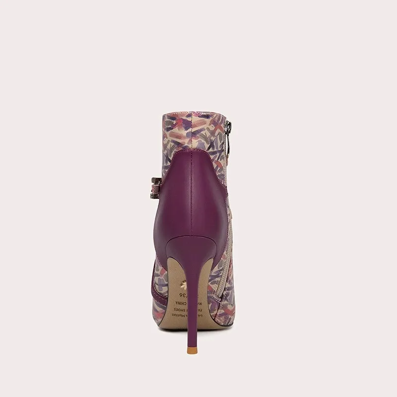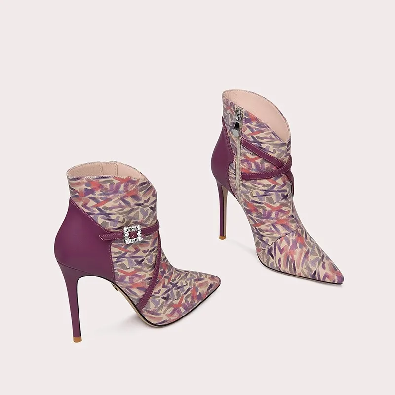 Women's Elegant Purple Printed Patchwork Ankle Boots Stiletto Heel Boots Pointed Toe Zip Closure Boots for Winter