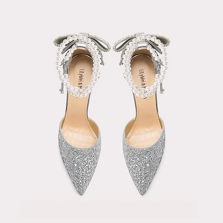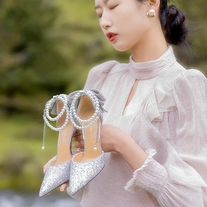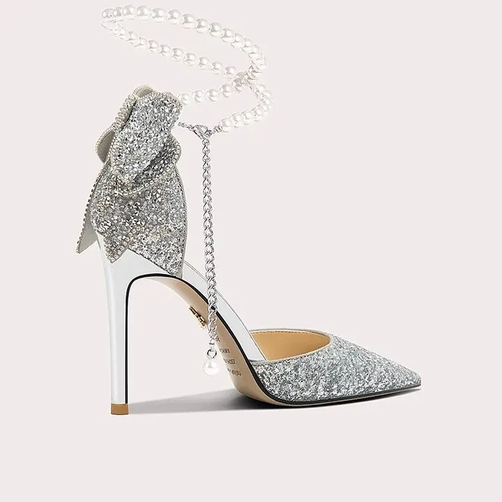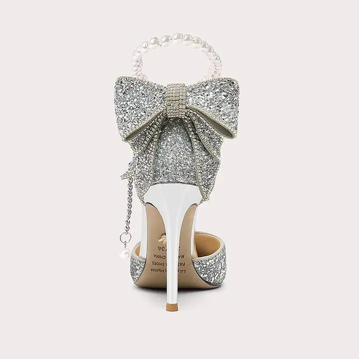 Women's New Pointed Shallow Mouth Sequin Bow High Heels for Summer Outdoor Pearl Single-Layer Stiletto Solid Color Design