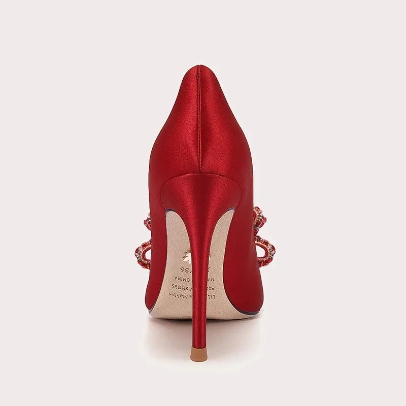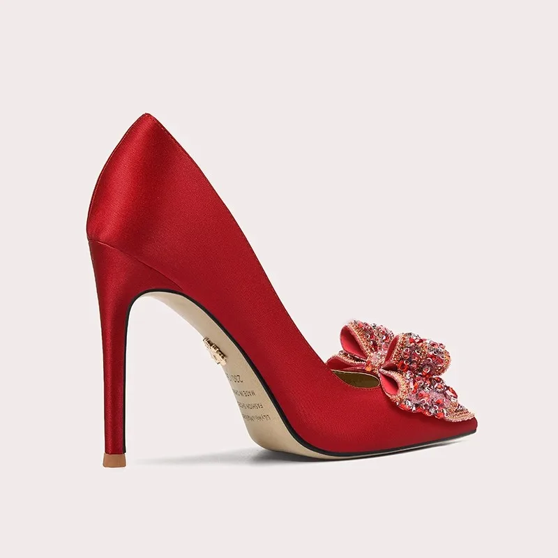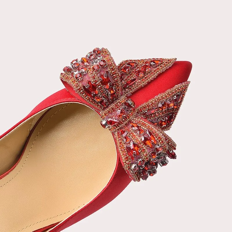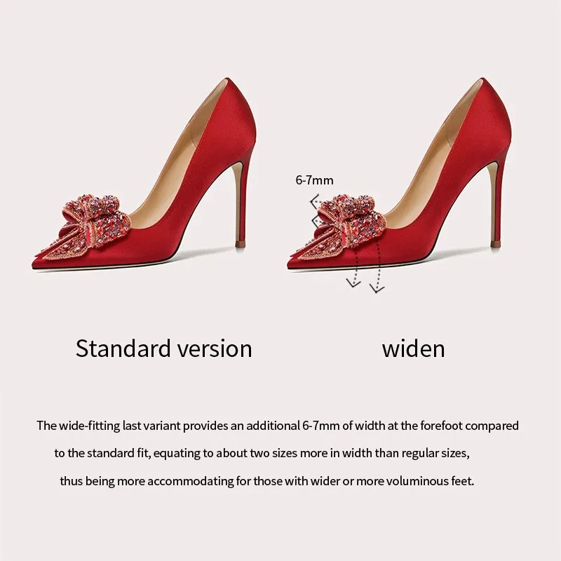 Lily Wei Red Satin Luster Texture Wedding Shoes Women's Satin Pointed Toe Crystal Bow Multi-scene Evening Bridal Pumps