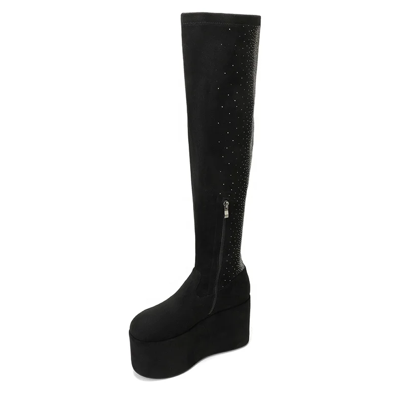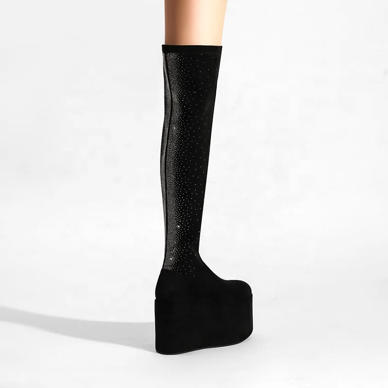 Custom Over-the-Knee Thigh High Boots Black Platform Wedge with Rhinestones Zip Closure Height Increasing for Autumn Winter