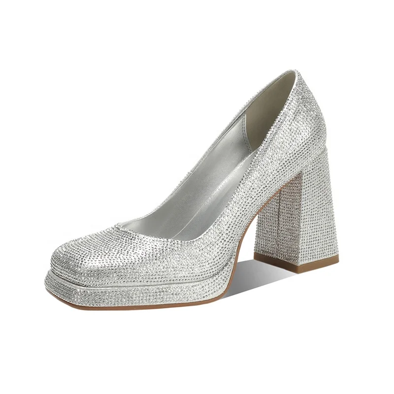 Moncheer Women's Glitter Block Heel Pumps Square Toe Platform High Heels Rhinestones for Party Evening Wear Mary Jane Pumps