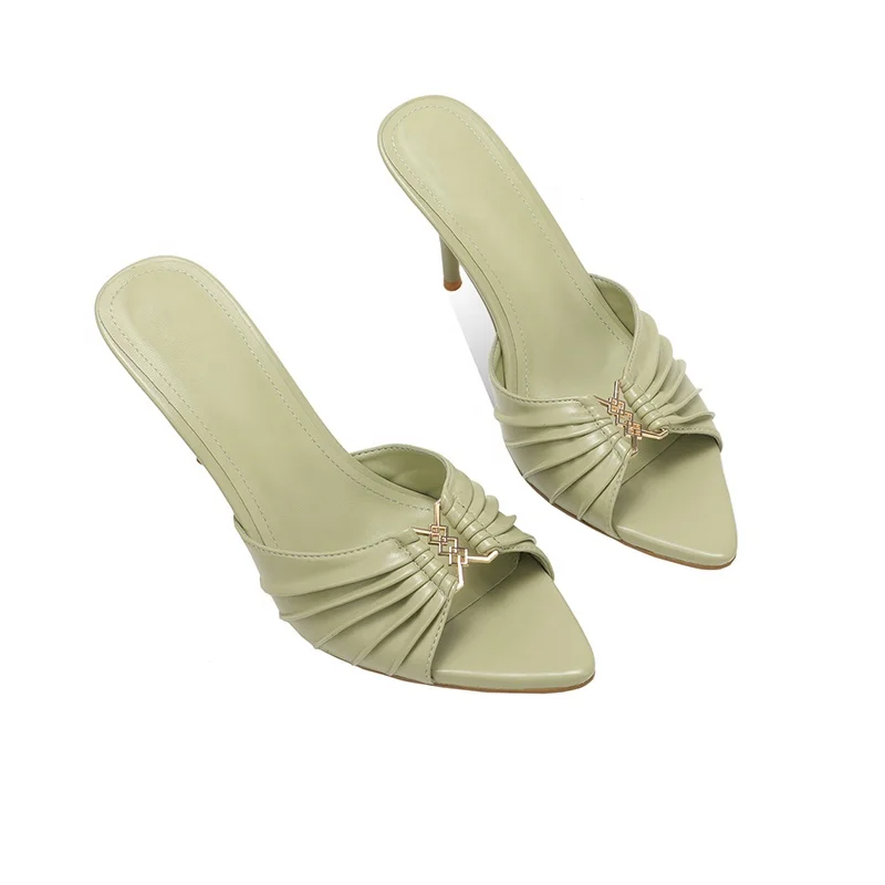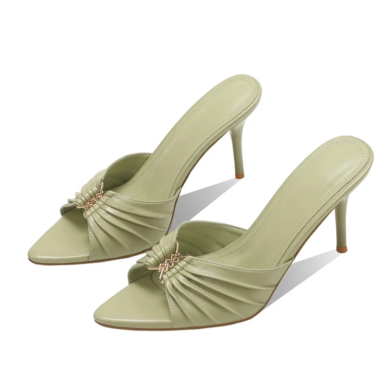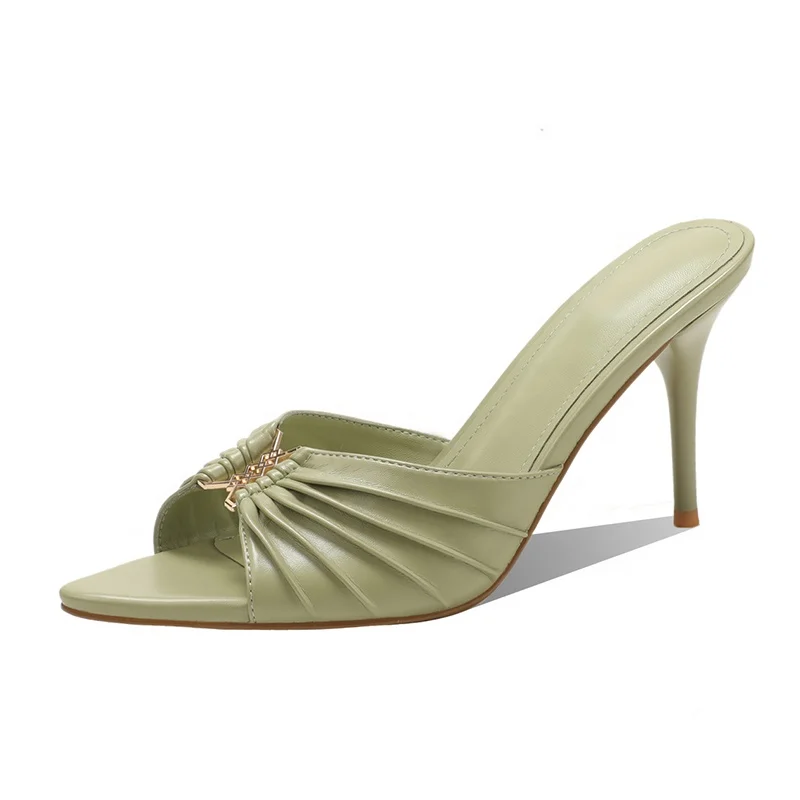 Moncheer Summer Women's Sage Green Stiletto Heel Mules Pleated Open Toe Slip-on Sandals Sexy Barefoot Height Increasing Design
