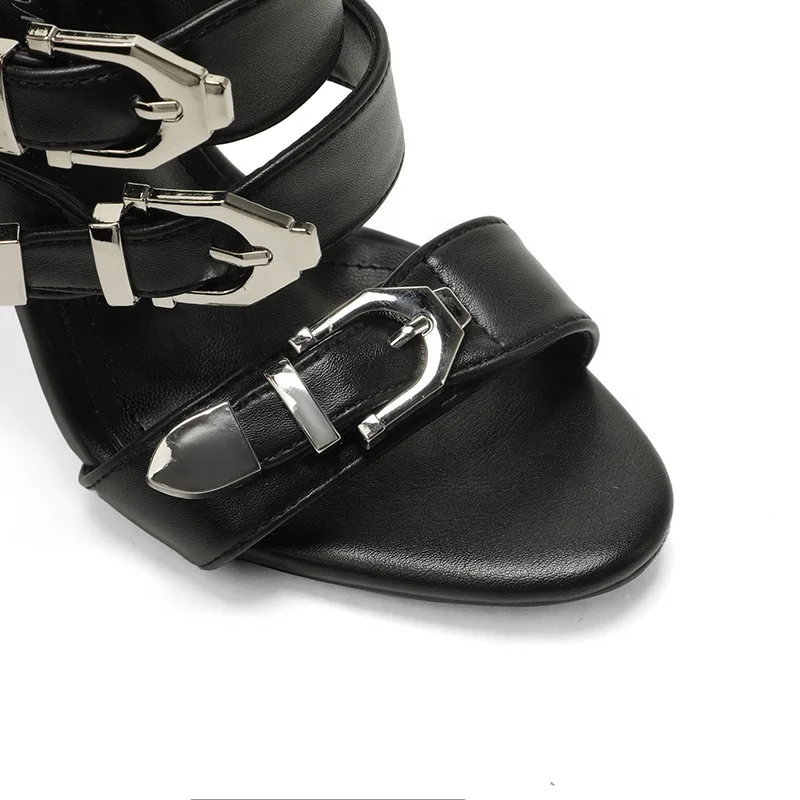 Moncheer Women's Black Stiletto Heel Sandals Multi-Buckle Strappy High Heels with Zipper Back for Sexy Dance Shoes for Winter