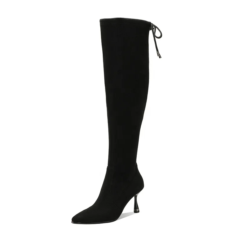 Moncheer Women's Stretch Suede Knee-High Boots Pointed Toe Slim Fit Stiletto Heel Long Boots with Back Tie