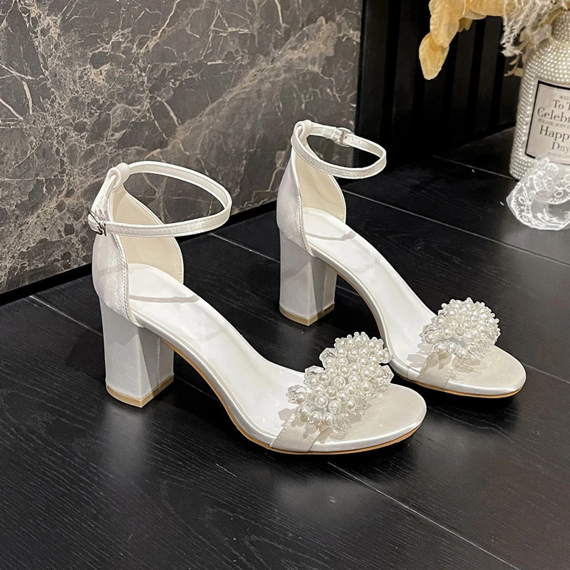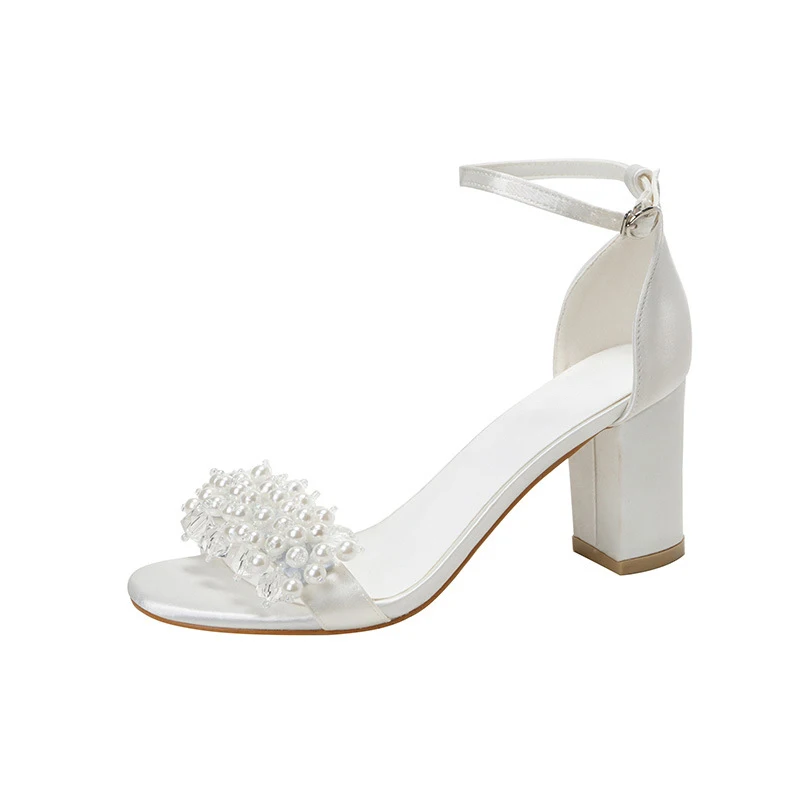 Customized Women Bridal Satin Leather Chunky Heeled Sandals Lady White Pearls Wedding Shoes for Women High Heels Shoes for Women